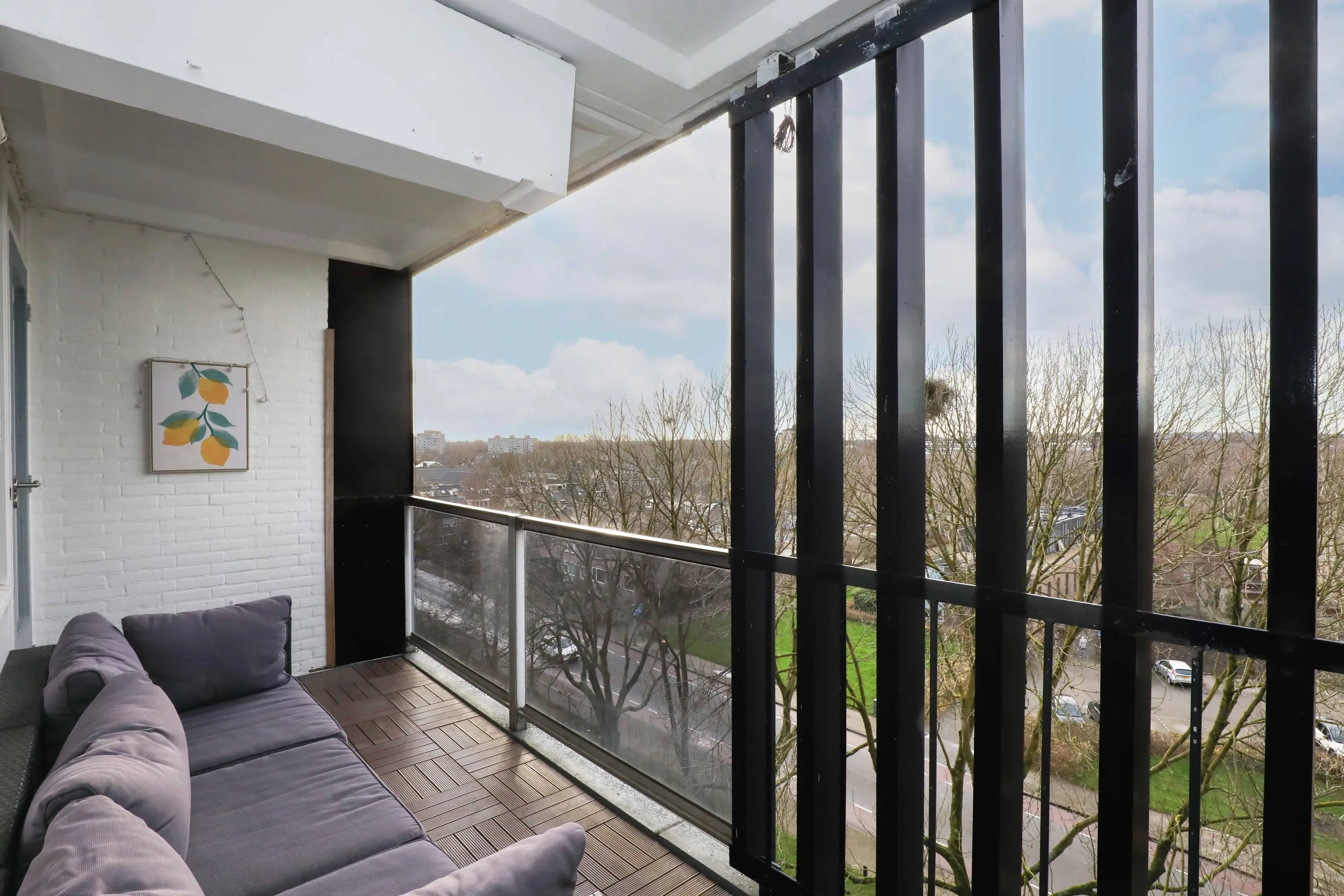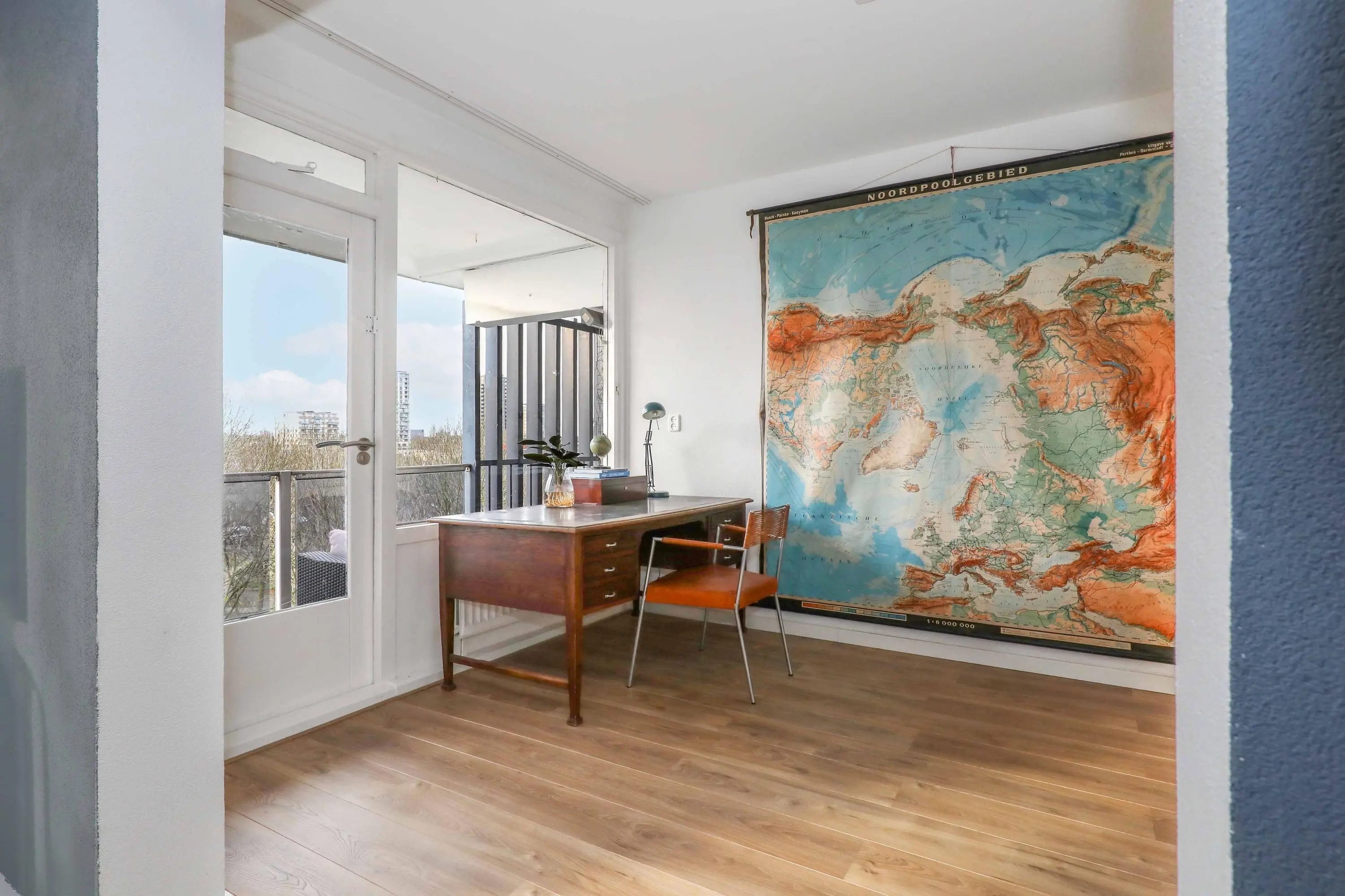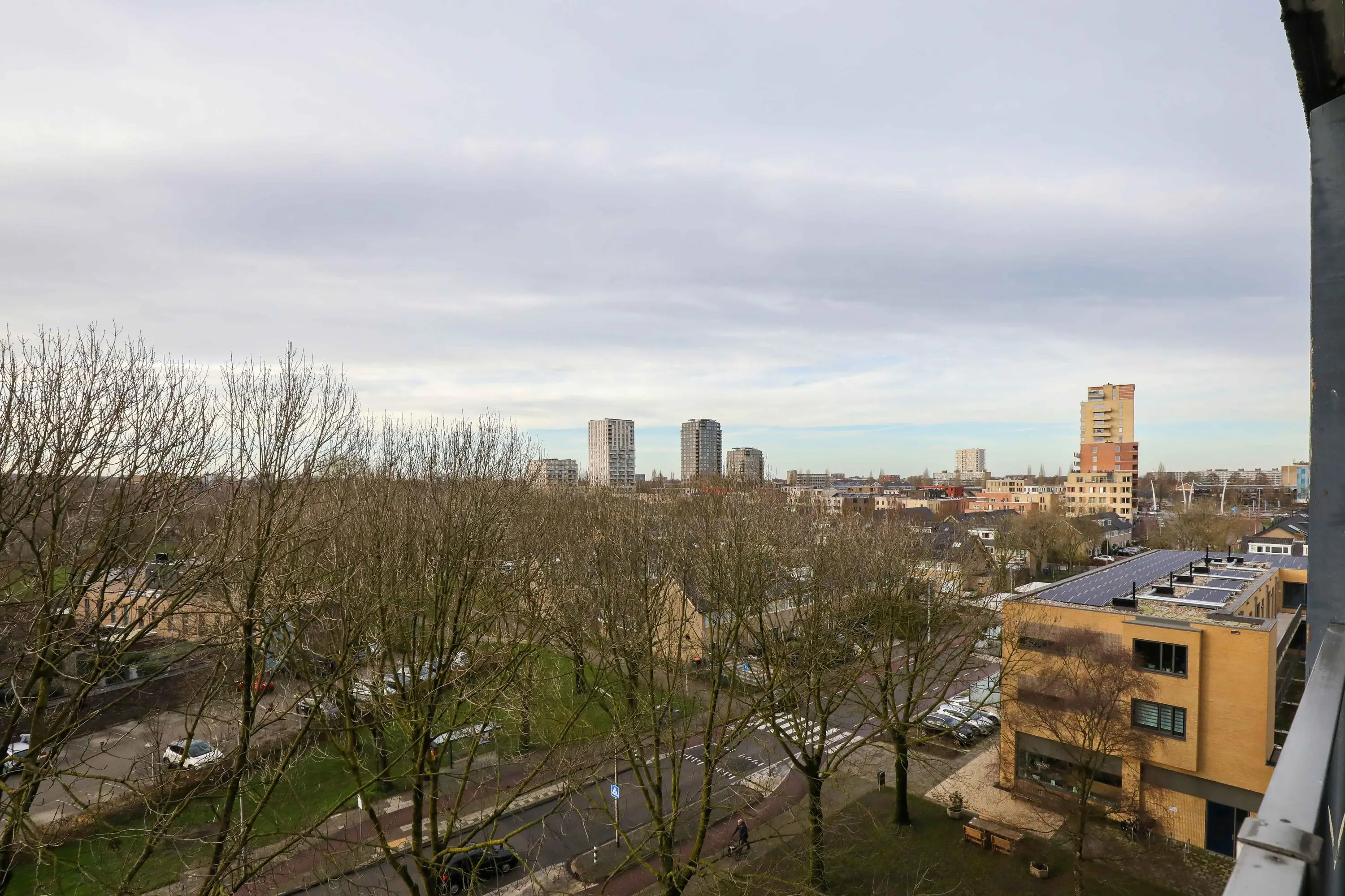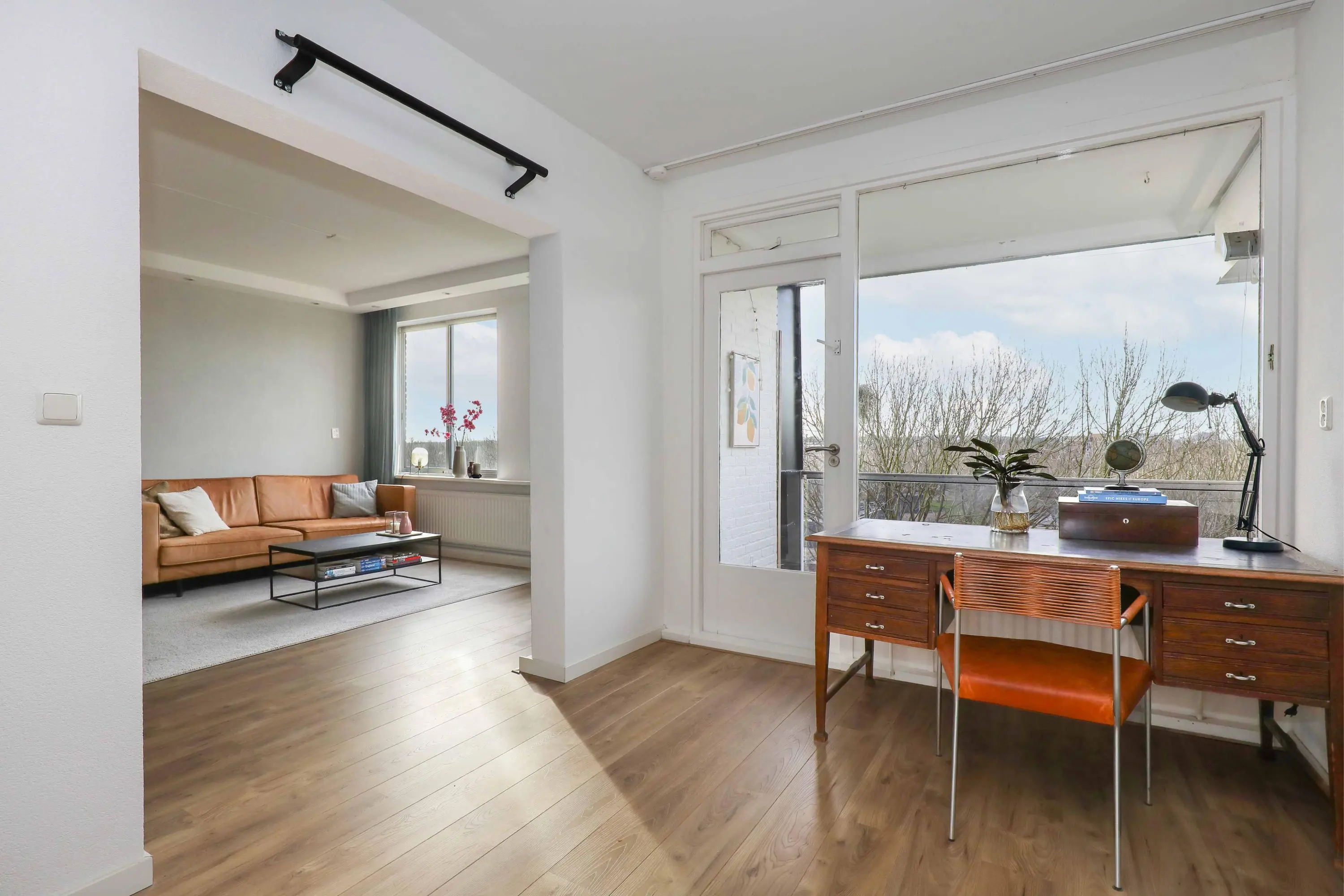 6e verdieping: entree/hal met meterkast, vaste kasten, toiletruimte, toegang tot twee in grootte variërende slaapkamers aan de achterzijde van het gebouw en een keurige badkamer (2019) v.v. inloopdouche en wastafelmeubel. Aan de voorzijde van het gebouw bevindt zich de ruime, dichte keuken (2019) v.v. diverse inbouwapparatuur en met toegang tot het balkon. Tevens vanuit de hal bereikbaar en aan de voorzijde van het gebouw gelegen, is de royale en lichte woonkamer met doorgang naar de ruimte die nu in gebruik is als werkkamer met praktische vaste kastenwand, maar ook goed kan dienen als eetkamer of derde slaapkamer. Vanuit hier is ook het balkon bereikbaar. Het balkon is breed en gelegen op het zuidwesten. Hier bevindt zich een vaste kast v.v. C.V.-opstelling.