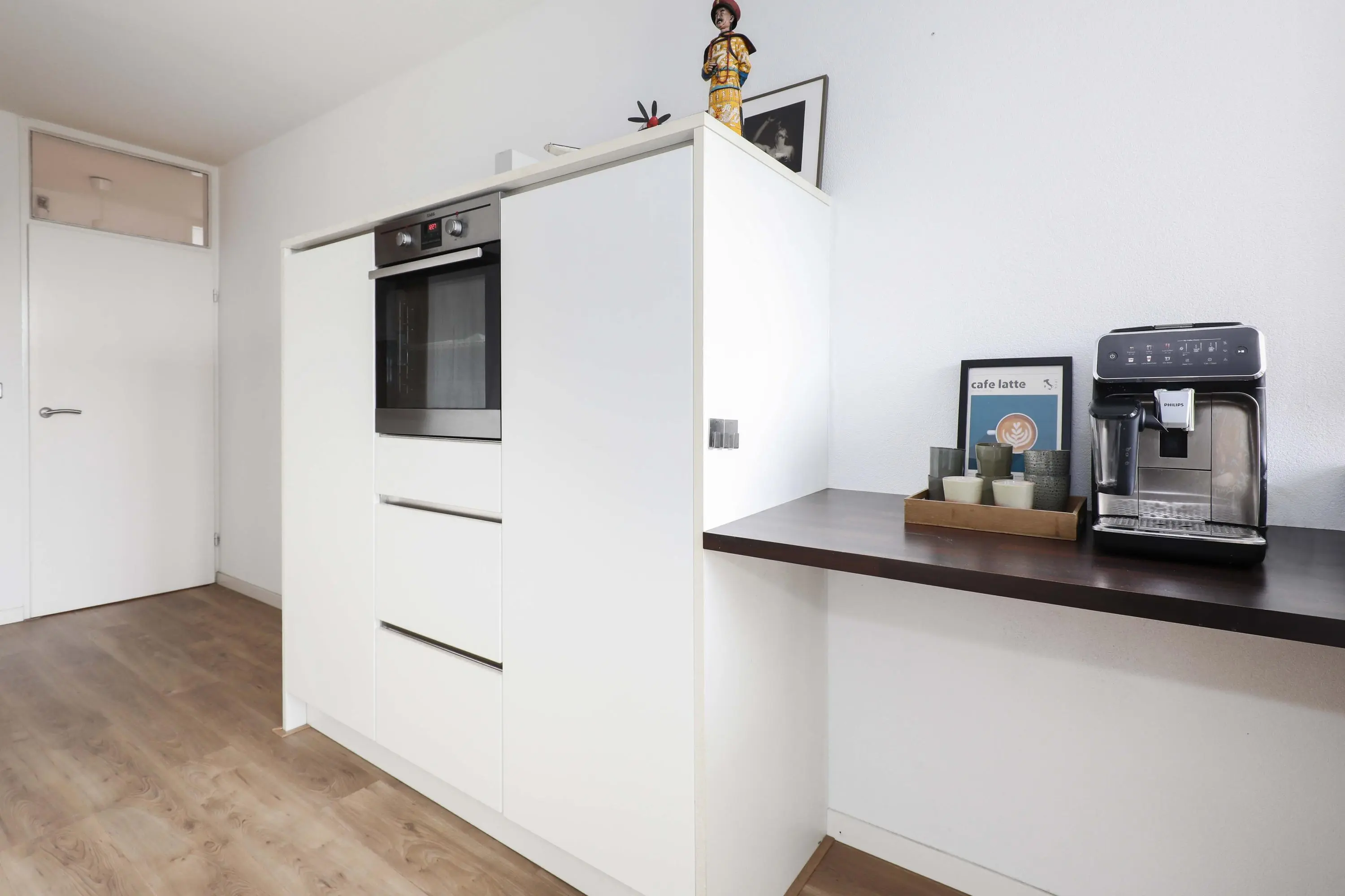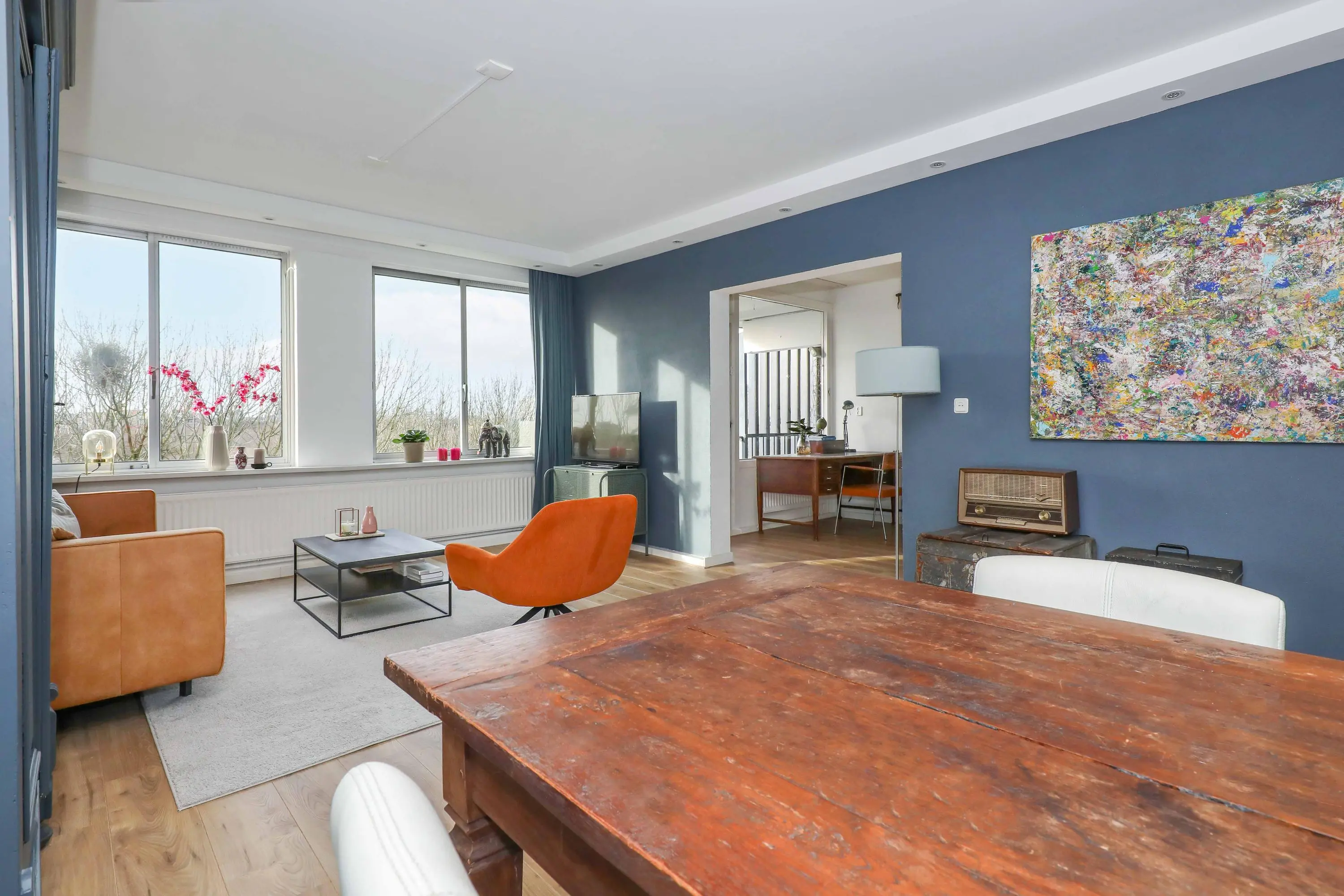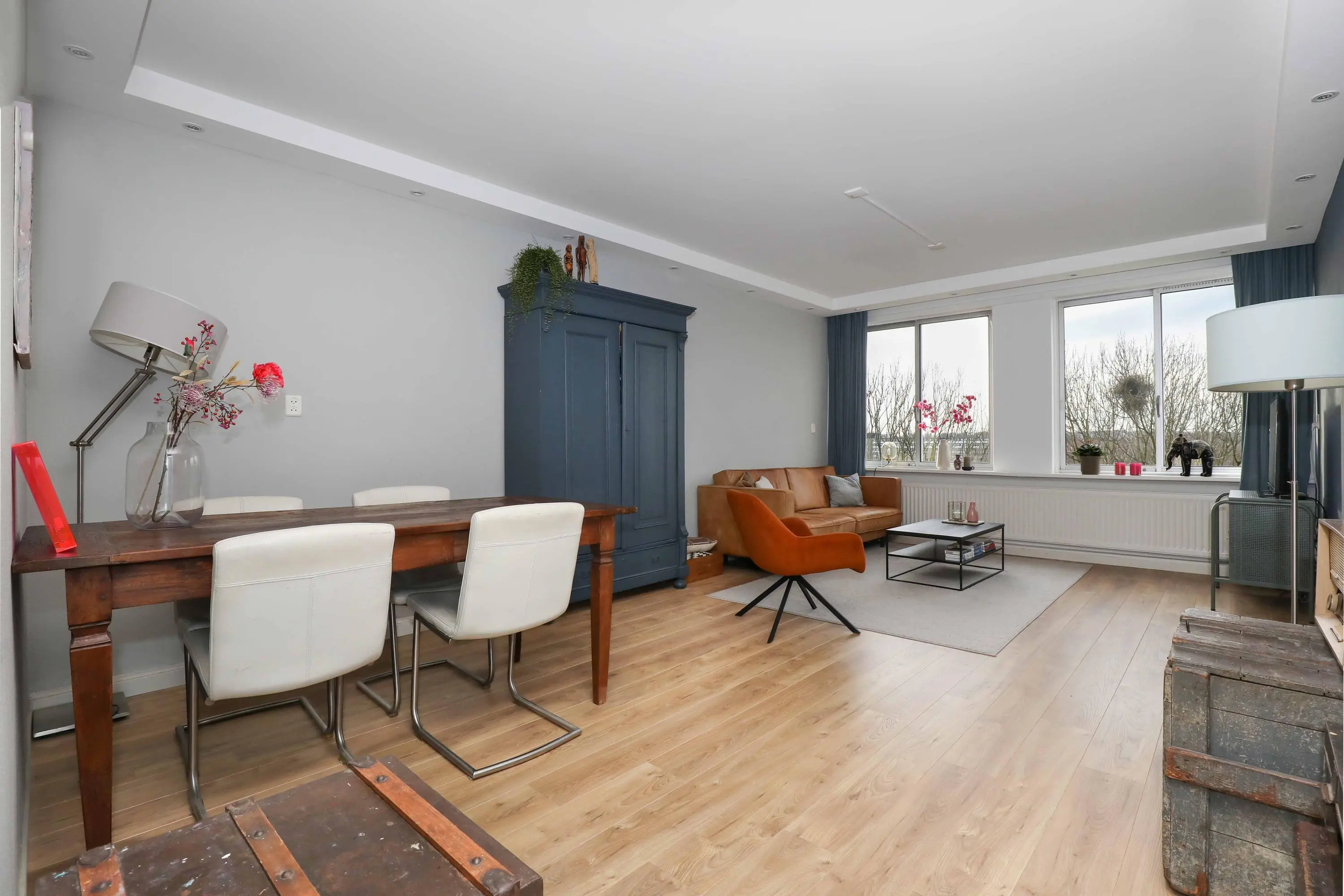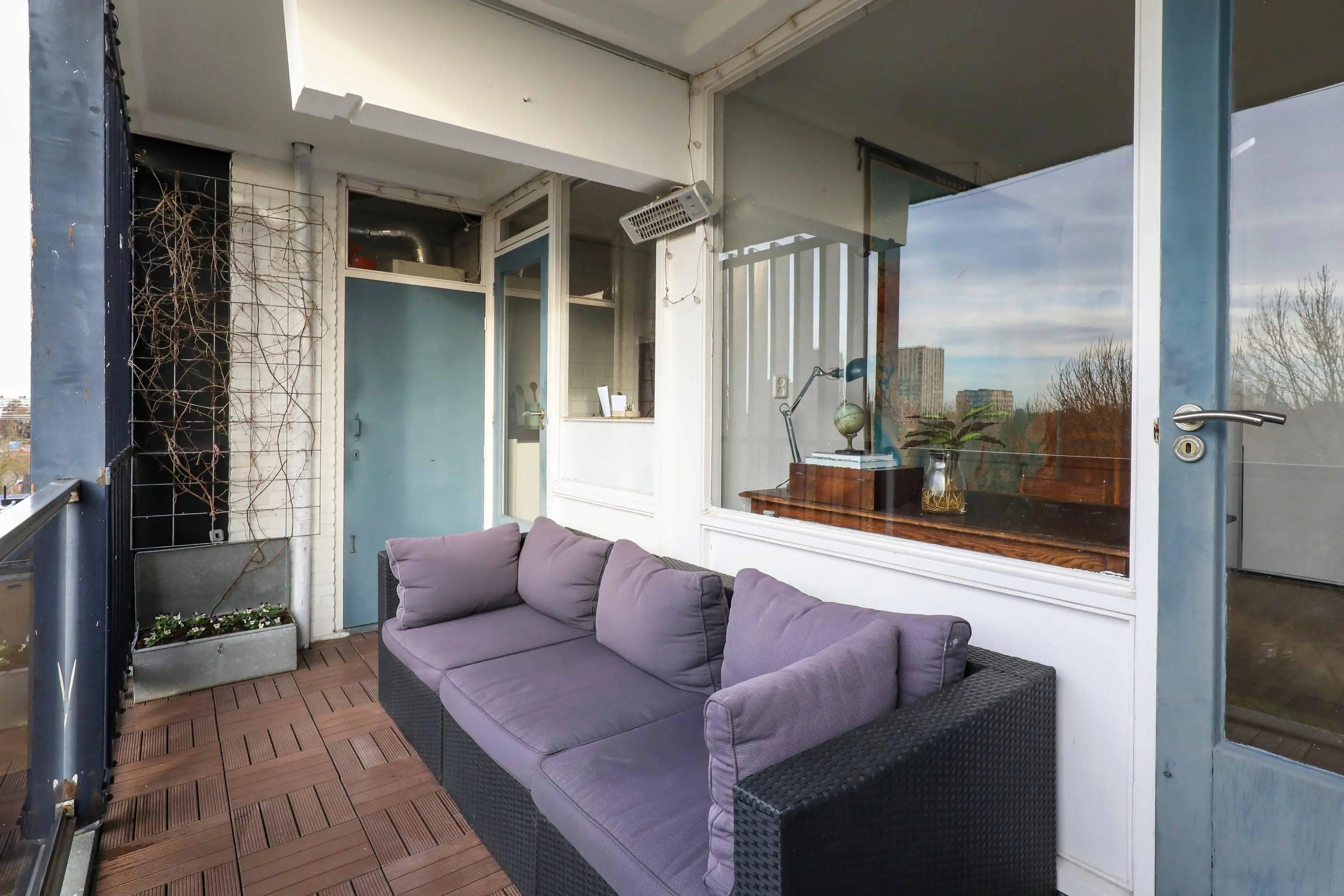 6e verdieping: entree/hal met meterkast, vaste kasten, toiletruimte, toegang tot twee in grootte variërende slaapkamers aan de achterzijde van het gebouw en een keurige badkamer (2019) v.v. inloopdouche en wastafelmeubel. Aan de voorzijde van het gebouw bevindt zich de ruime, dichte keuken (2019) v.v. diverse inbouwapparatuur en met toegang tot het balkon. Tevens vanuit de hal bereikbaar en aan de voorzijde van het gebouw gelegen, is de royale en lichte woonkamer met doorgang naar de ruimte die nu in gebruik is als werkkamer met praktische vaste kastenwand, maar ook goed kan dienen als eetkamer of derde slaapkamer. Vanuit hier is ook het balkon bereikbaar. Het balkon is breed en gelegen op het zuidwesten. Hier bevindt zich een vaste kast v.v. C.V.-opstelling.