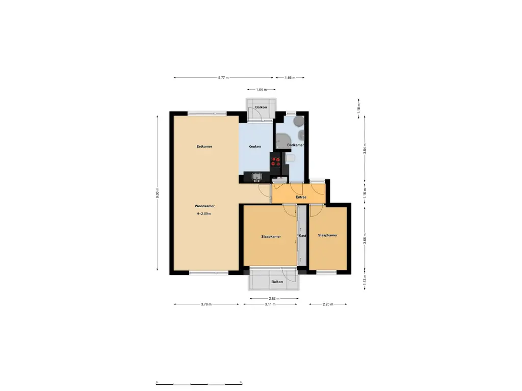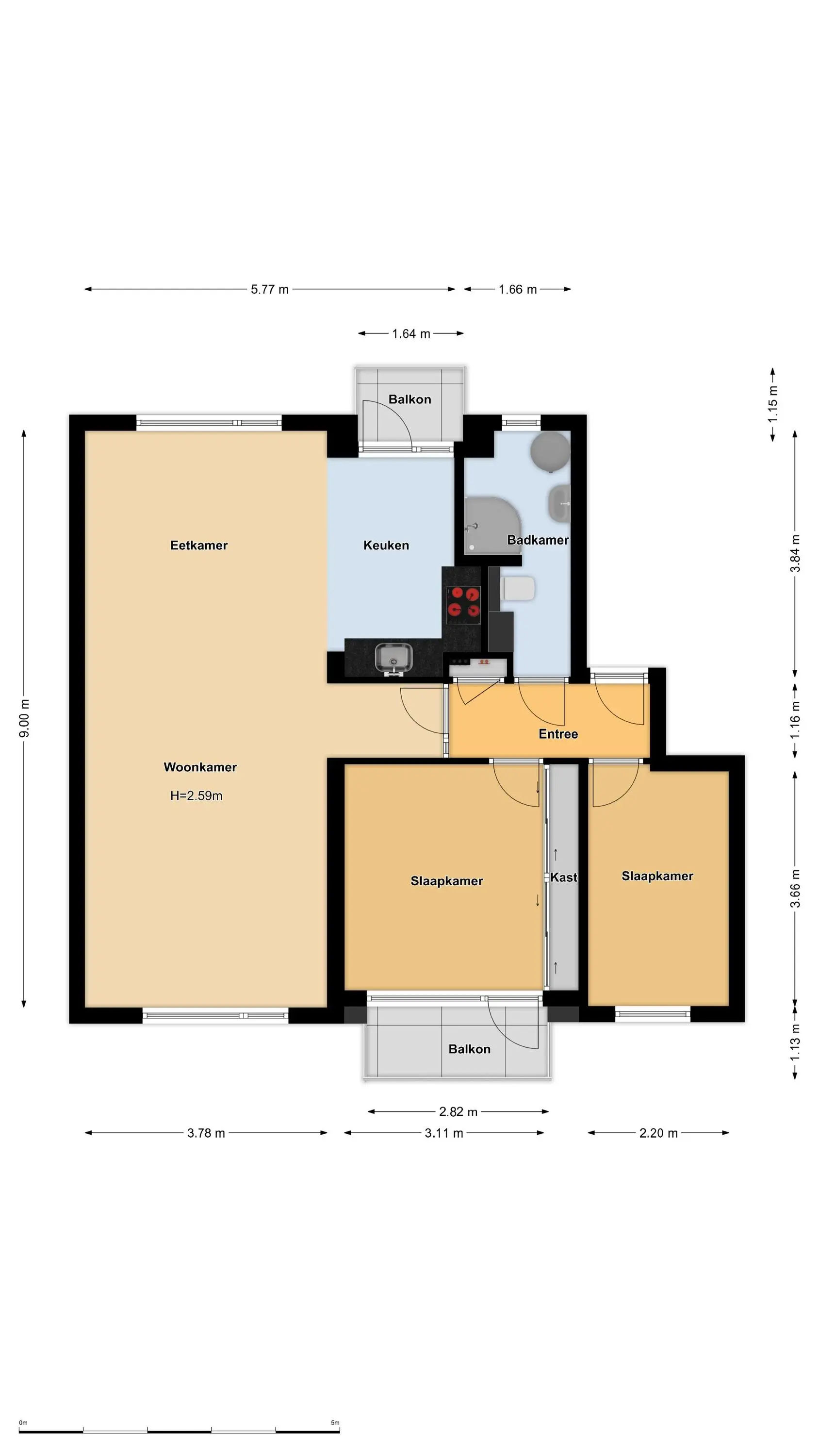 Entree/hal met meterkast en toegang tot twee in grootte variërende slaapkamers aan de voorzijde waarvan één met praktische vaste kastenwand en toegang tot het balkon aan de voorzijde (ZO). Aan de achterzijde bereik je via de hal de nette badkamer v.v. toilet, douchecabine, wastafelmeubel, aansluiting voor wasmachine en elektrische boiler (voor warm water). Aan het einde van de hal bereik je de ruime en lichte doorzonwoonkamer. De raampartijen aan beide zijden van het appartement zorgen voor het nodige daglicht en geven een prettig weids uitzicht. Er is voldoende ruimte voor een zitkamer en een royale eettafel. De leefruimte heeft een open verbinding met de nette keuken aan de achterzijde welke beschikt over een inductiekookplaat, afzuigkap, oven, vaatwasser, spoelbak en praktisch eiland met extra bergruimte. Vanuit de keuken is tevens het tweede balkon aan de achterzijde te bereiken (NW).