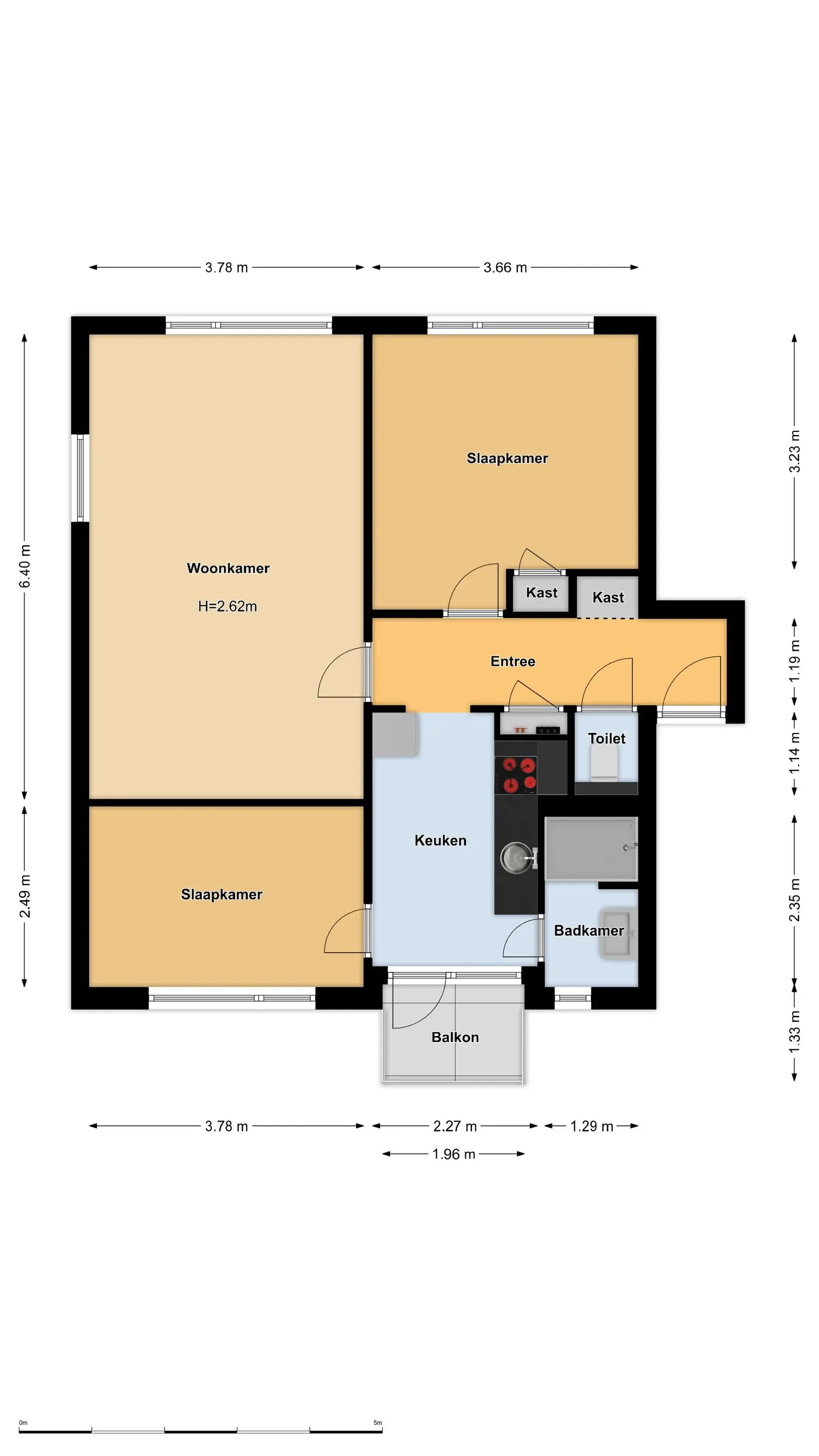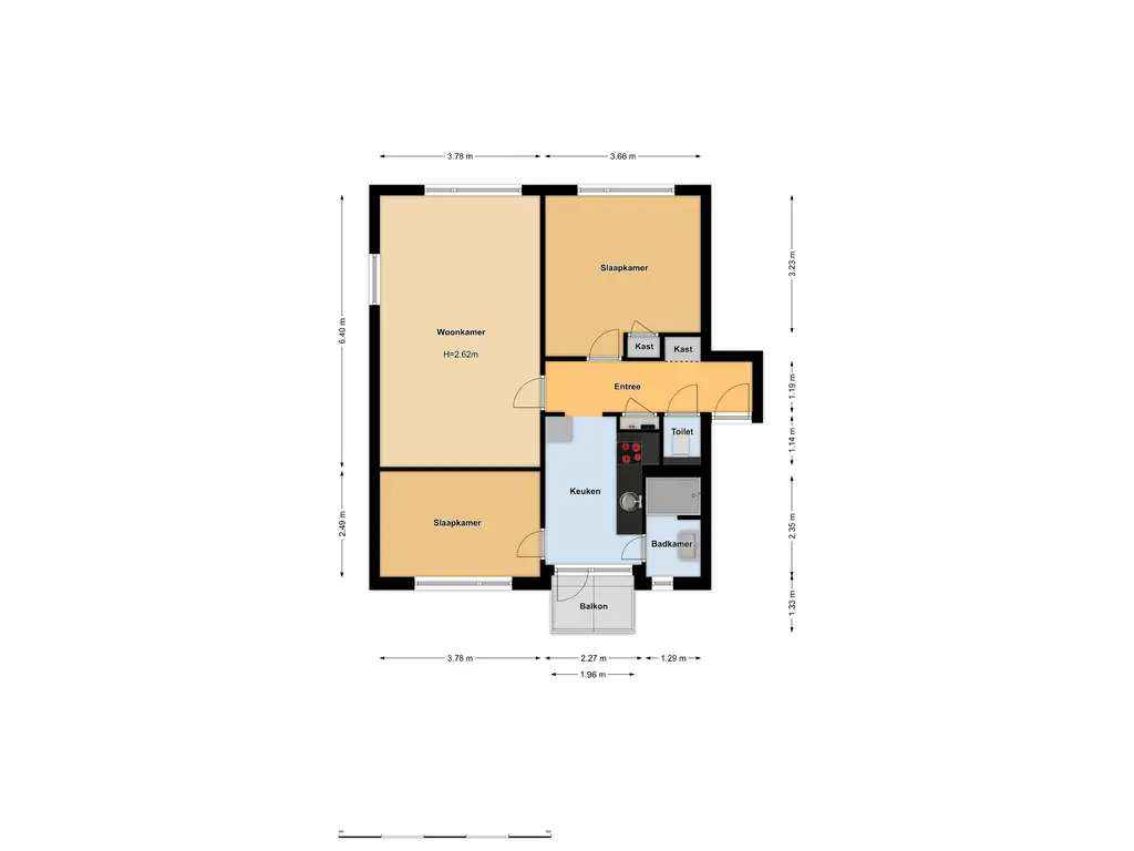 Entree/hal met toiletruimte, meterkast, garderobe en toegang tot de 1e slaapkamer met praktische vaste kast aan de voorzijde van het gebouw. Vanuit de hal is er een open doorgang naar de keuken met eenvoudig keukenblok v.v. elektrische kookplaat, afzuigkap, vaatwasser, spoelbak en losse koel-/vriescombinatie. Vanuit de keuken is er zowel toegang tot de badkamer v.v. douchecabine, wastafelmeubel en aansluiting voor wasmachine als tot het balkon aan de achterzijde (NW) en de 2e slaapkamer aan de achterzijde. Vanuit de hal is er tevens toegang tot de lichte woonkamer met prettig vrij uitzicht en een zij raam voor extra daglicht.