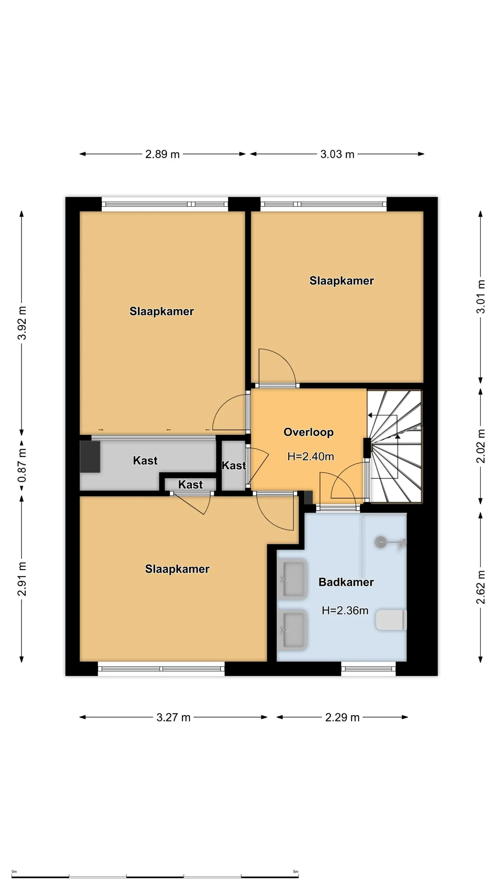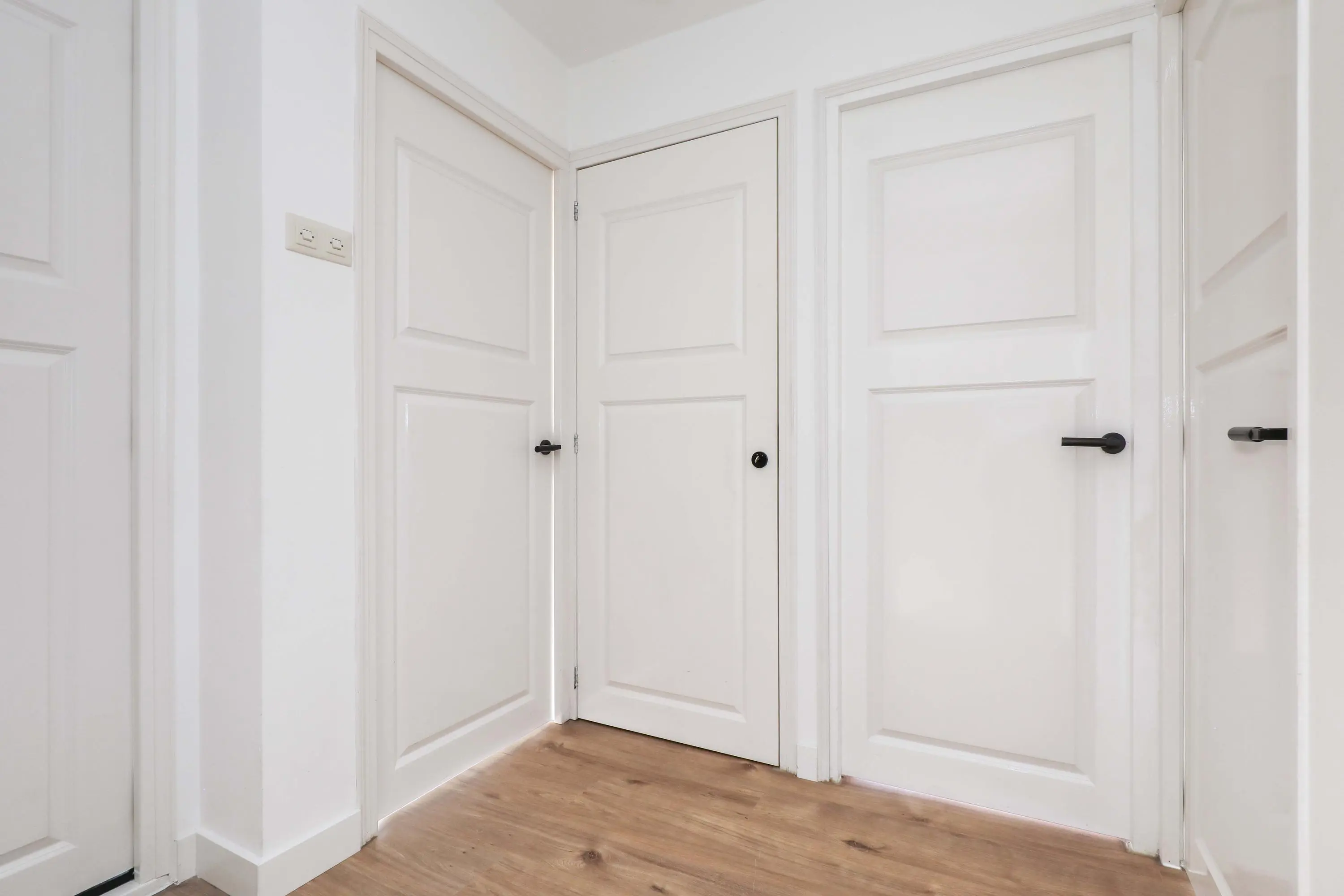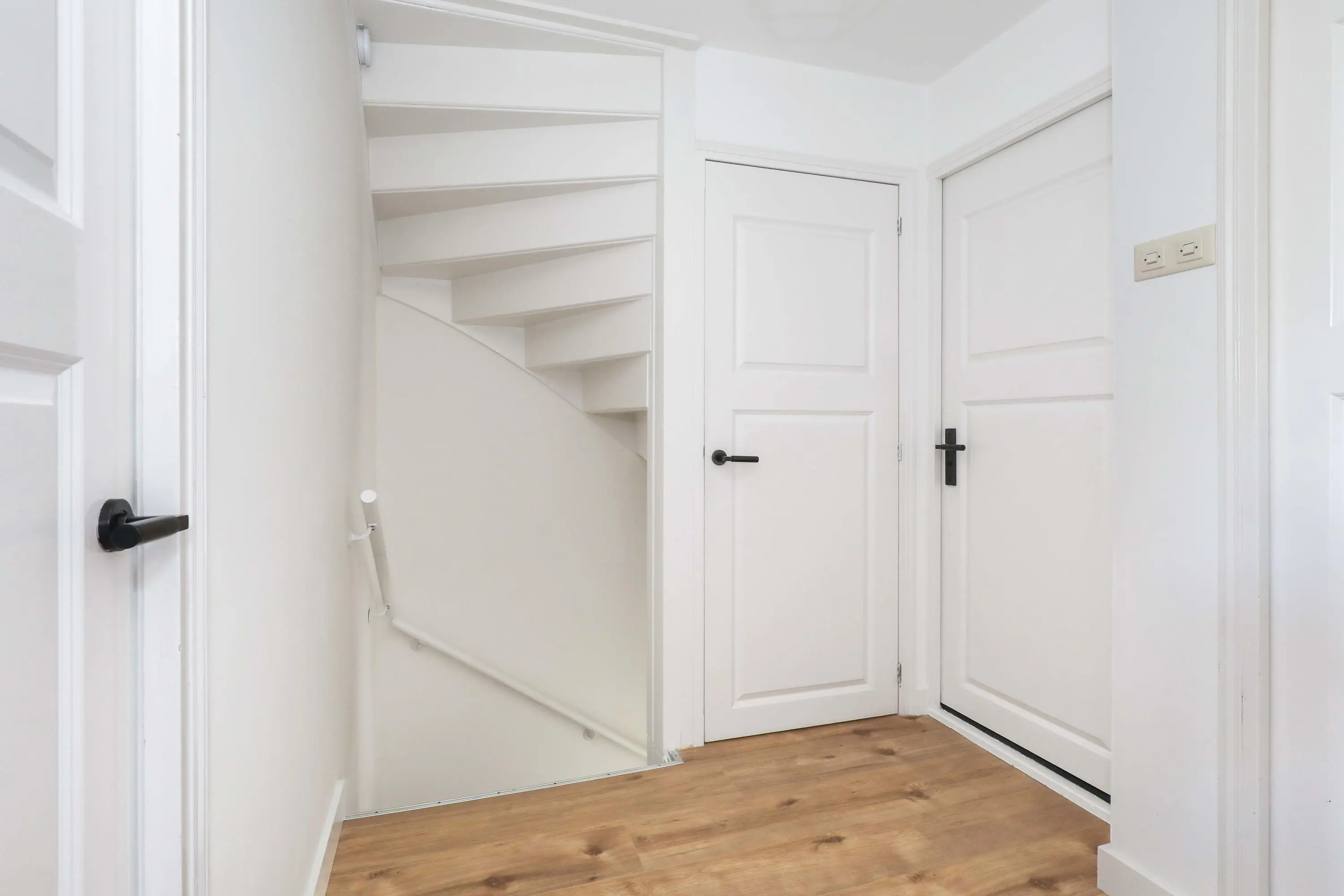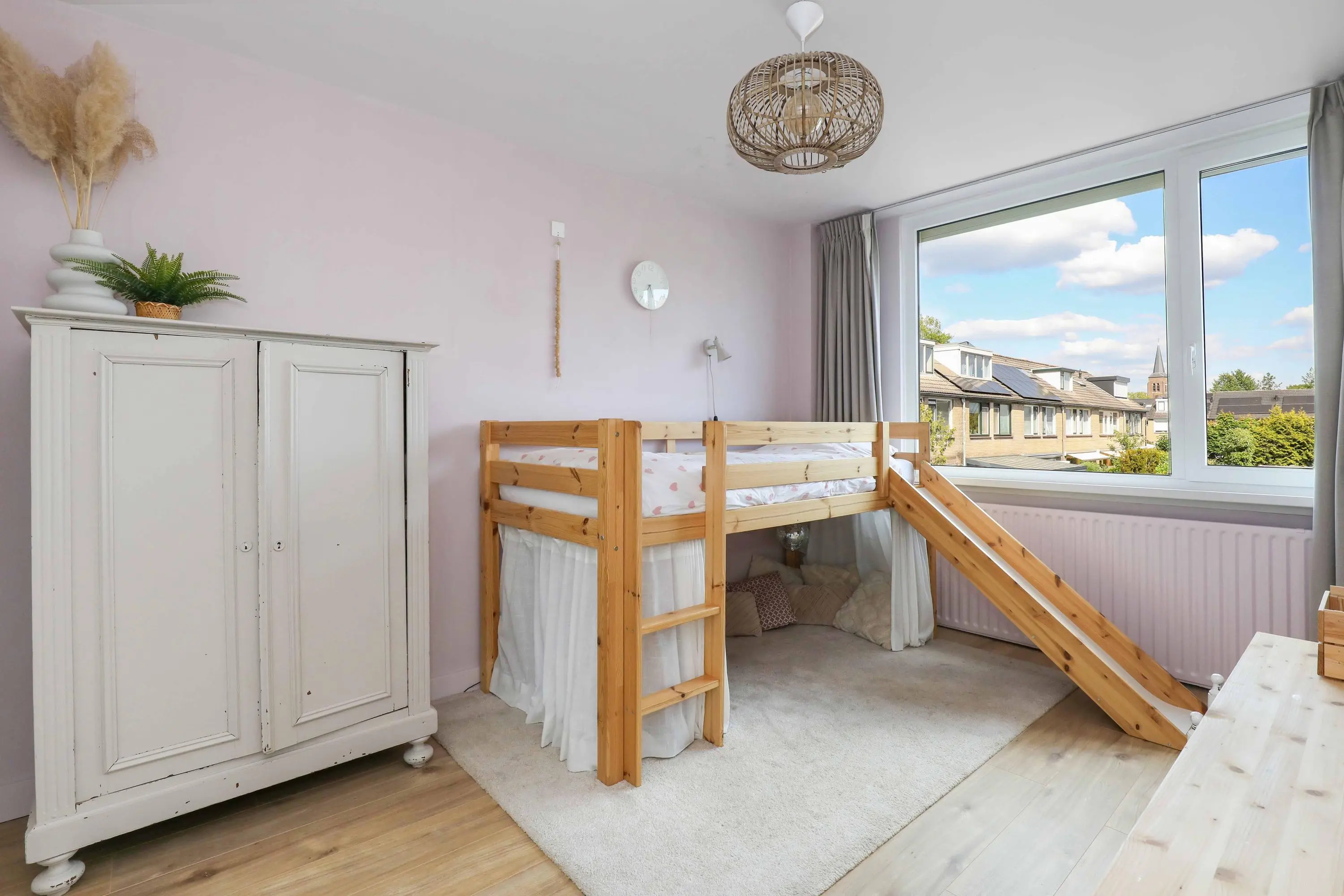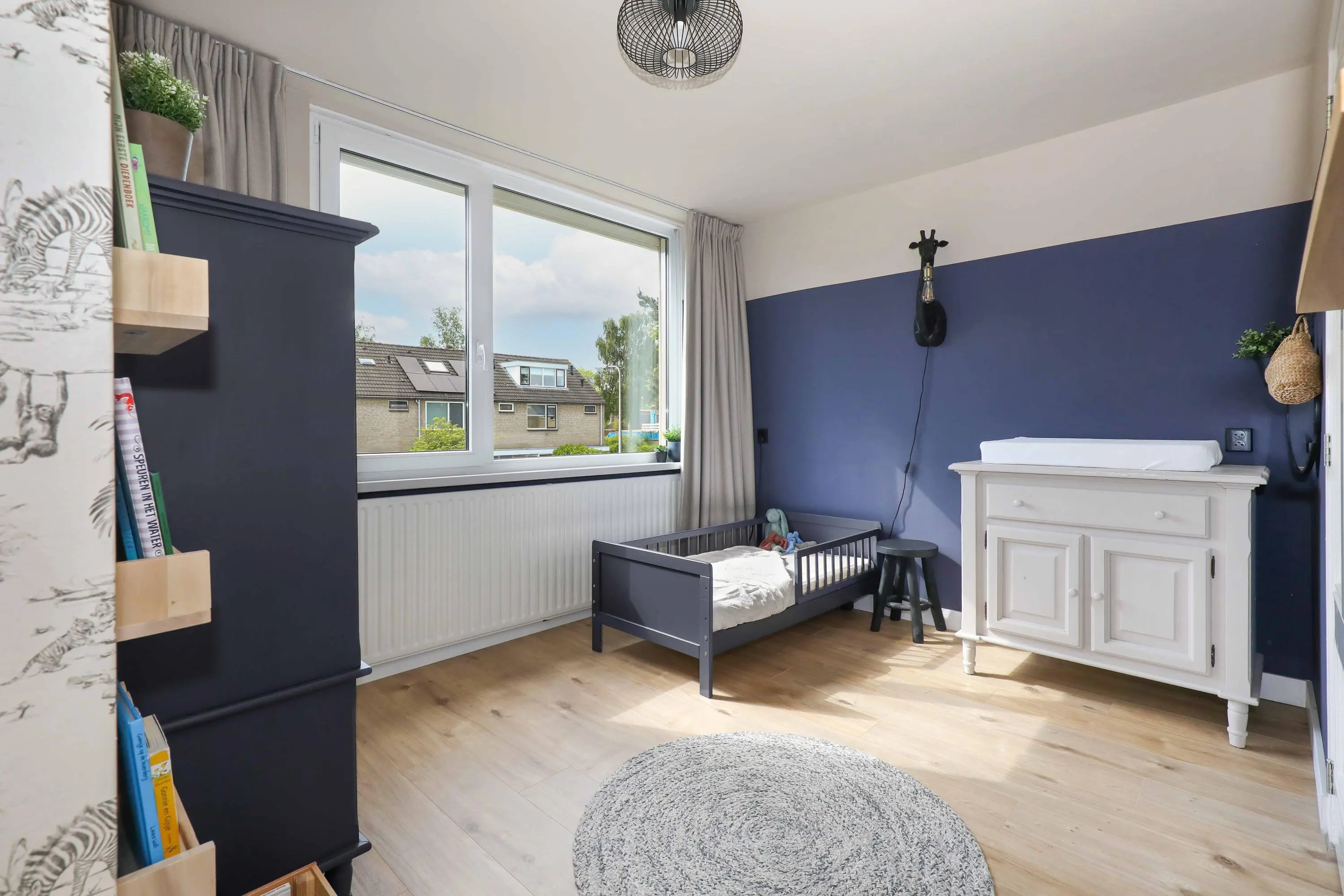 1e verdieping: overloop met praktische vaste kast, trapopgang naar 2e verdieping, twee in grootte variërende slaapkamers een de achterzijde waarvan één met vaste kastenwand en een derde slaapkamer met vaste kast aan de voorzijde. De badkamer is in 2021 deels vernieuwd en voorzien van een inloopdouche, dubbel wastafelmeubel en een toilet. De 1e verdieping beschikt over elektrische zonwering aan de achterzijde.