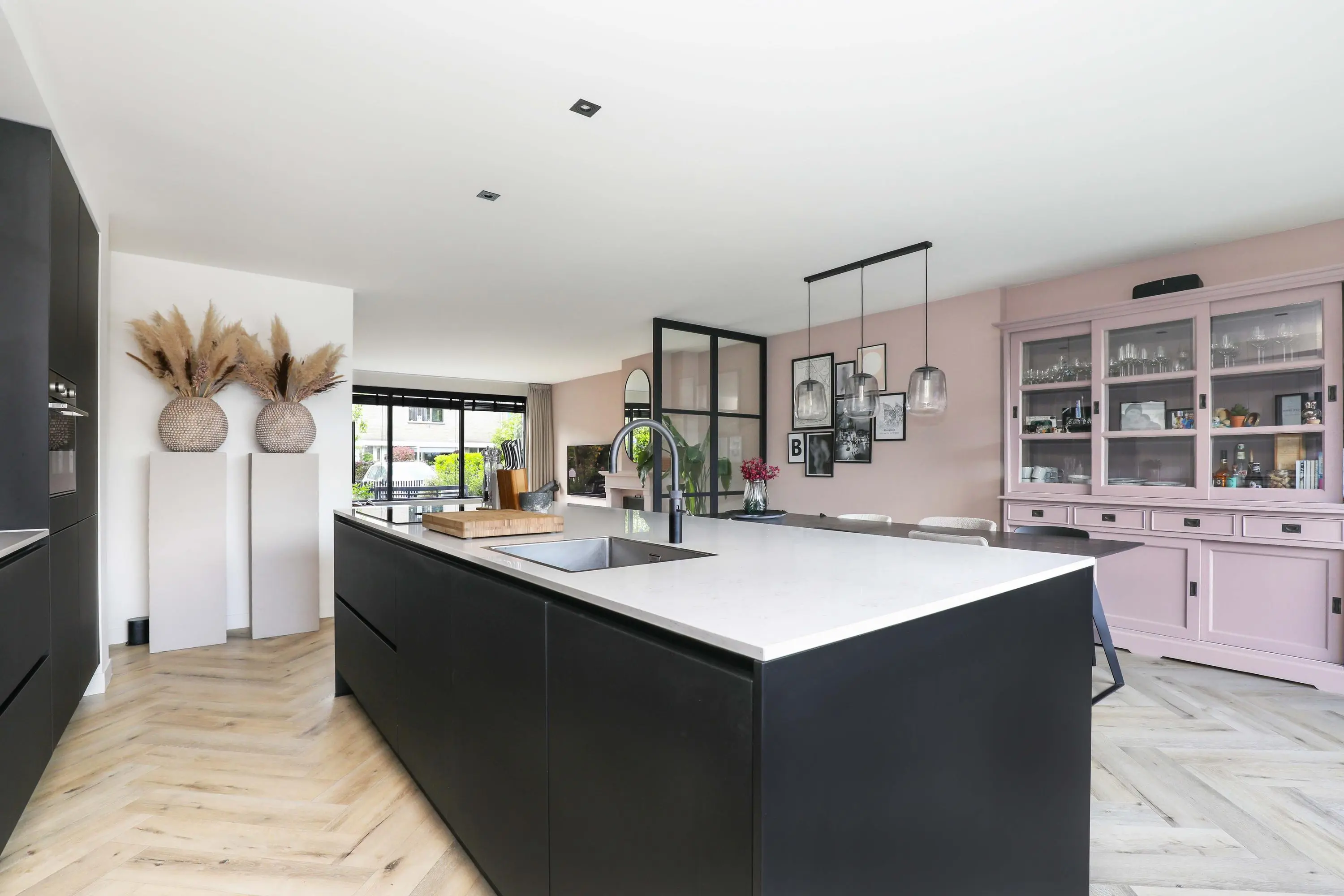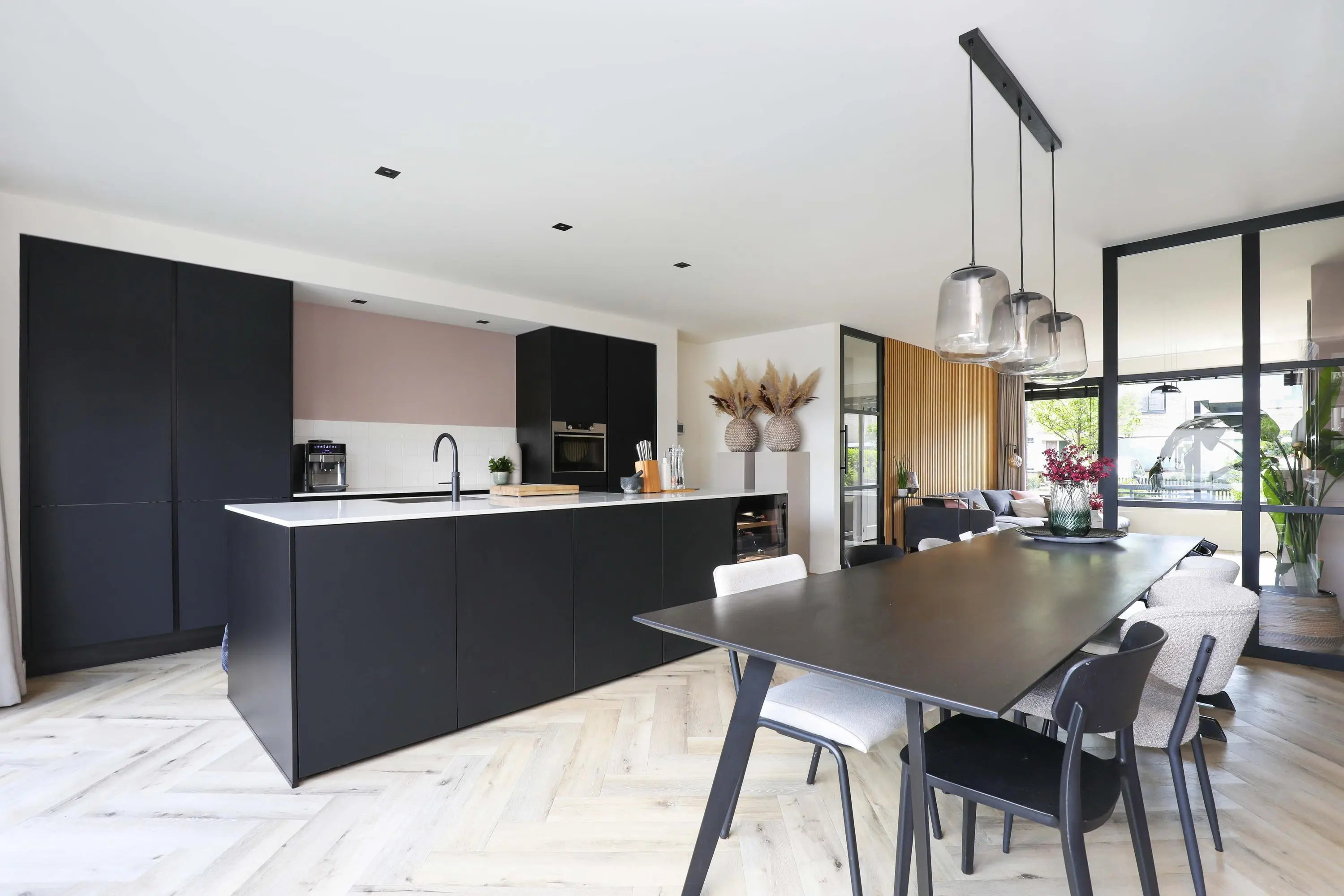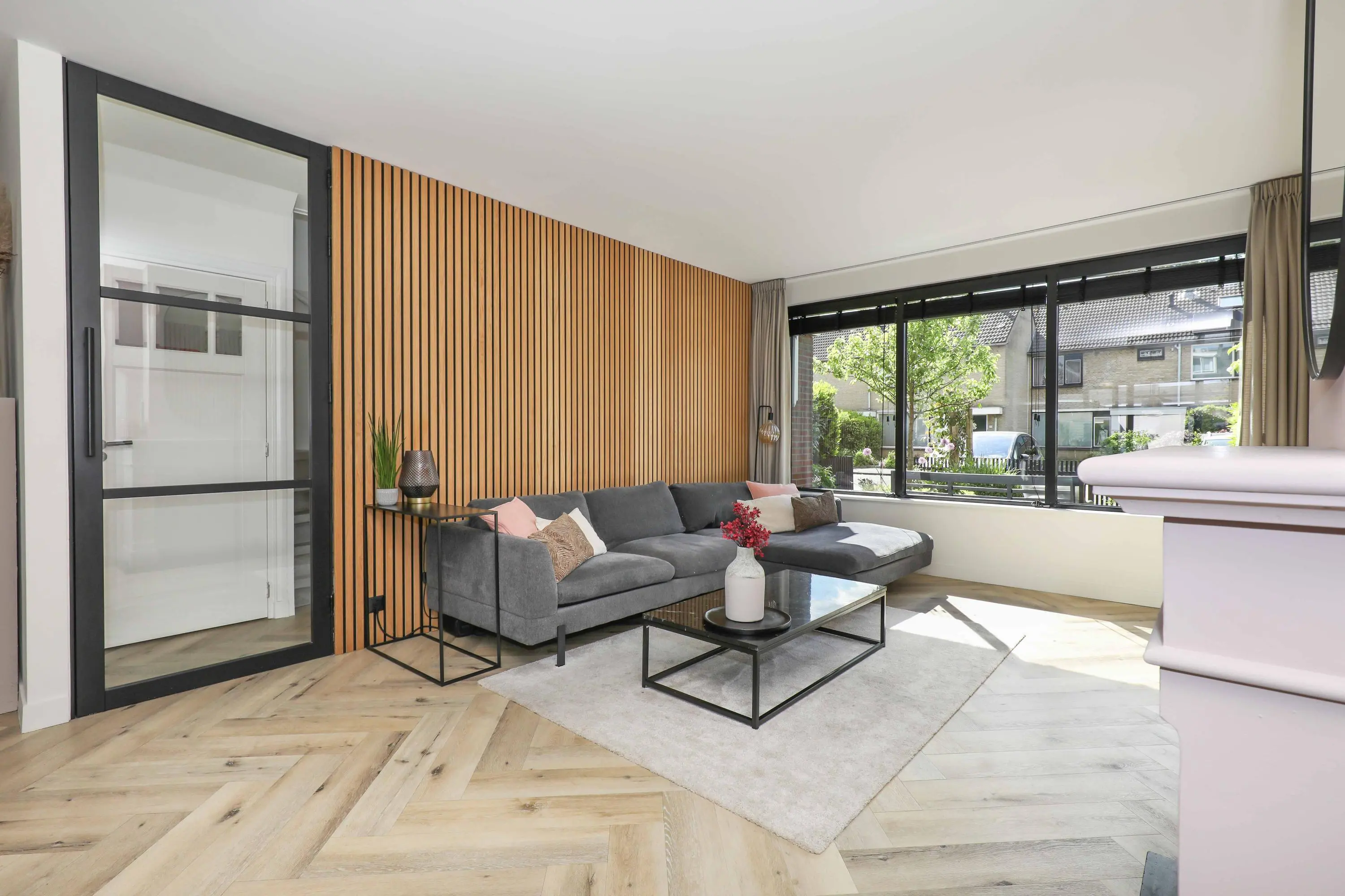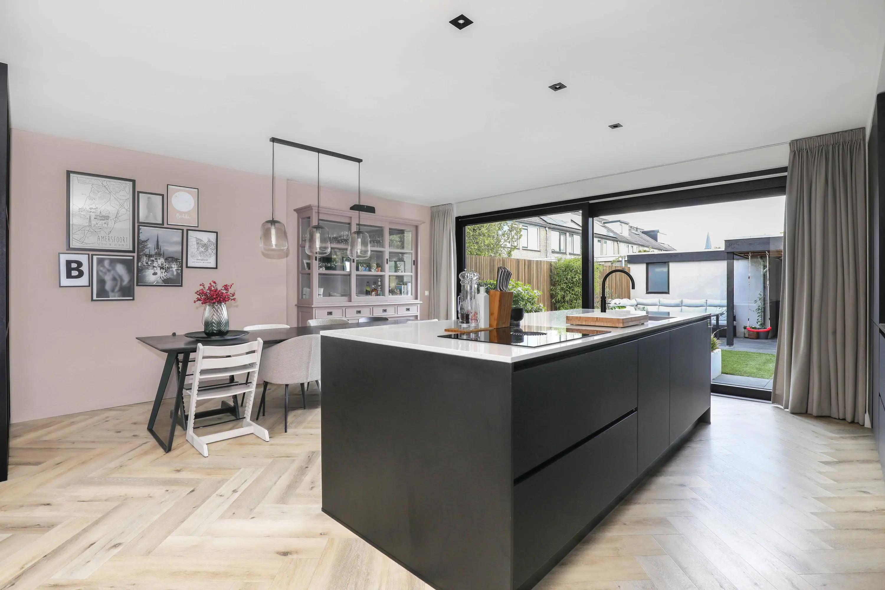 Begane grond: entree/hal met meterkast, toiletruimte, trapopgang naar 1e verdieping, praktische trapkast en toegang tot de royale leefruimte. Aan de voorzijde bevindt zich de sfeervolle woonkamer met houtkachel en een roomdivider die de ruimte op een natuurlijke manier scheidt van de leefkeuken. De woning is aan de achterzijde uitgebouwd, waardoor er een riante leefkeuken is ontstaan. De keuken is uitgerust met o.a. een inductiekookplaat met geïntegreerde afzuiging, combi-oven, wijnklimaatkast, vaatwasser, koelkast, vriezer, kokend waterkraan en volop kastruimte. De brede schuifpui aan de achterzijde verbindt binnen moeiteloos met buiten en zorgt voor veel daglicht. De begane grond is volledig voorzien van comfortabele vloerverwarming, een fraaie visgraat PVC-vloer en elektrische zonwering aan beide zijden.