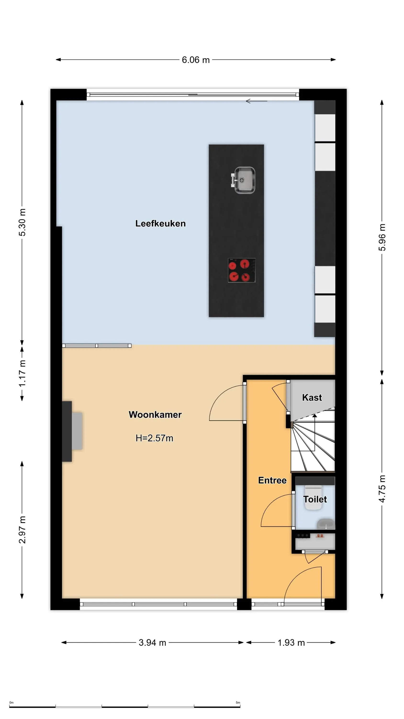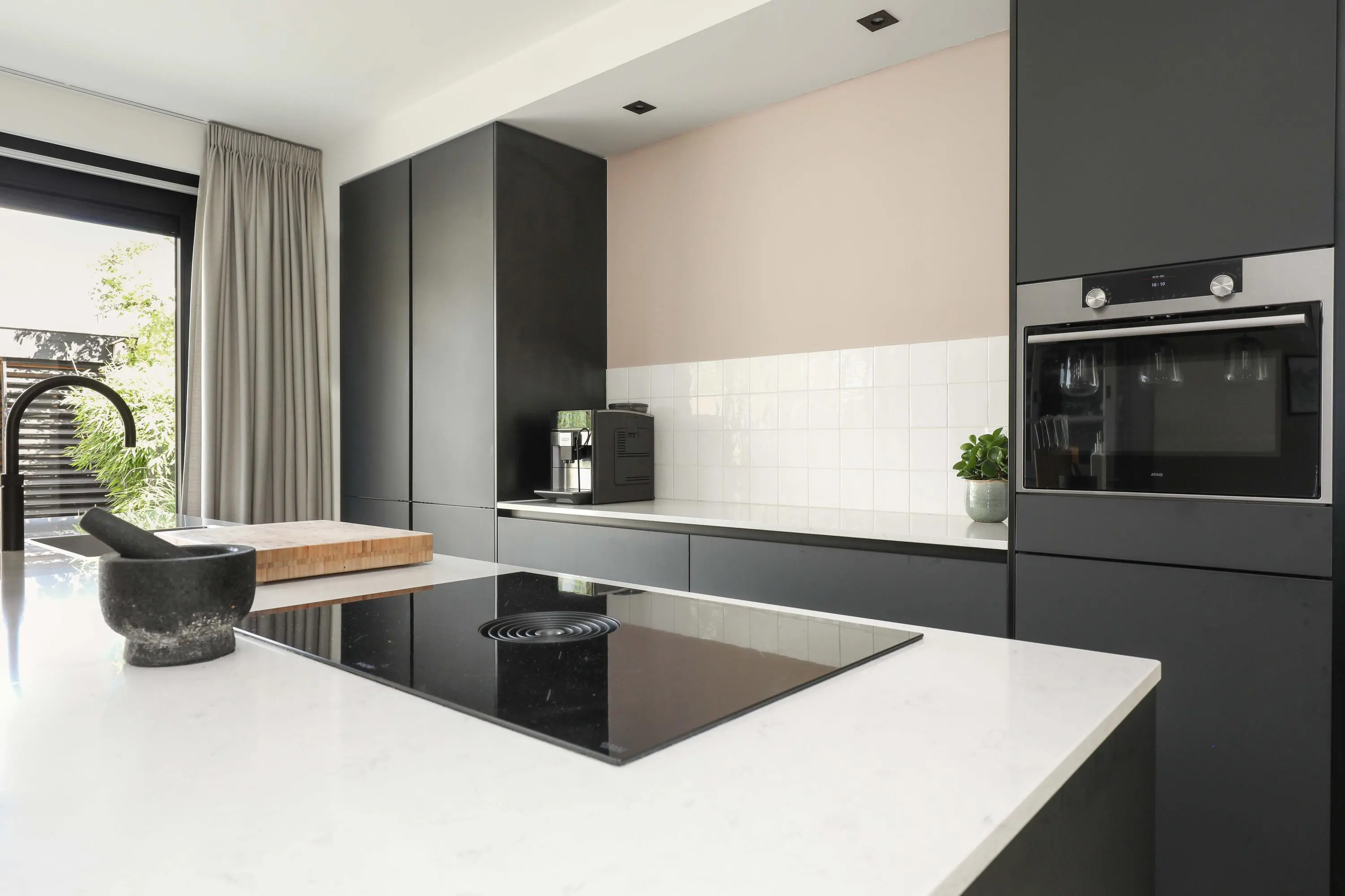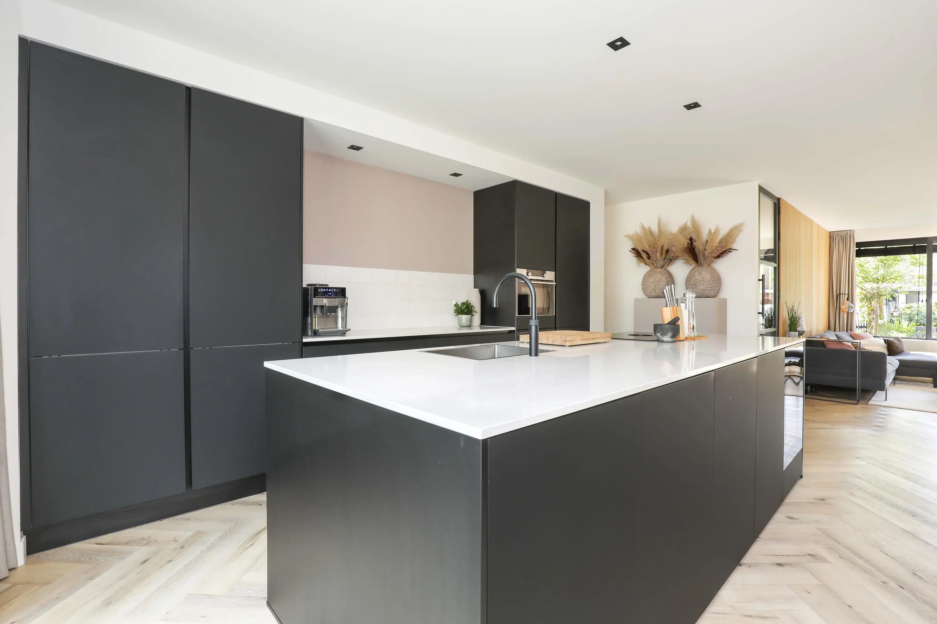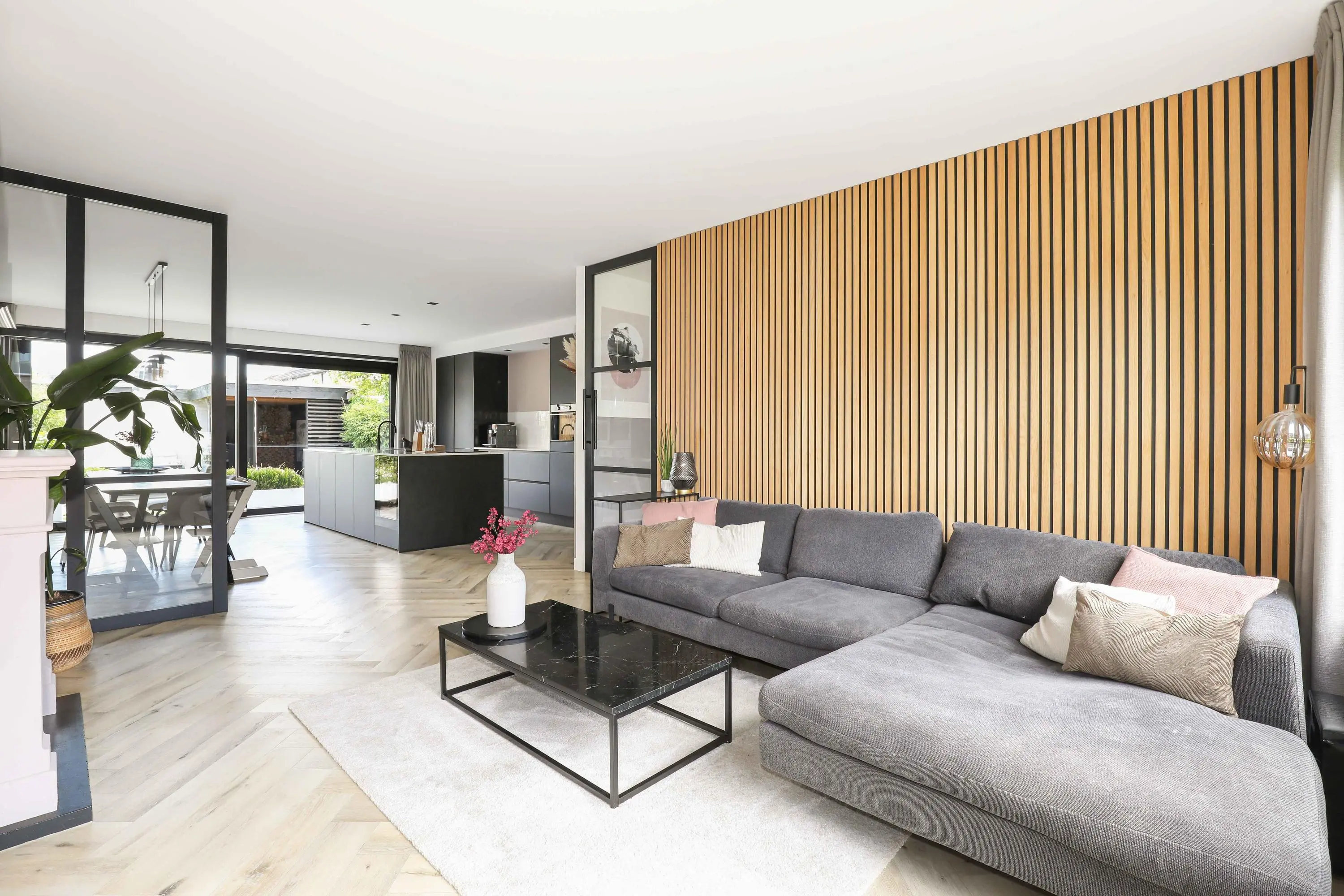 Begane grond: entree/hal met meterkast, toiletruimte, trapopgang naar 1e verdieping, praktische trapkast en toegang tot de royale leefruimte. Aan de voorzijde bevindt zich de sfeervolle woonkamer met houtkachel en een roomdivider die de ruimte op een natuurlijke manier scheidt van de leefkeuken. De woning is aan de achterzijde uitgebouwd, waardoor er een riante leefkeuken is ontstaan. De keuken is uitgerust met o.a. een inductiekookplaat met geïntegreerde afzuiging, combi-oven, wijnklimaatkast, vaatwasser, koelkast, vriezer, kokend waterkraan en volop kastruimte. De brede schuifpui aan de achterzijde verbindt binnen moeiteloos met buiten en zorgt voor veel daglicht. De begane grond is volledig voorzien van comfortabele vloerverwarming, een fraaie visgraat PVC-vloer en elektrische zonwering aan beide zijden.