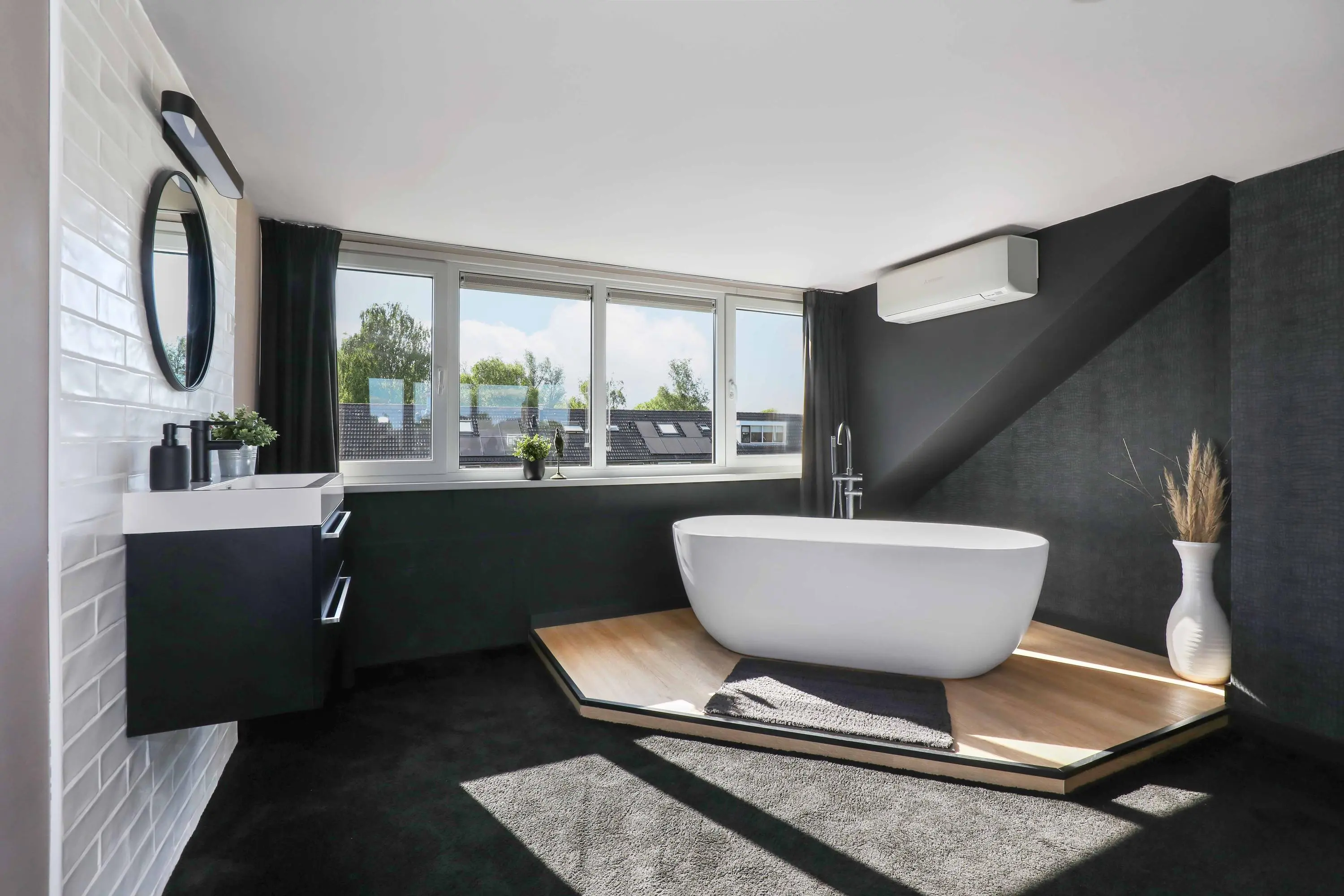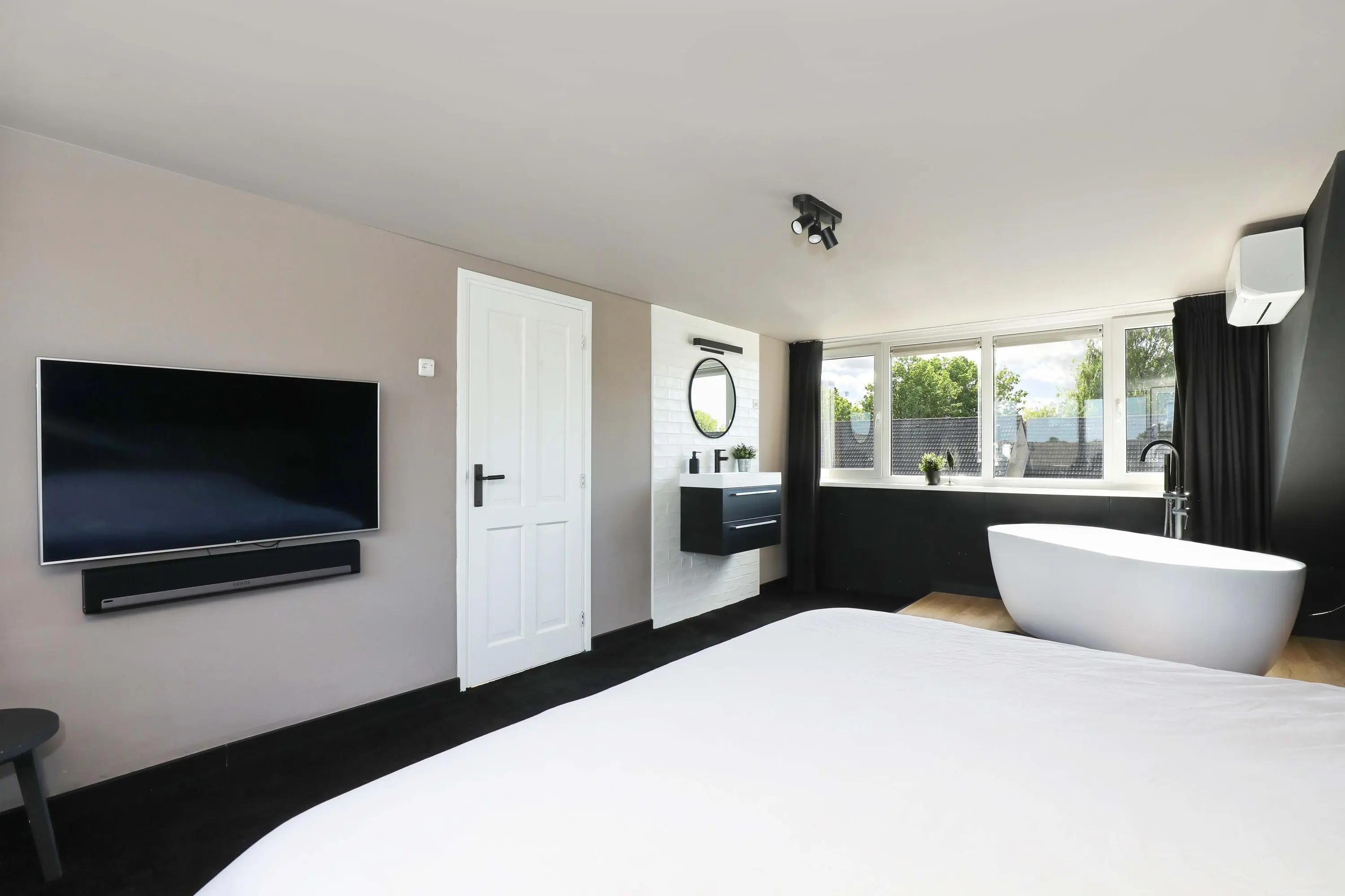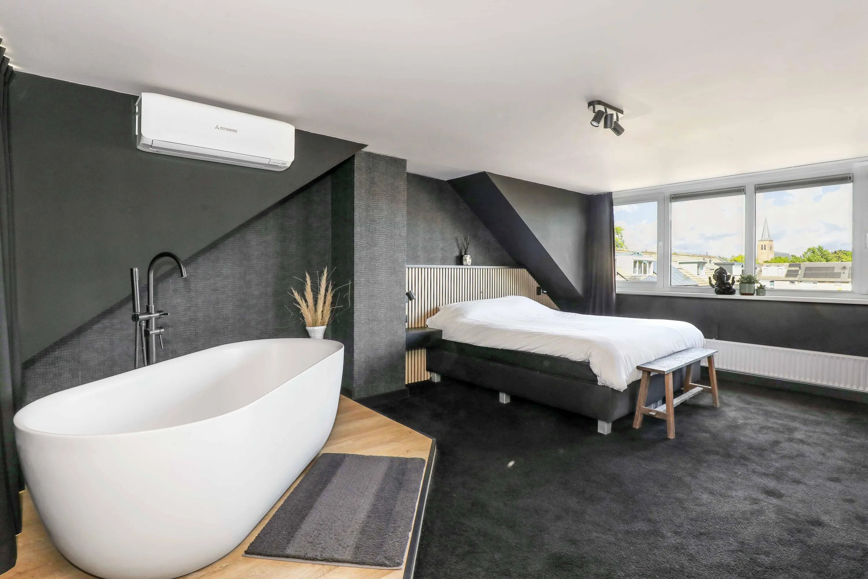 2e verdieping: overloop met dakraam, ruimte voor wasmachine-/drogeropstelling en vaste kast met C.V.-installatie (2024). Op deze verdieping tref je een royale slaapkamer en een vrijstaand bad en een wastafelmeubel – luxe en comfort in één! Aan beide zijden is een dakkapel geplaatst en de ruimte beschikt over airconditioning.