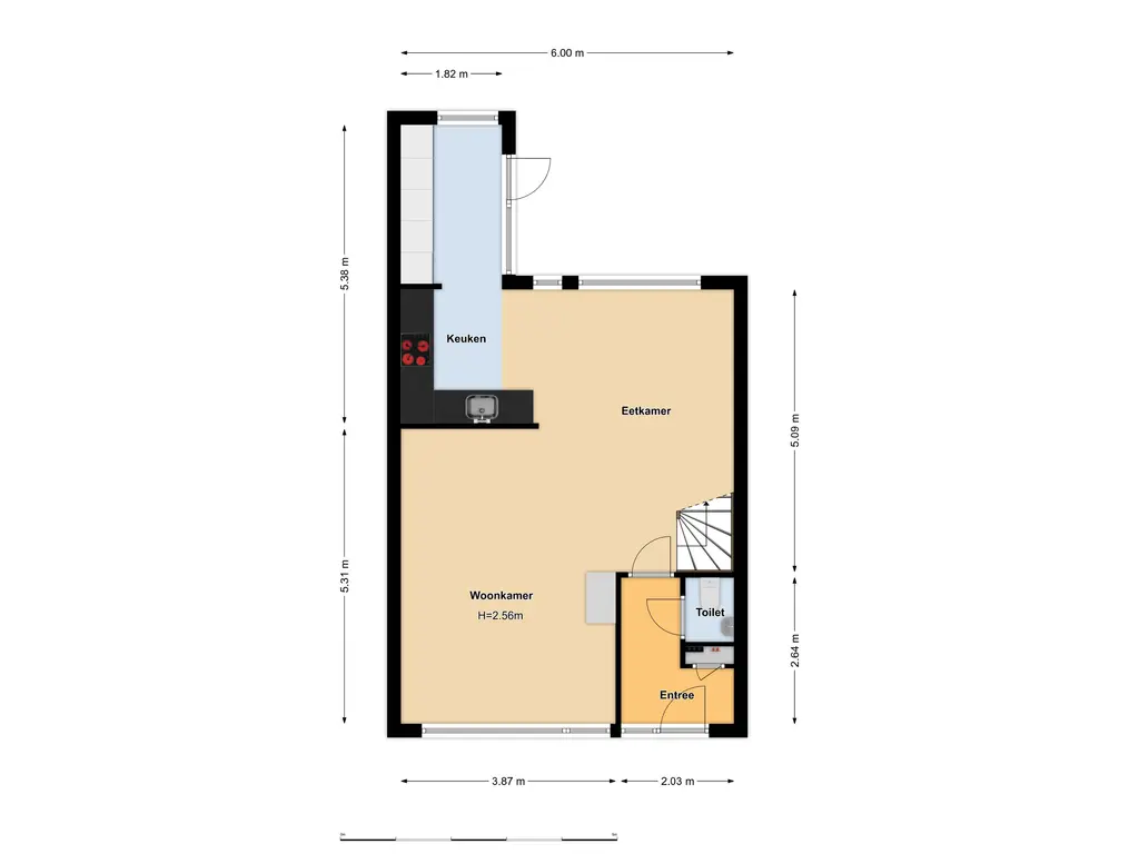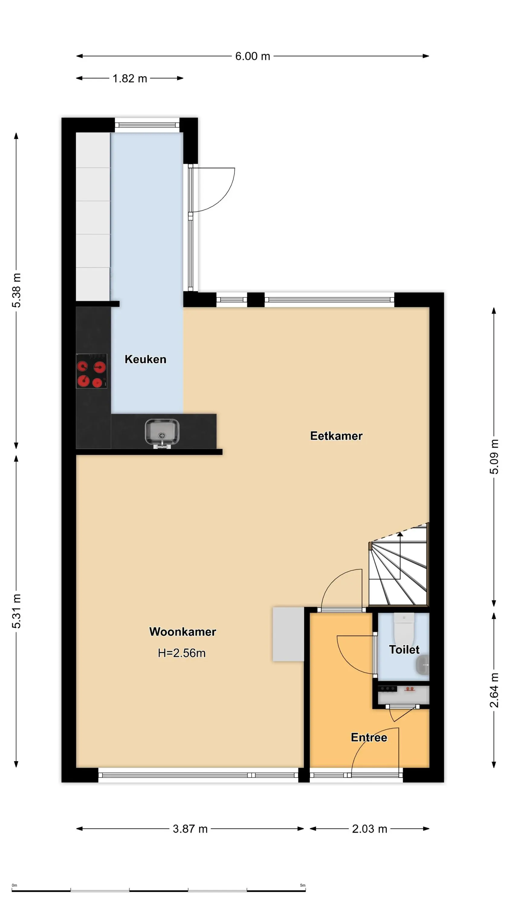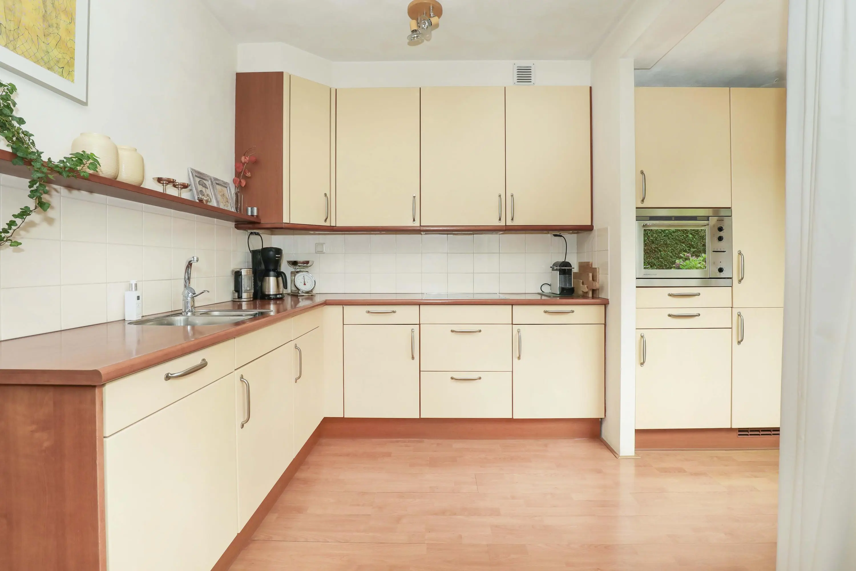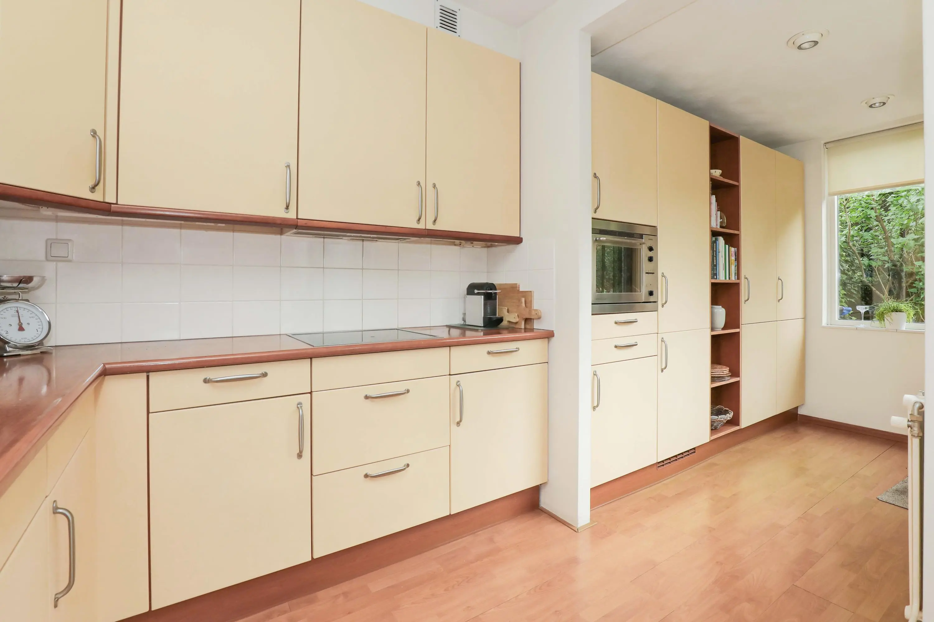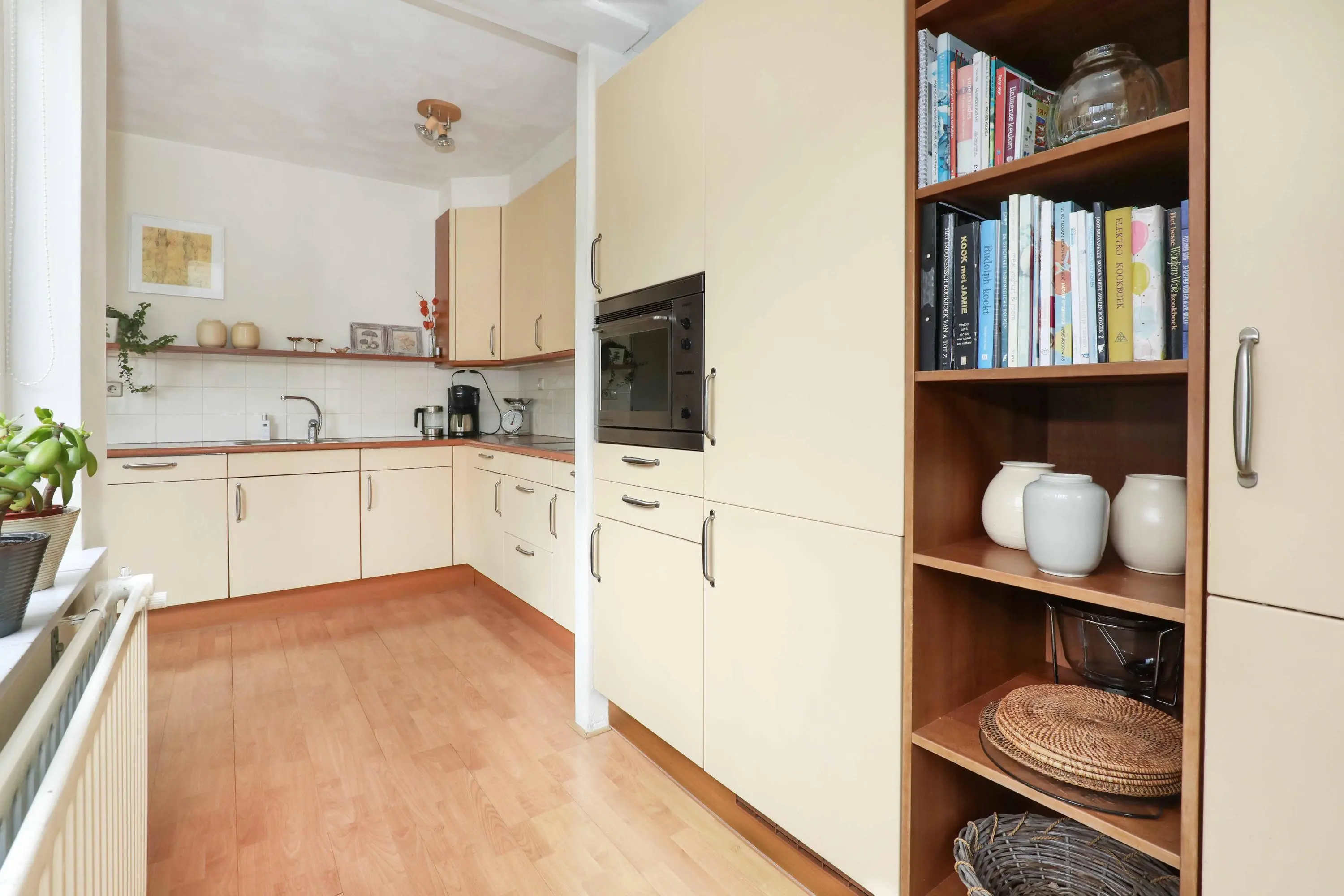 Begane grond: entree/hal met meterkast, toiletruimte, garderobe en toegang tot de leefruimte. Aan de voorzijde van de woning bevindt zich de sfeervolle en lichte woonkamer met open haard en trapopgang naar de 1e verdieping. De woonkamer heeft een open verbinding met het eetgedeelte aan de achterzijde evenals de gedeeltelijk uitgebouwde keuken. De keuken heeft een L-opstelling en is voorzien van de nodige inbouwapparatuur zoals een vaatwasser, keramische kookplaat, afzuigkap, koel-vriescombinatie, combi-oven en een spoelbak. Vanuit de keuken is er tevens toegang tot de achtertuin.