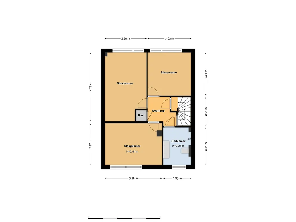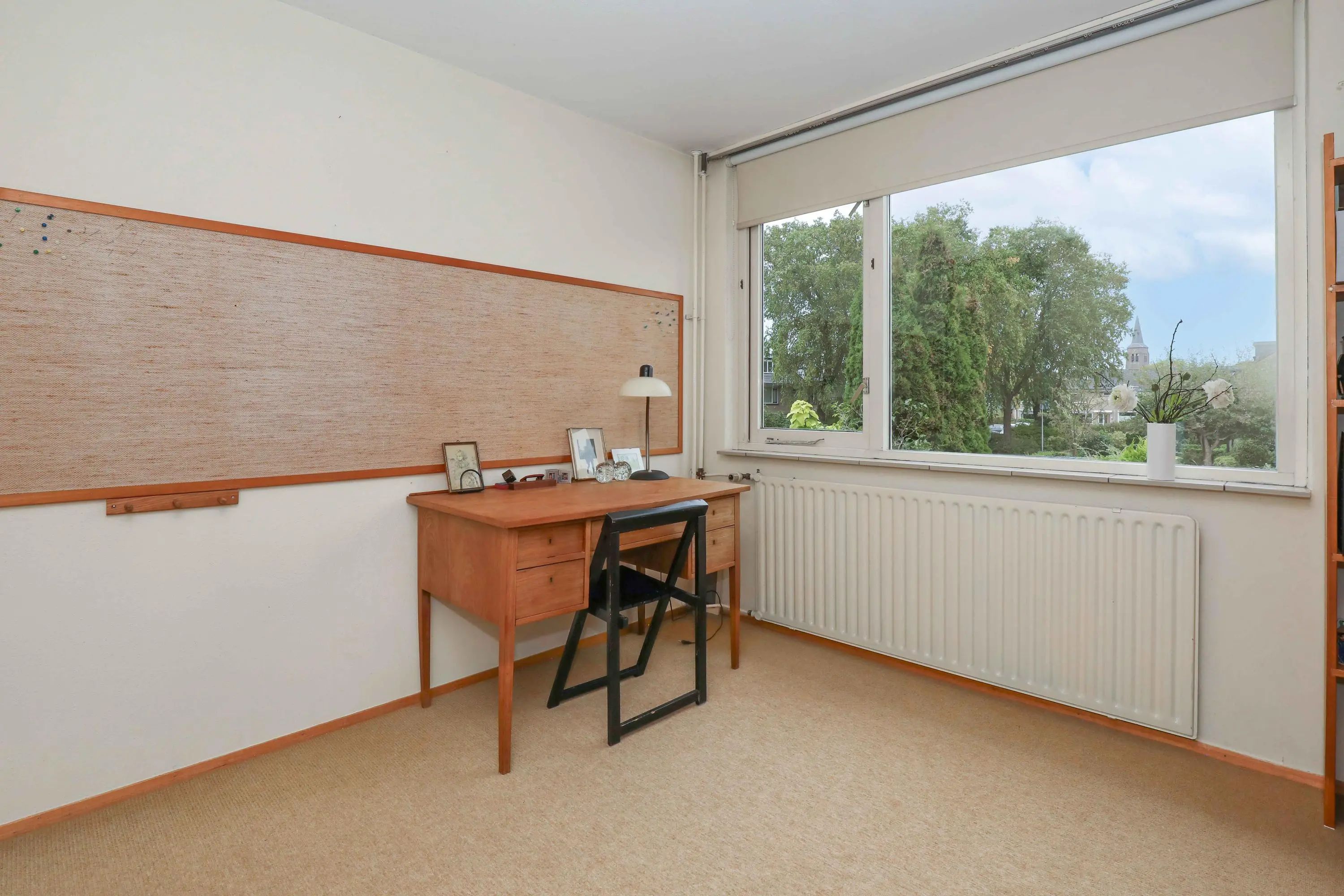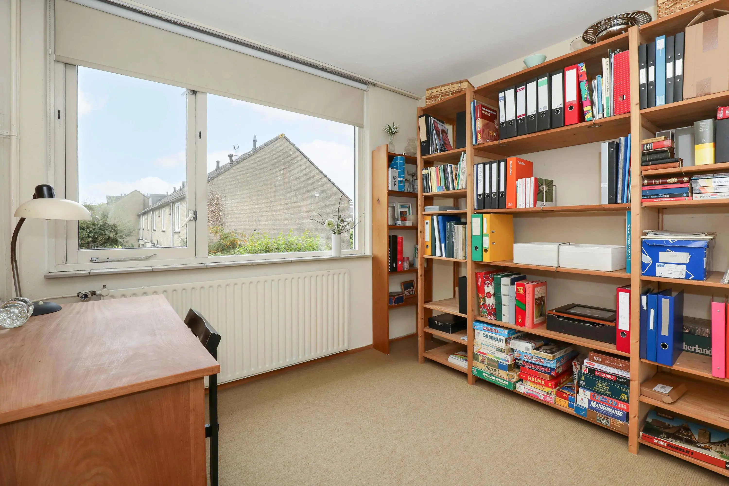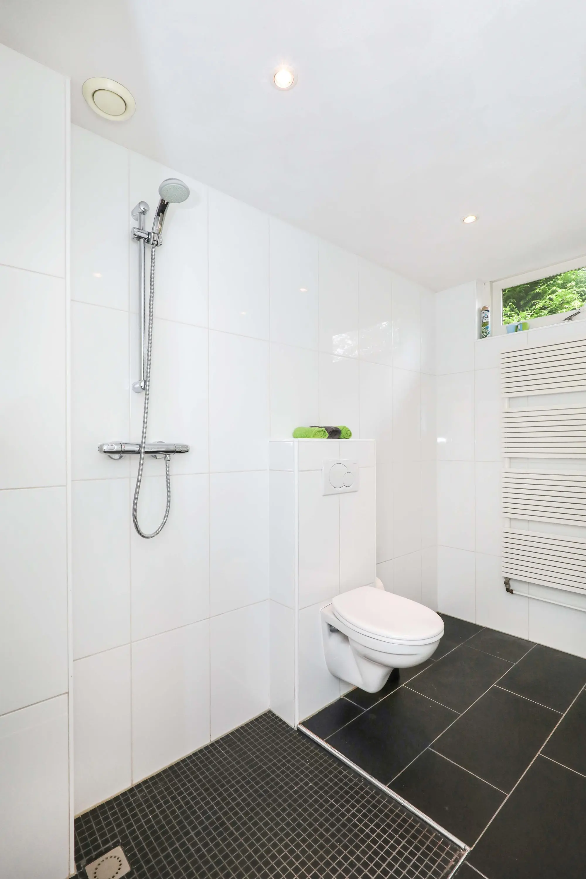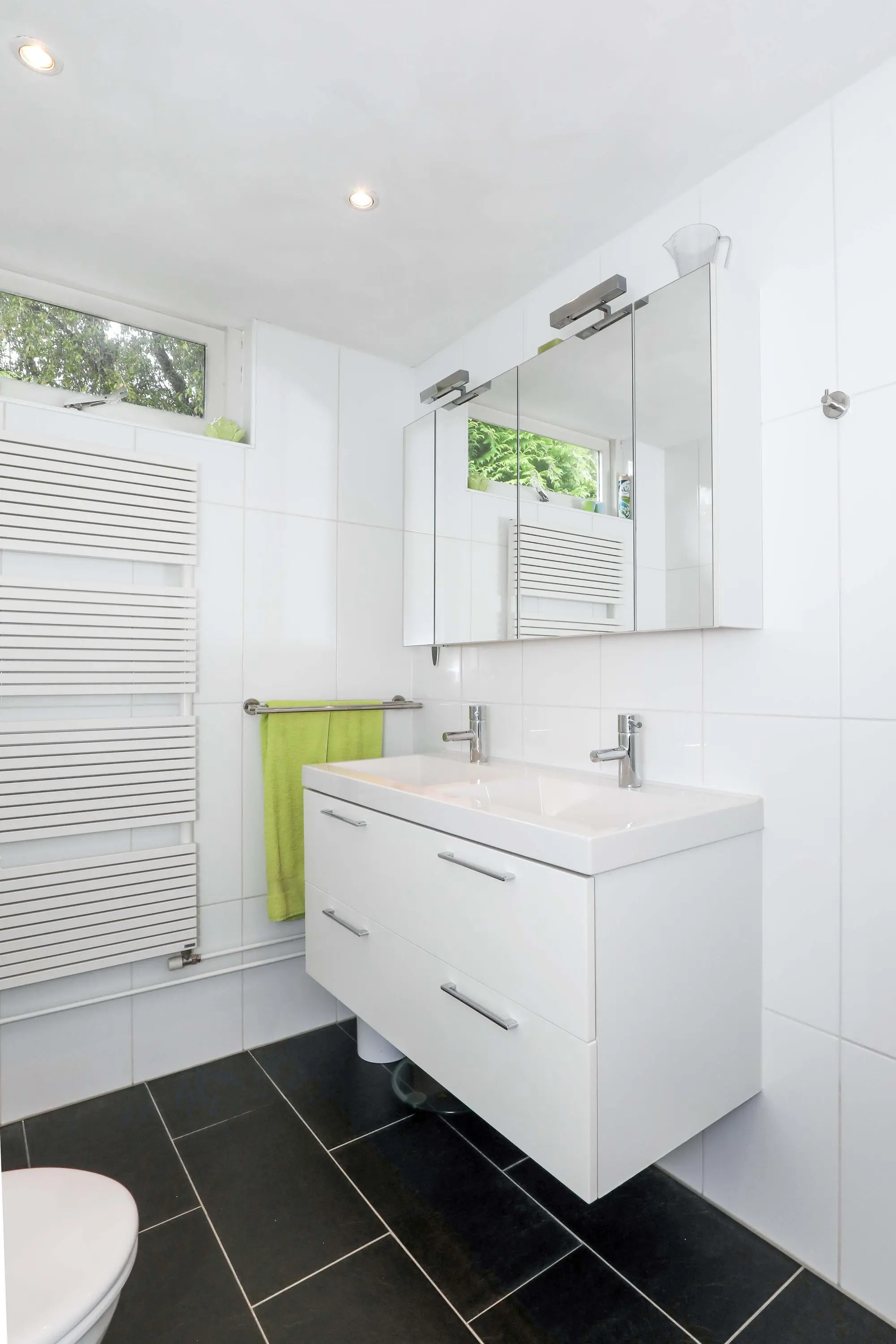 1e verdieping: overloop met deur naar trapopgang 2e verdieping, praktische vaste kast, twee in grootte variërende slaapkamers aan de achterzijde en een 3e slaapkamer aan de voorzijde. De badkamer (2016) is voorzien van een inloopdouche, dubbel wastafelmeubel, toilet en handdoekradiator.