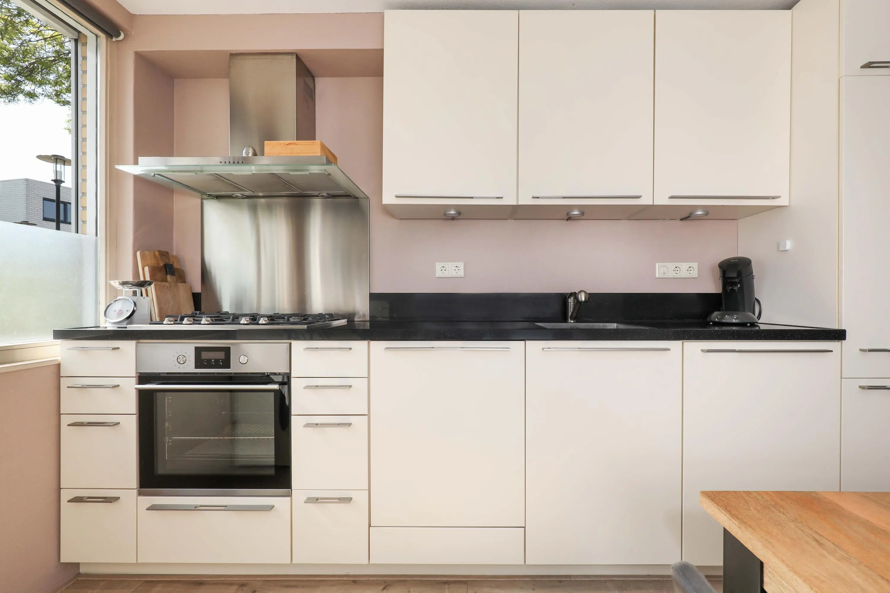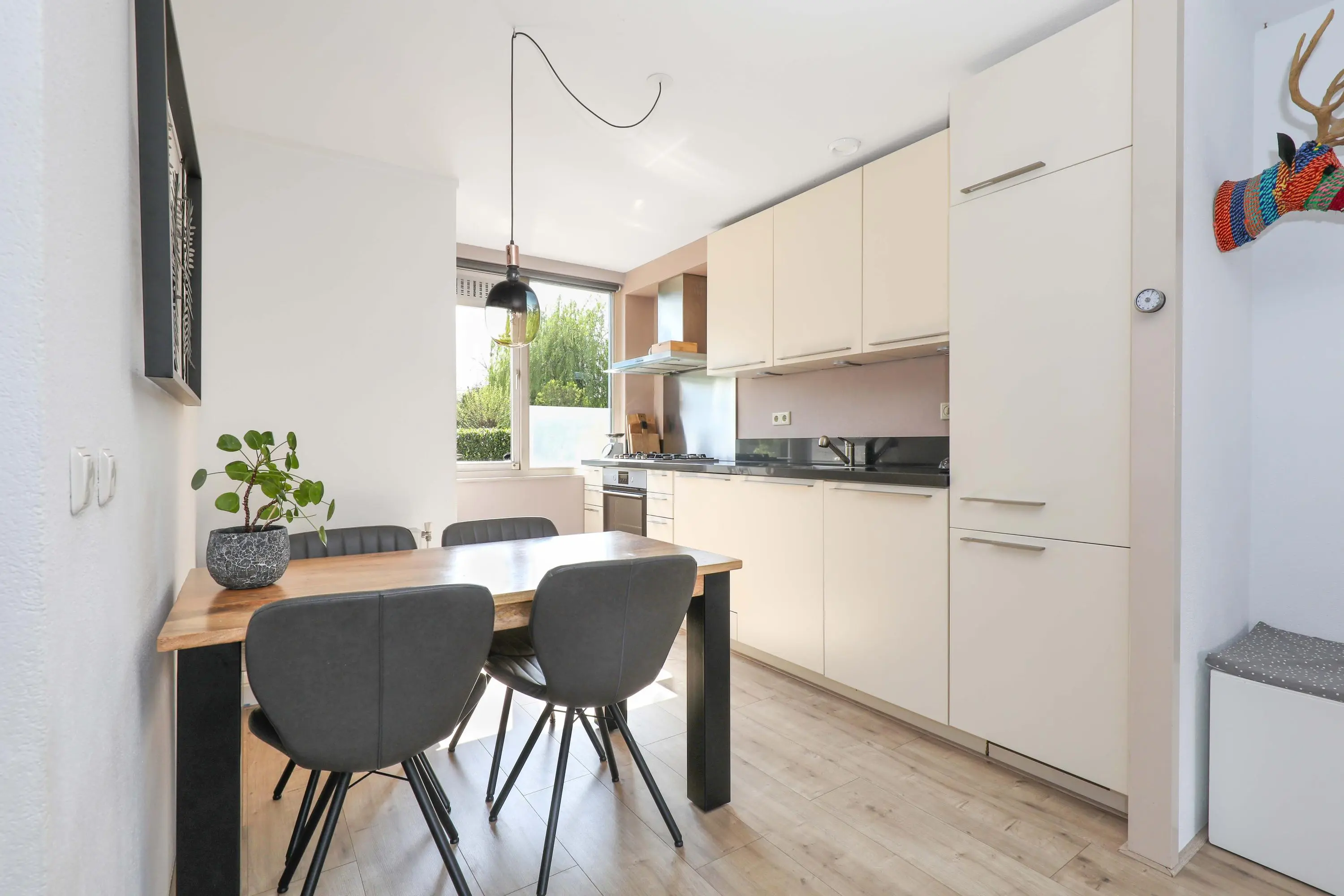 Begane grond: entree/hal met meterkast, moderne toiletruimte en toegang tot de leefruimte. Aan de voorzijde bevindt zich de open keuken in lichte kleurstelling en v.v. gaskookplaat, afzuigkap, oven, vaatwasser (2020), koel-/vriescombinatie (2020), spoelbak en trapkast. Aan de achterzijde bevindt zich de lichte woonkamer met deur naar de achtertuin.