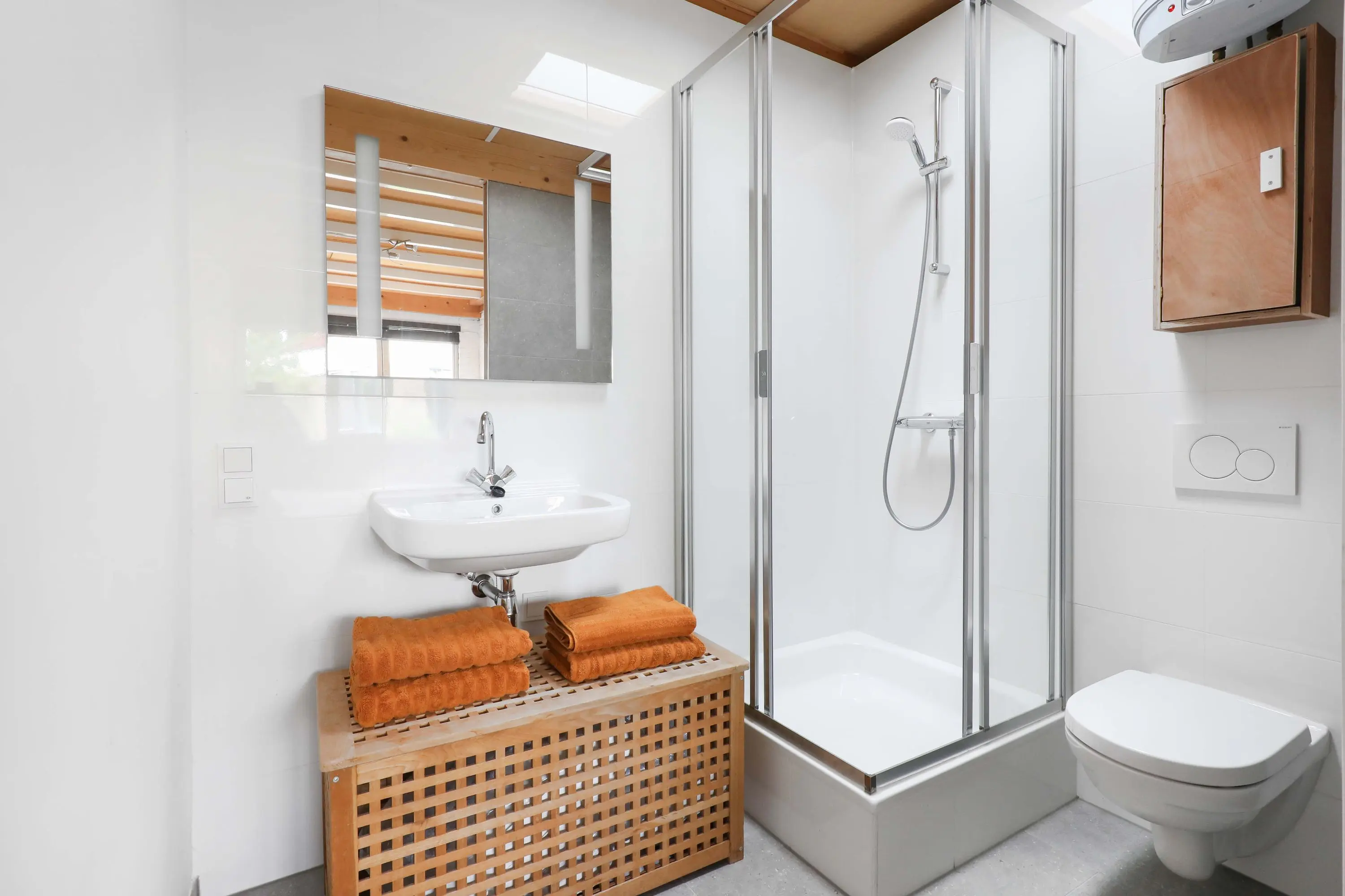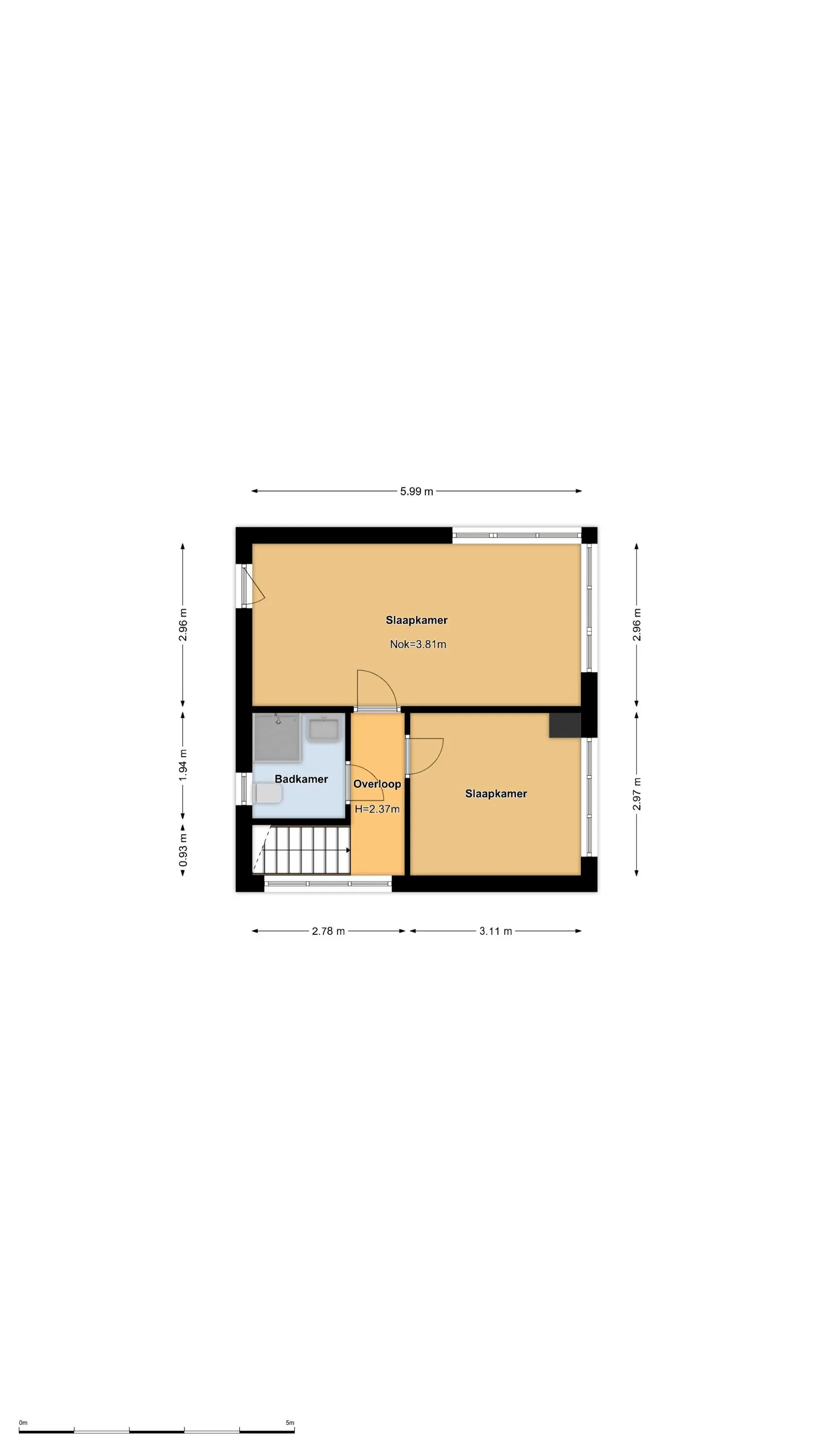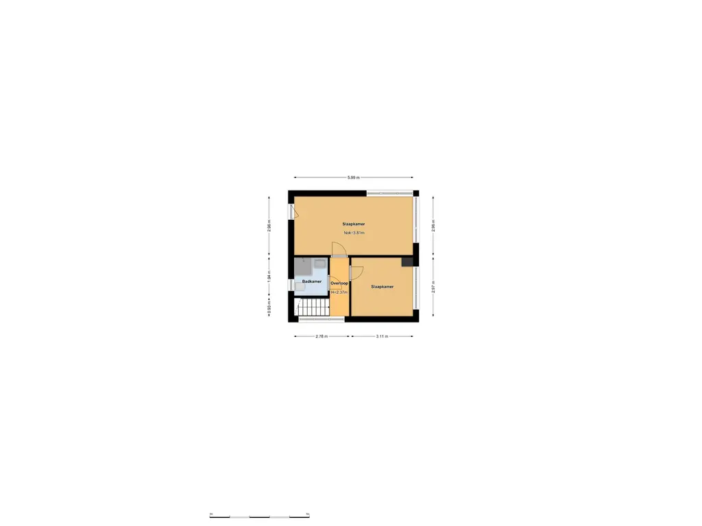 Verdieping: overloop met nog twee in grootte variërende slaapkamers en een tweede badkamer v.v. douchecabine, wastafel en toilet.