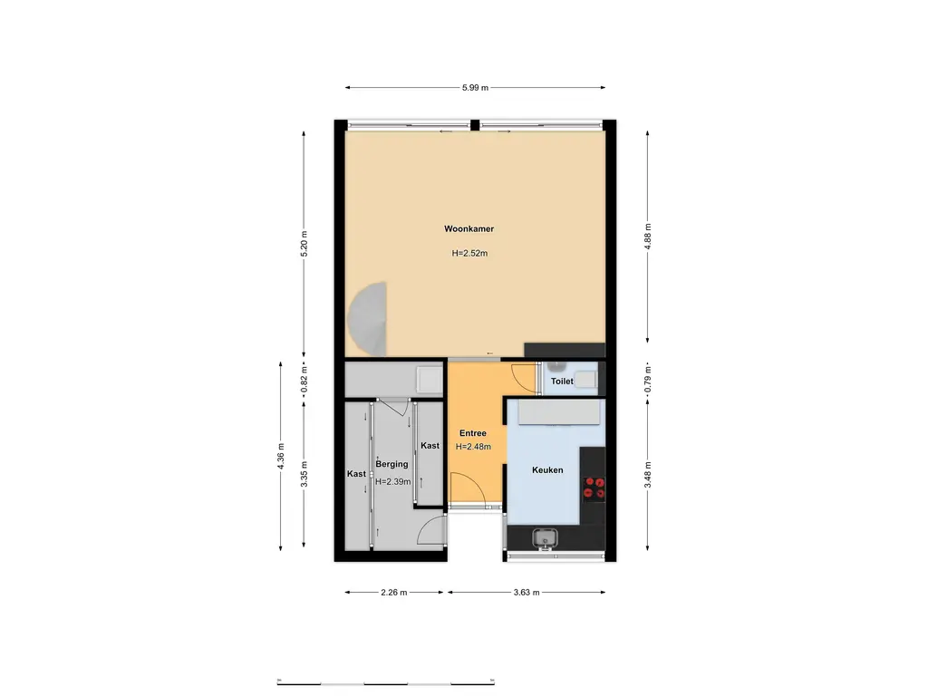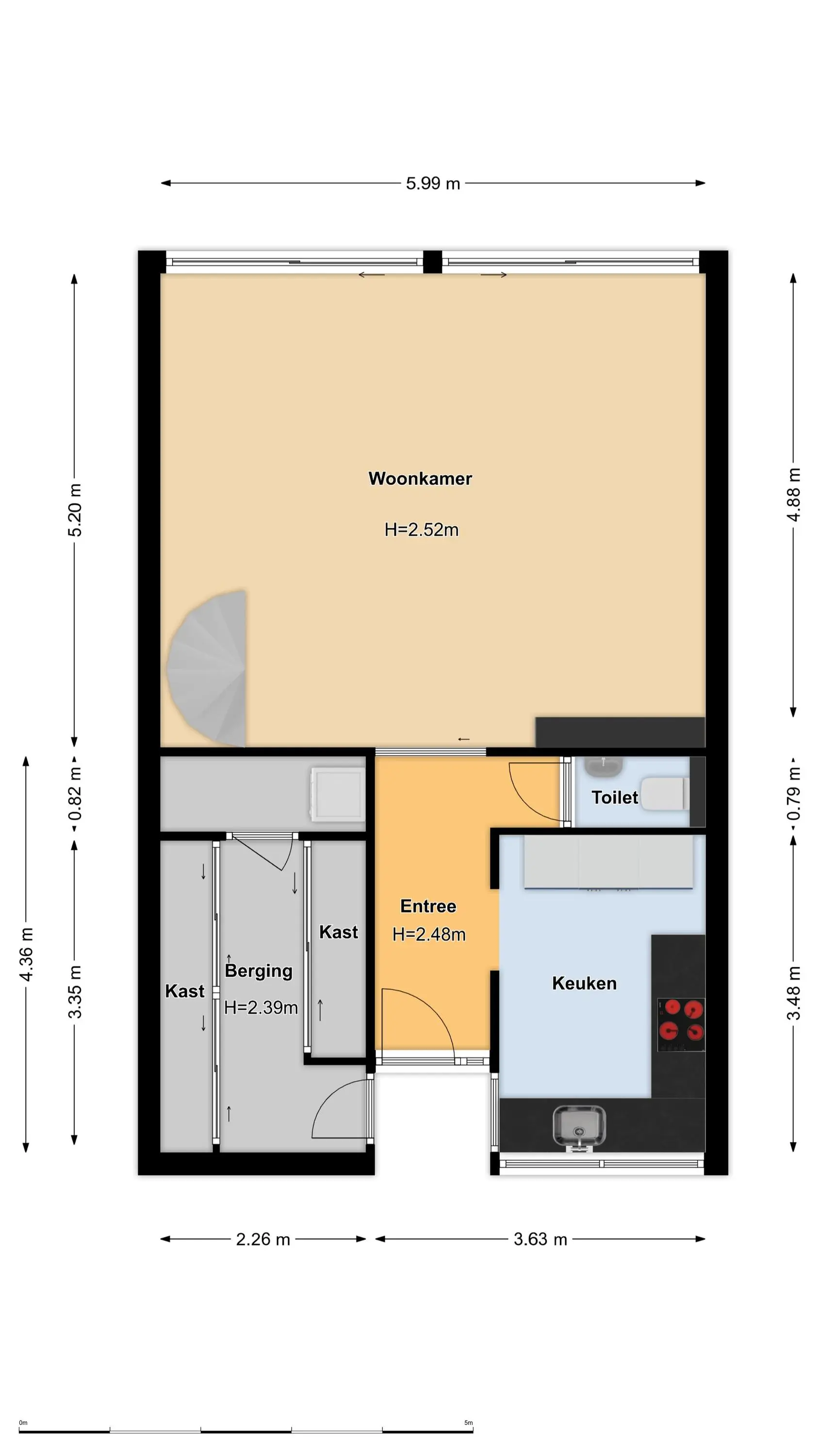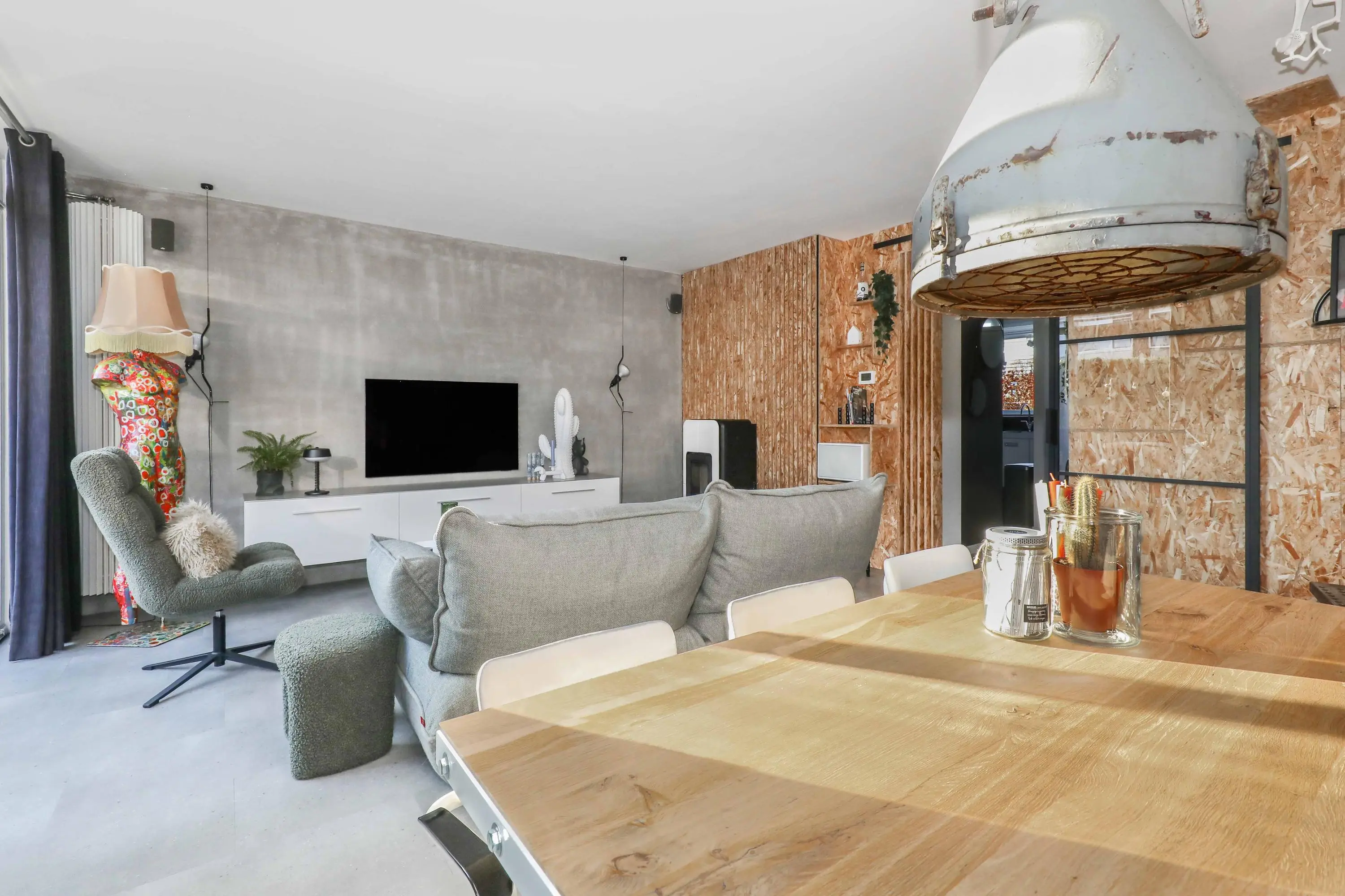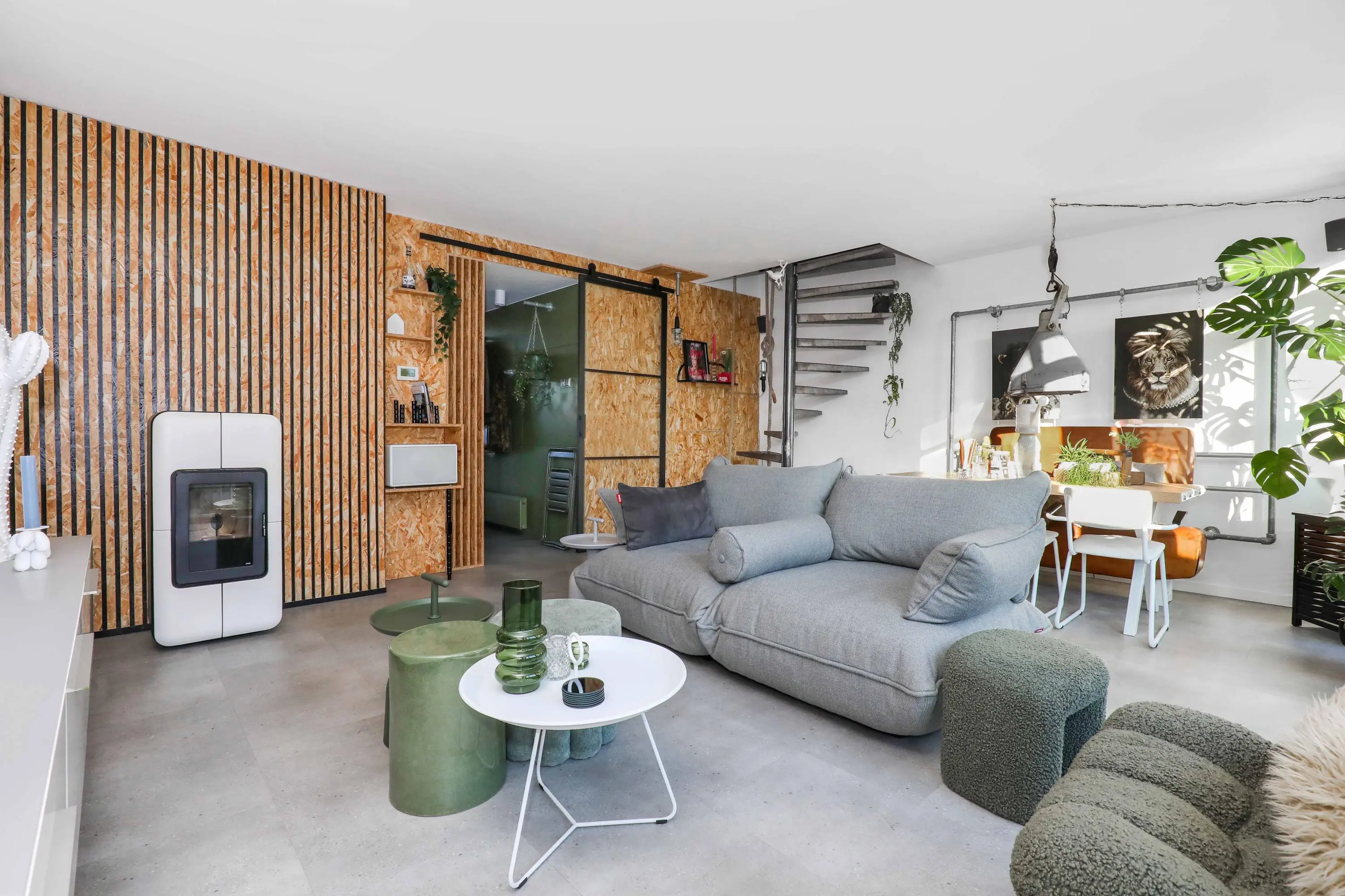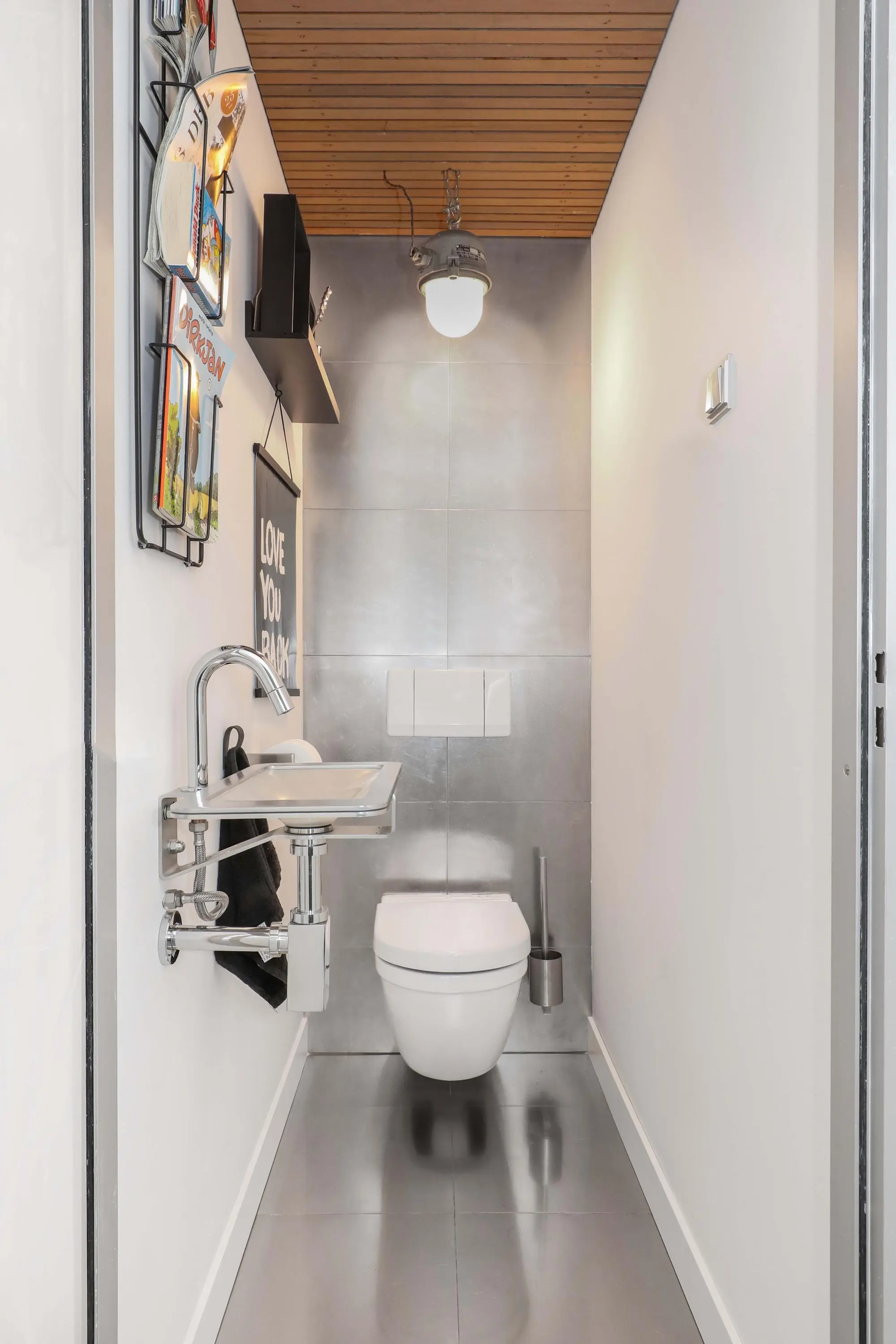 Begane grond: entree/hal met open doorgang naar de separate keuken aan de voorzijde van de woning. De basis van de keuken is geplaatst in 2003, maar de fronten zijn in 2024 gewrapt waardoor de keuken een moderne look heeft en er is diverse inbouwapparatuur aanwezig. In de hal bevindt zich tevens de toiletruimte en er is middels een industriële stalen schuifdeur (2023) toegang tot de woonkamer aan de achterzijde van de woning. Deze ruimte biedt een zee van daglicht door de enorme raampartij met schuifpuien naar de achtertuin en beschikt over een sfeervolle pelletkachel (ter overname). Hier bevindt zich tevens de stoere stalen wenteltrap naar de verdieping. De gehele begane grond is v.v. een onderhoudsarme PVC-vloer (2023).