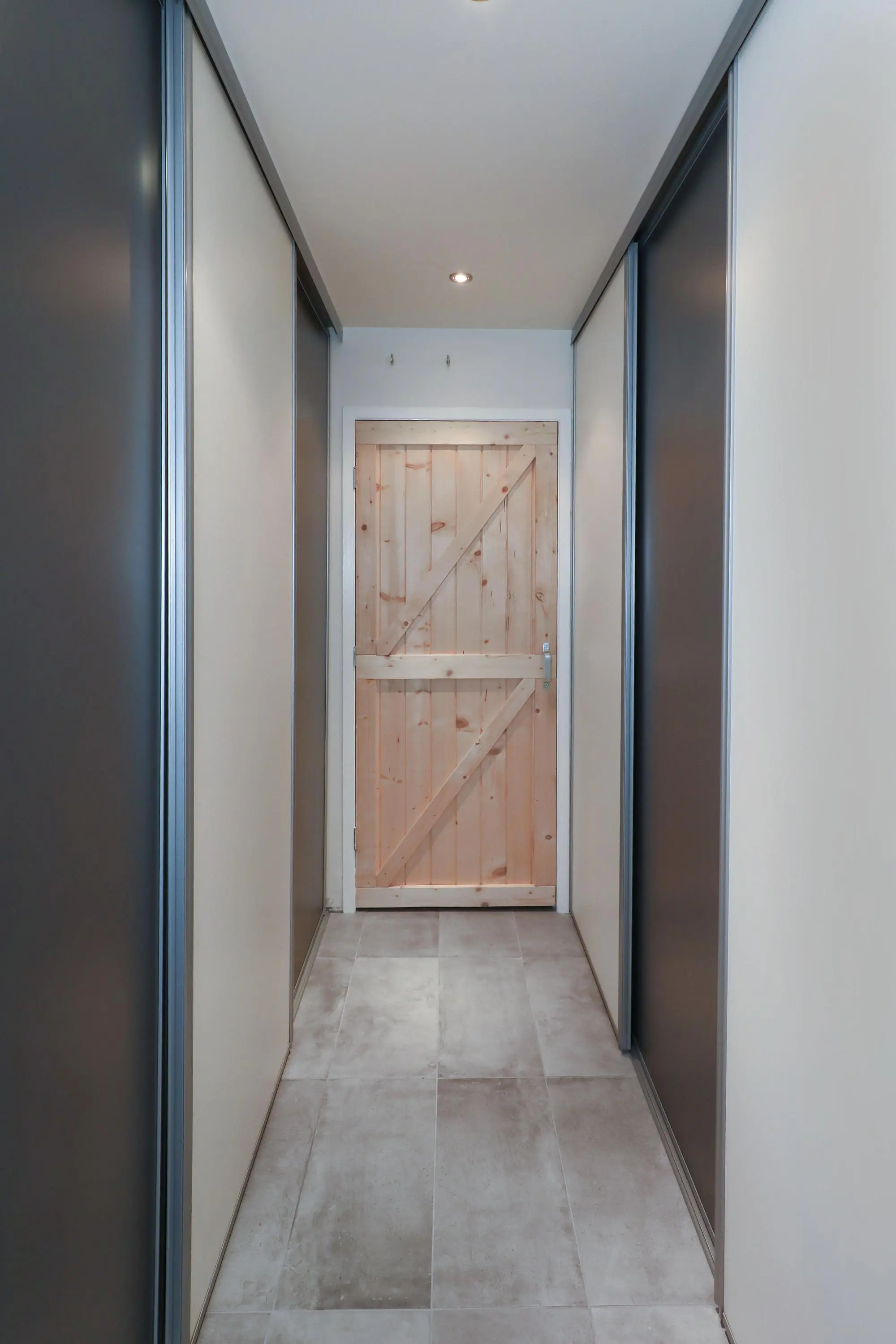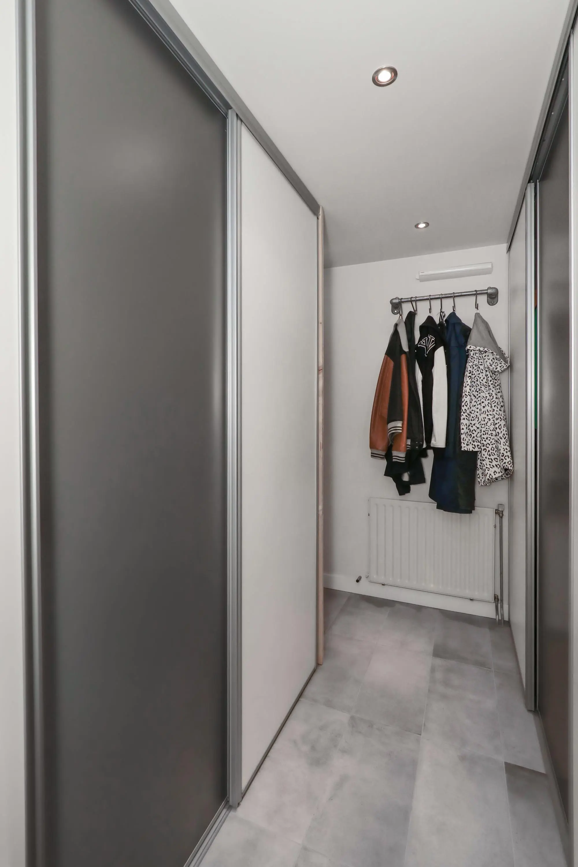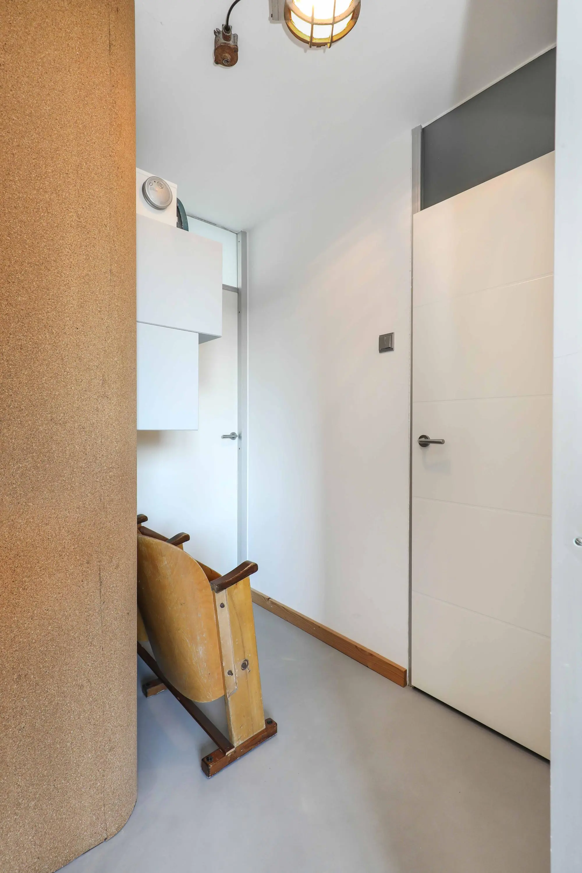 Aan de voorzijde van de woning, naast de entree, is de inpandige berging te bereiken. Deze is aan beide zijden v.v. praktische vaste kasten en geeft toegang tot de wasruimte met voldoende ruimte voor de wasmachine- en drogeropstelling.