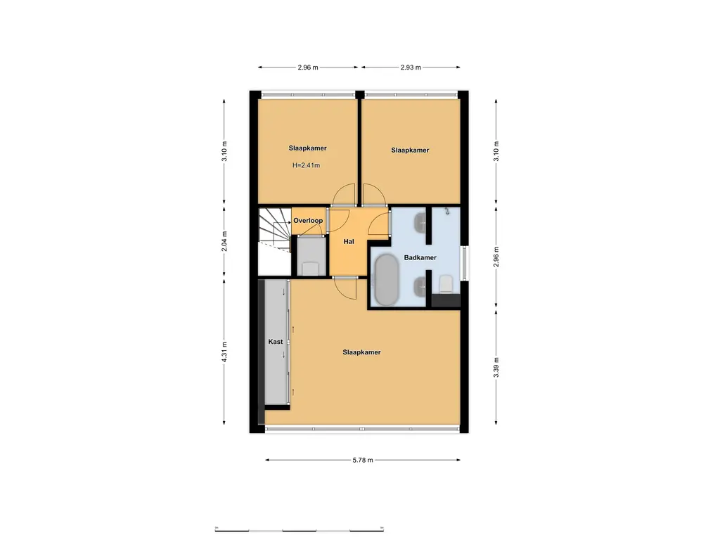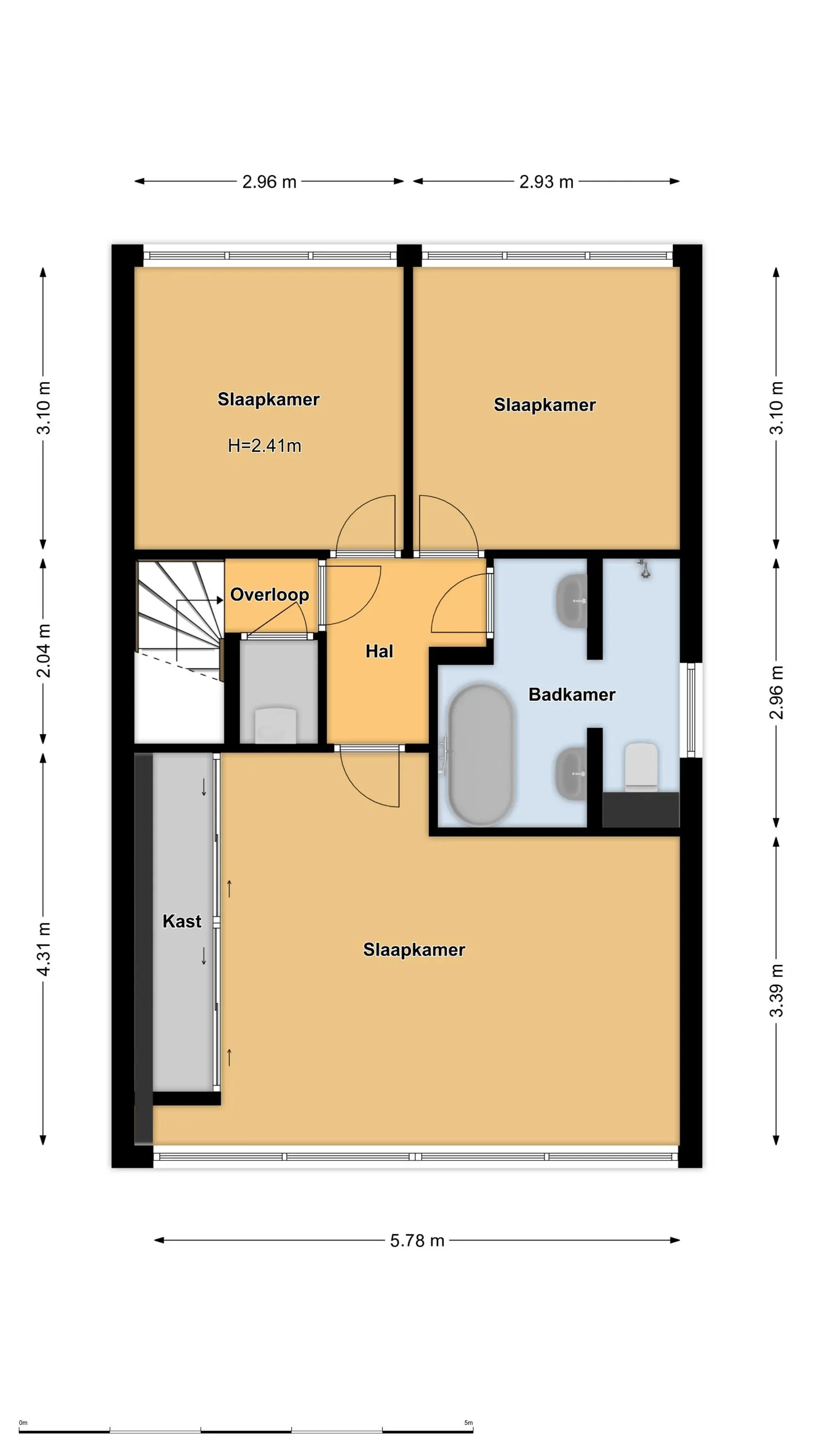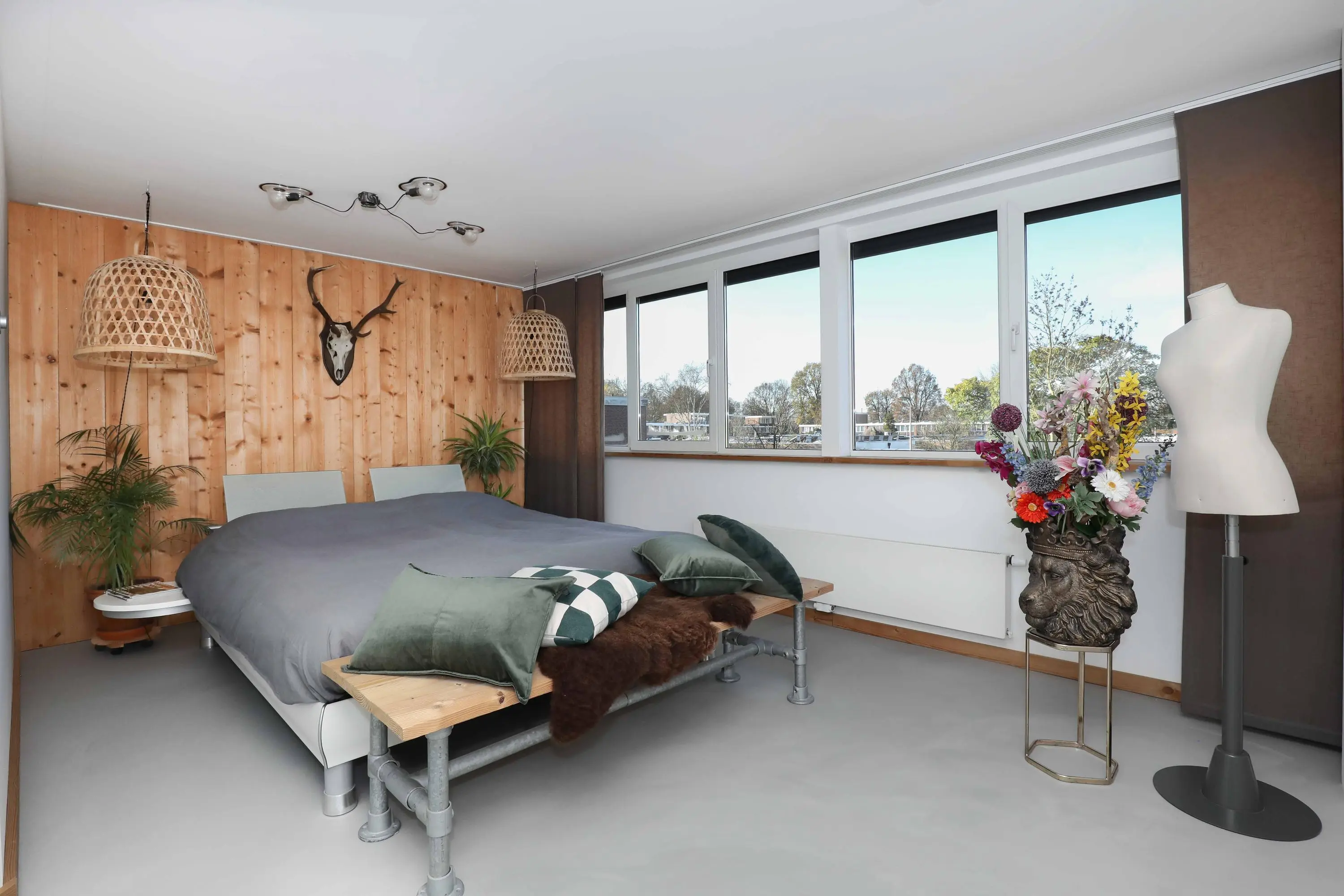 Verdieping: gehele verdieping v.v. gietvloer. Overloop met vaste kast v.v. C.V.-installatie (2011), toegang tot de hal met twee vergelijkbare slaapkamers aan de achterzijde van de woning en een royale derde slaapkamer aan de voorzijde met praktische vaste kastenwand, airconditioning en over de gehele breedte v.v. een screen. De ruime badkamer is compleet, beschikt over een ligbad, inloopdouche, toilet, twee wastafels en vloerverwarming.