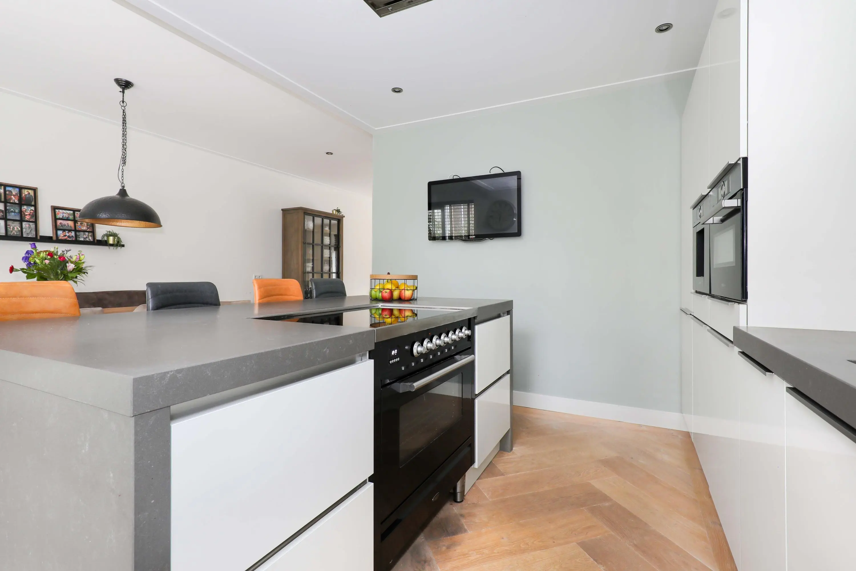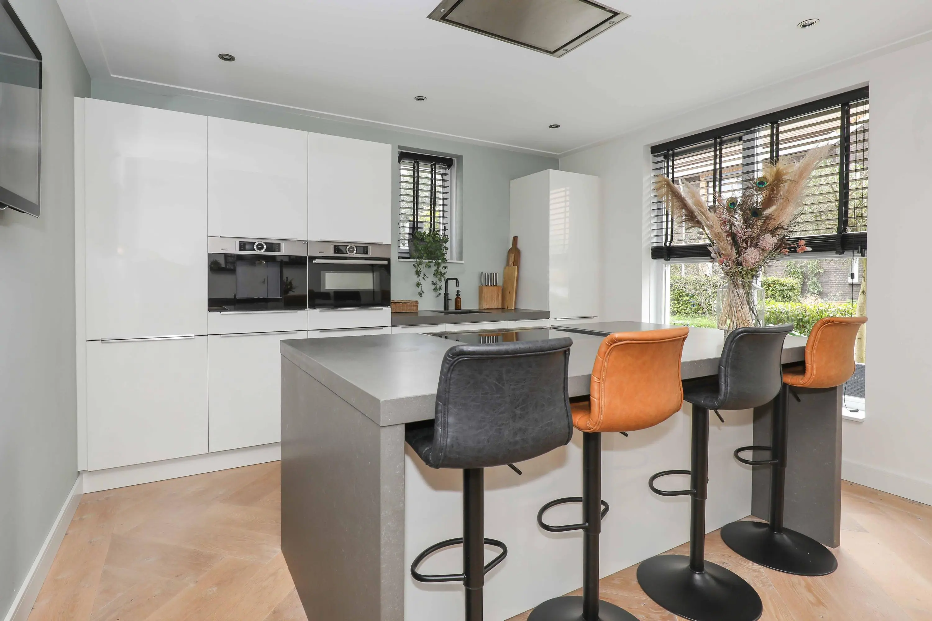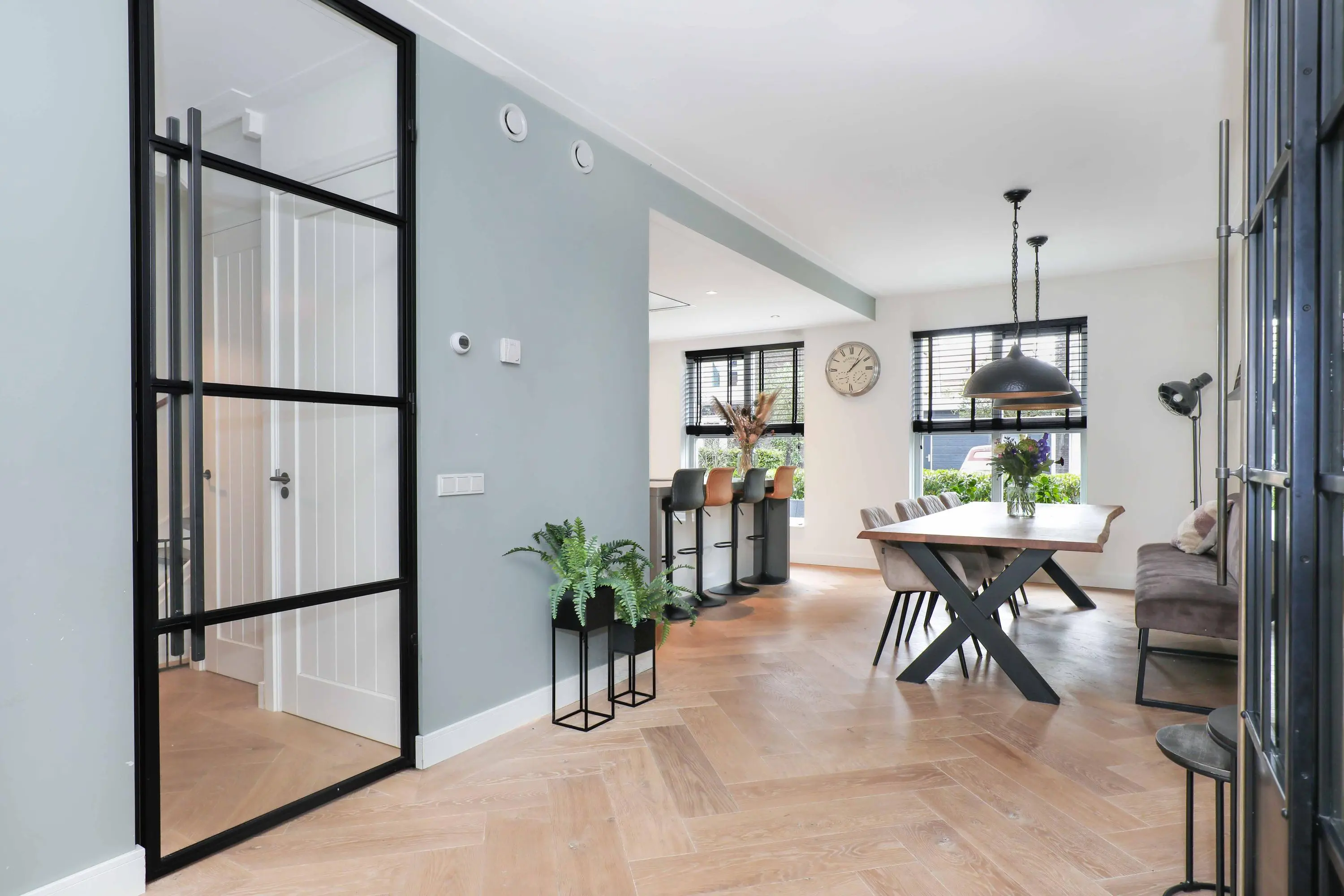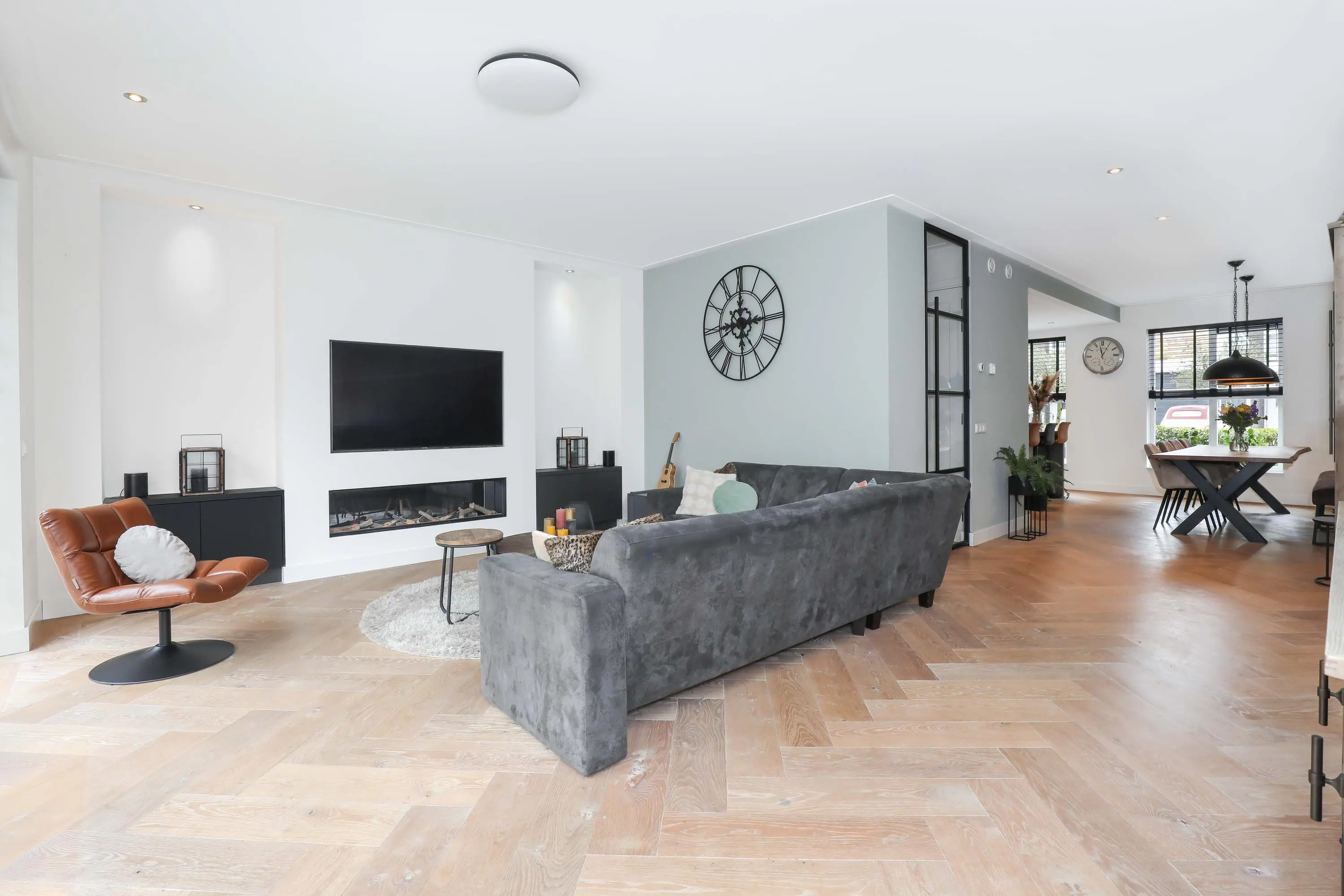 Begane grond: entree met garderobe, meterkast, modern toilet en trapopgang naar de eerste verdieping. Vanuit de hal betreed je de lichte en sfeervolle living aan de achterzijde van de woning. Deze leefruimte is heerlijk ruim, voorzien van een houtenvloerdelen in visgraat gelegd met vloerverwarming, strakke wandafwerking en grote raampartijen die voor veel natuurlijk licht zorgen. De open keuken bevindt zich aan de voorzijde en is ingericht in een eigentijdse stijl en van alle gemakken voorzien. Een heerlijke plek om te koken en te tafelen met vrienden en familie.