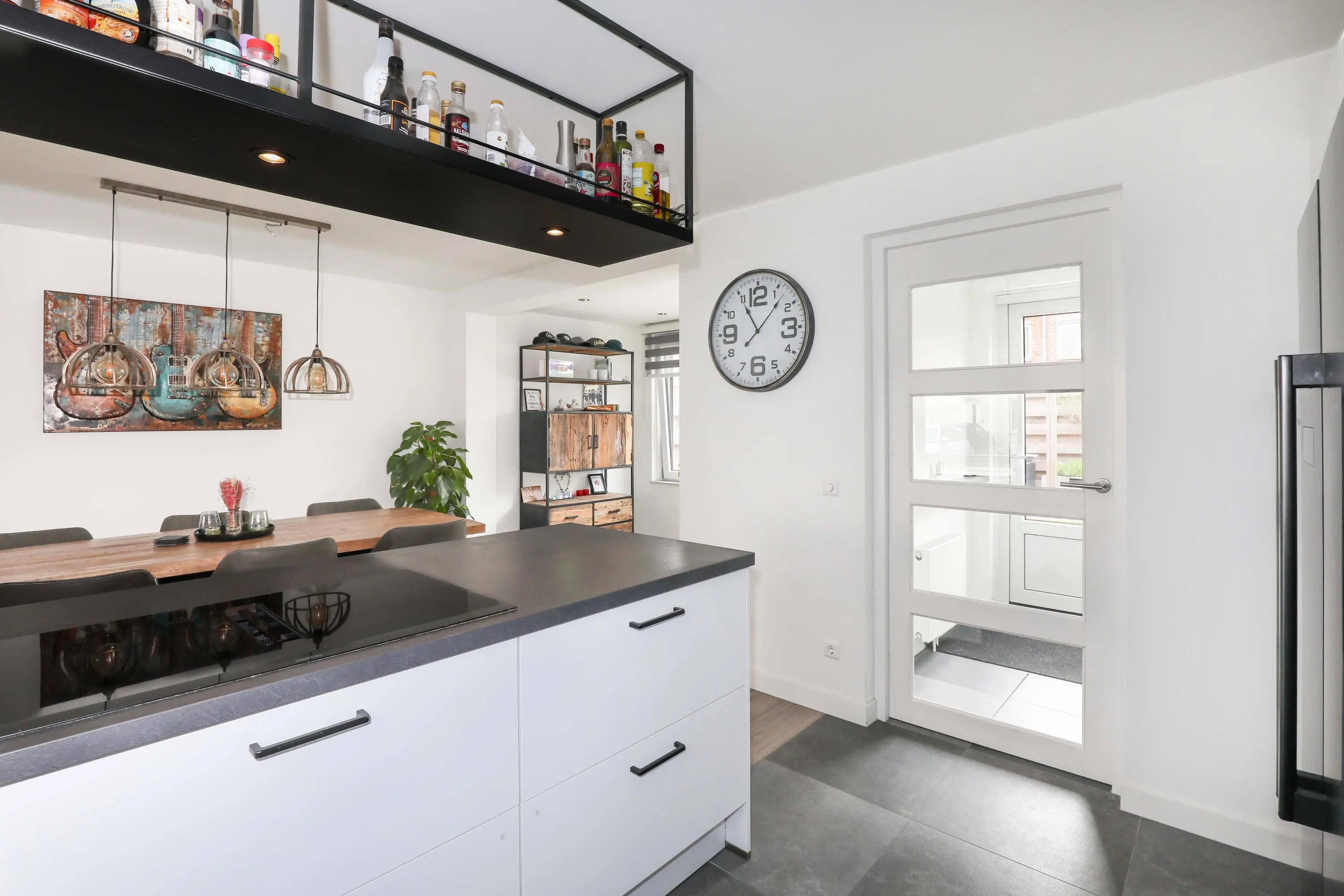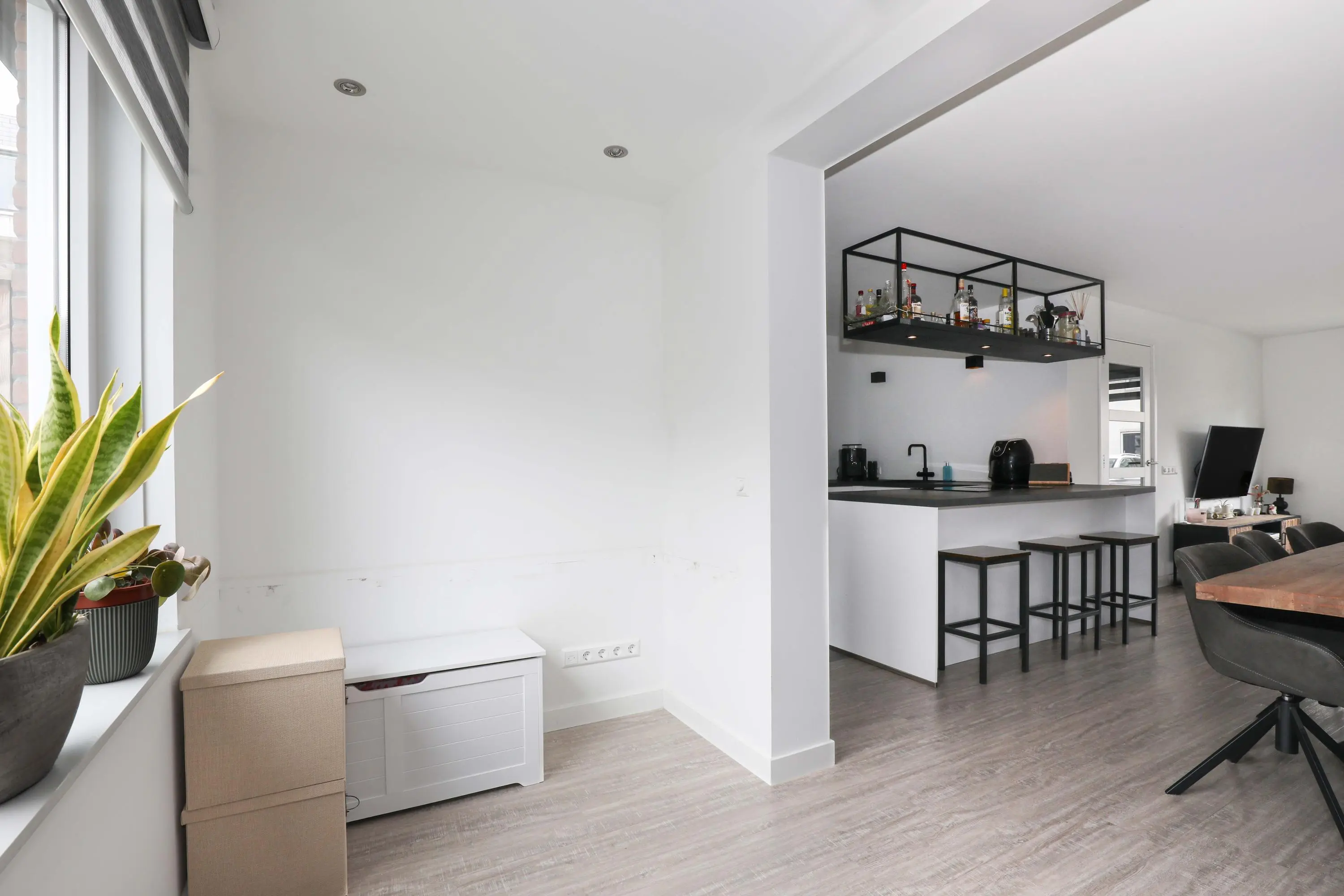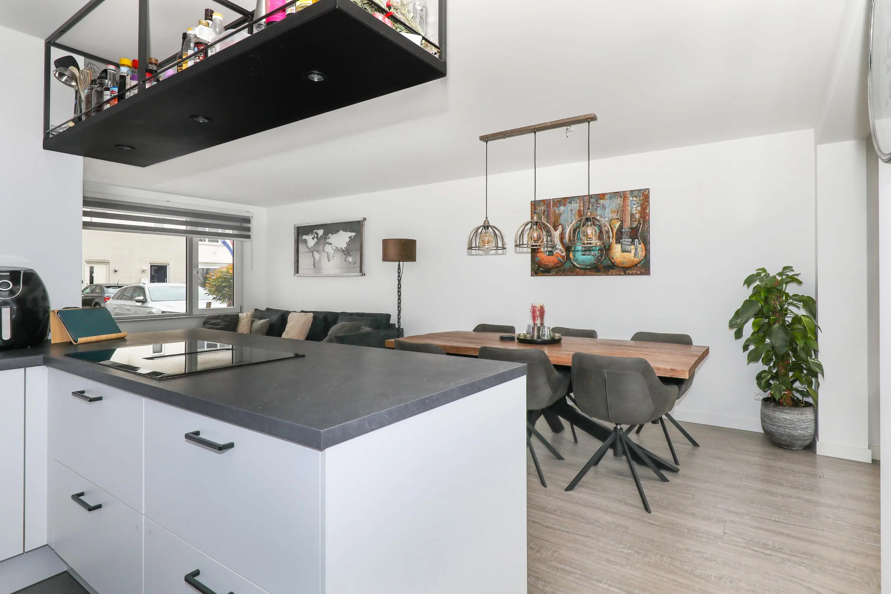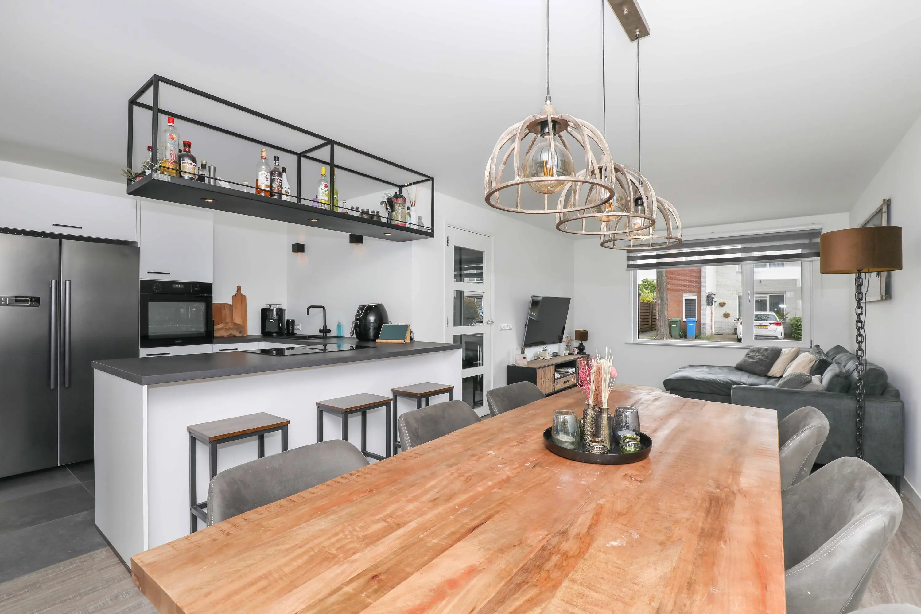 Begane grond: ruime entree/hal met meterkast, toiletruimte, trapopgang naar de verdieping en toegang tot de lichte leefruimte. De woonkamer is gelegen aan de voorzijde en sfeervol ingericht. Aan de achterzijde is een gezellige eetkamer gecreëerd én in de aanbouw is ruimte voor bijvoorbeeld een werkplek of kinderspeelplaats. De riante leefkeuken is praktisch opgesteld en voorzien van diverse apparatuur zoals: een Amerikaanse koel-/vriescombinatie (ter overname), combi-oven/magnetron, inductiekookplaat met geïntegreerde afzuiging, vaatwasser en spoelbak met kokend waterkraan. In de uitbouw is tevens een bijkeuken gecreëerd met vaste kast; ideaal voor schoenen en/of jassen. Vanuit hier is er toegang tot de achtertuin. De begane grond is grotendeels (m.u.v. de bijkeuken) voorzien van comfortabele vloerverwarming en een fraaie, onderhoudsarme PVC-vloer.
