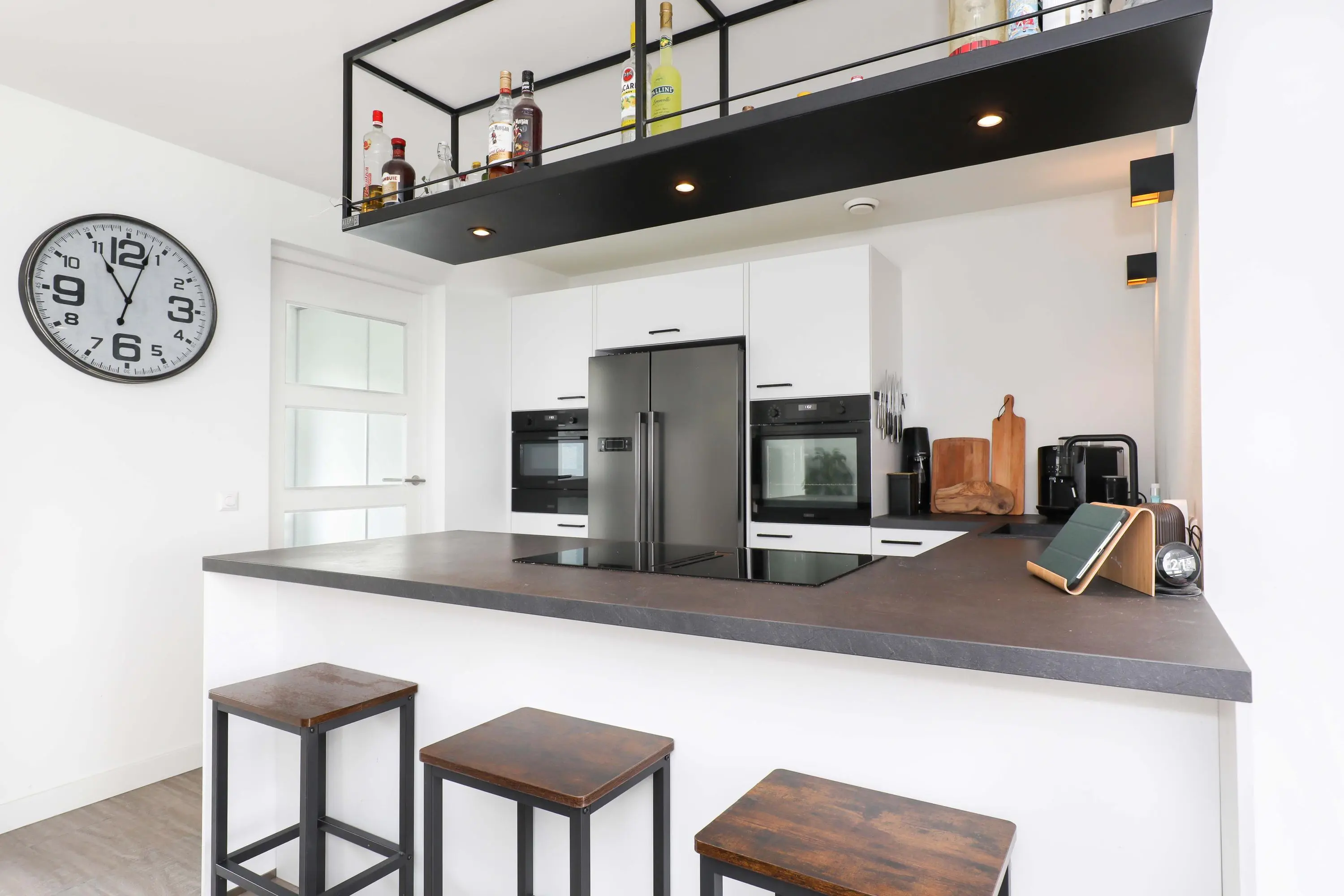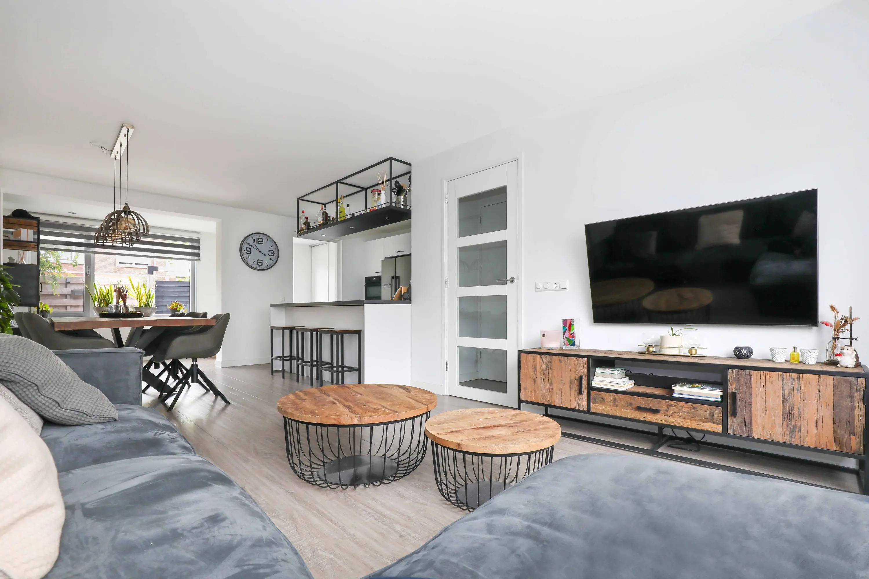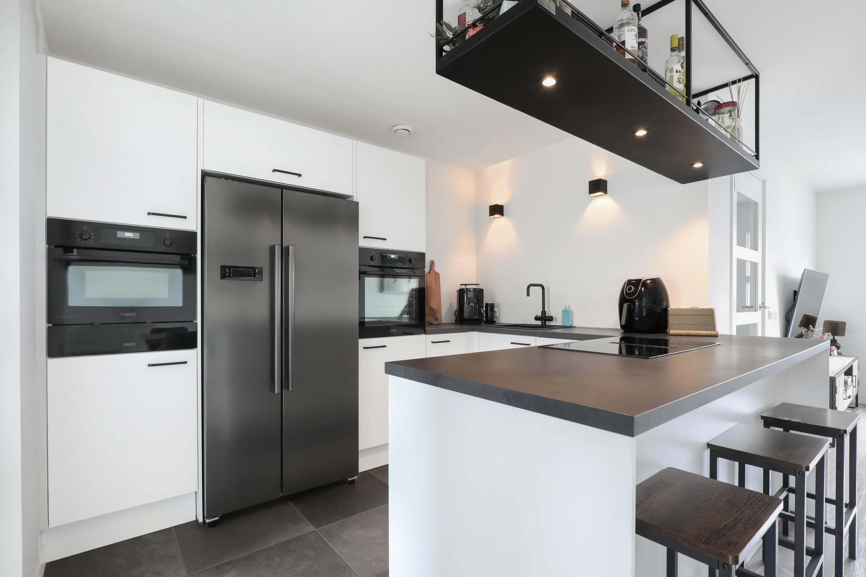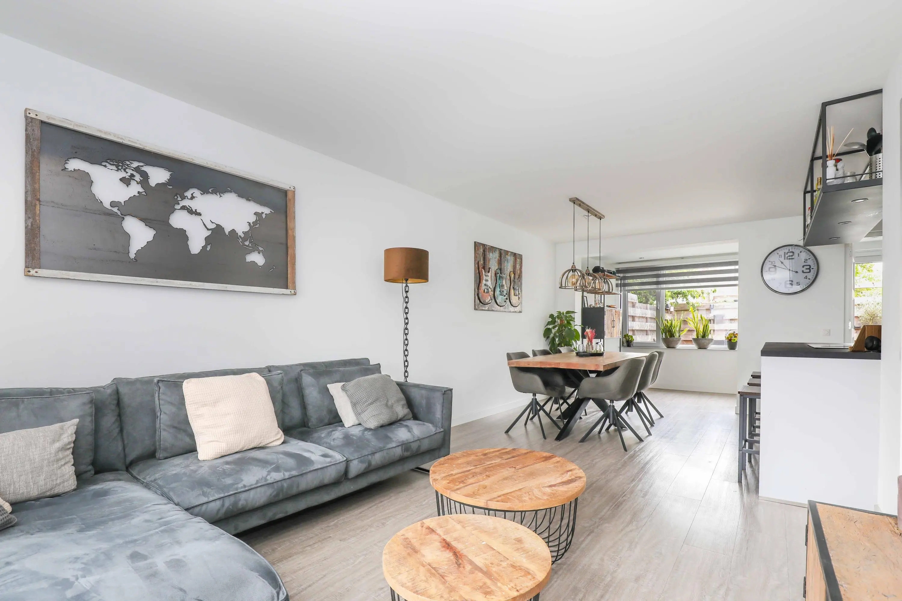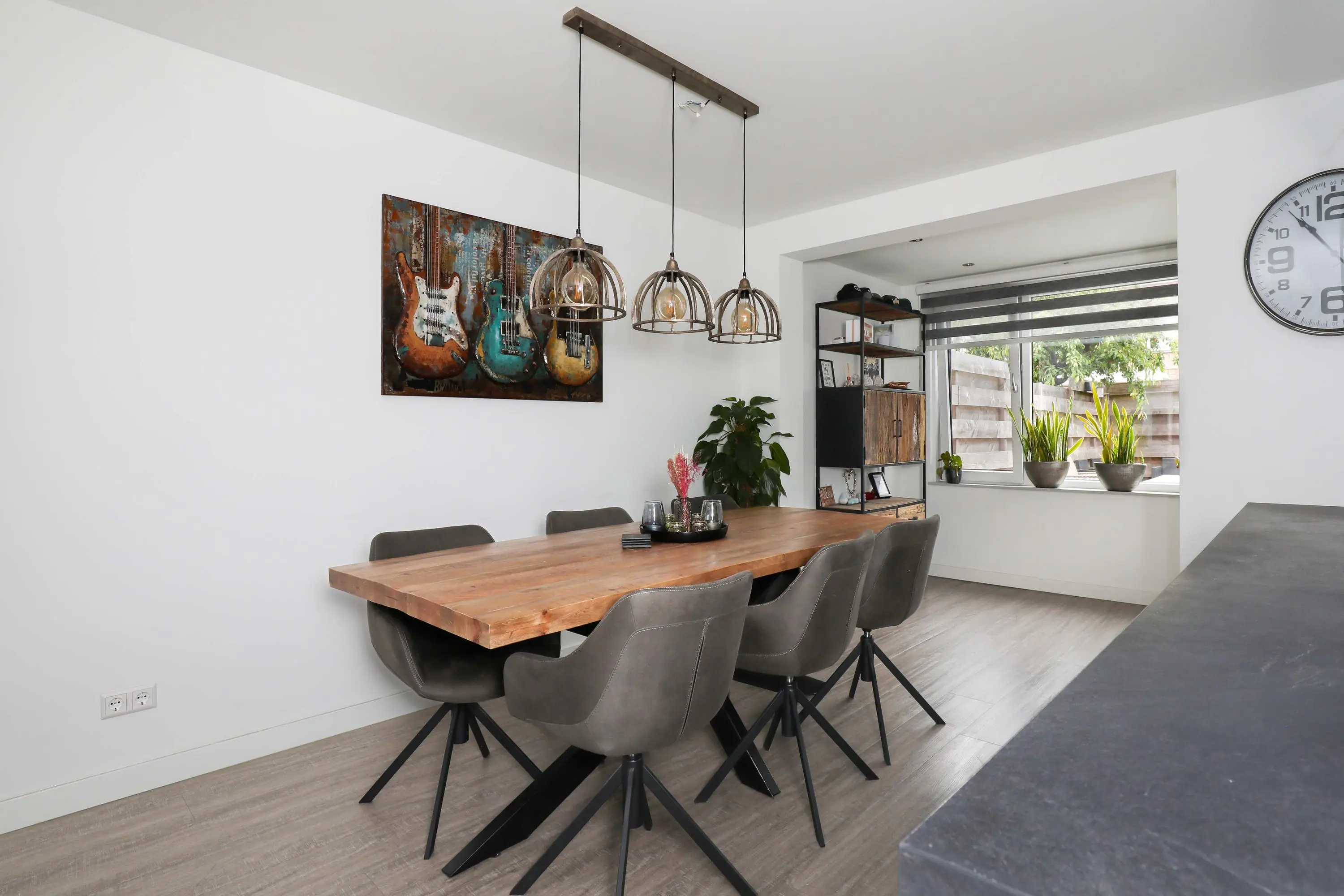 Begane grond: ruime entree/hal met meterkast, toiletruimte, trapopgang naar de verdieping en toegang tot de lichte leefruimte. De woonkamer is gelegen aan de voorzijde en sfeervol ingericht. Aan de achterzijde is een gezellige eetkamer gecreëerd én in de aanbouw is ruimte voor bijvoorbeeld een werkplek of kinderspeelplaats. De riante leefkeuken is praktisch opgesteld en voorzien van diverse apparatuur zoals: een Amerikaanse koel-/vriescombinatie (ter overname), combi-oven/magnetron, inductiekookplaat met geïntegreerde afzuiging, vaatwasser en spoelbak met kokend waterkraan. In de uitbouw is tevens een bijkeuken gecreëerd met vaste kast; ideaal voor schoenen en/of jassen. Vanuit hier is er toegang tot de achtertuin. De begane grond is grotendeels (m.u.v. de bijkeuken) voorzien van comfortabele vloerverwarming en een fraaie, onderhoudsarme PVC-vloer.