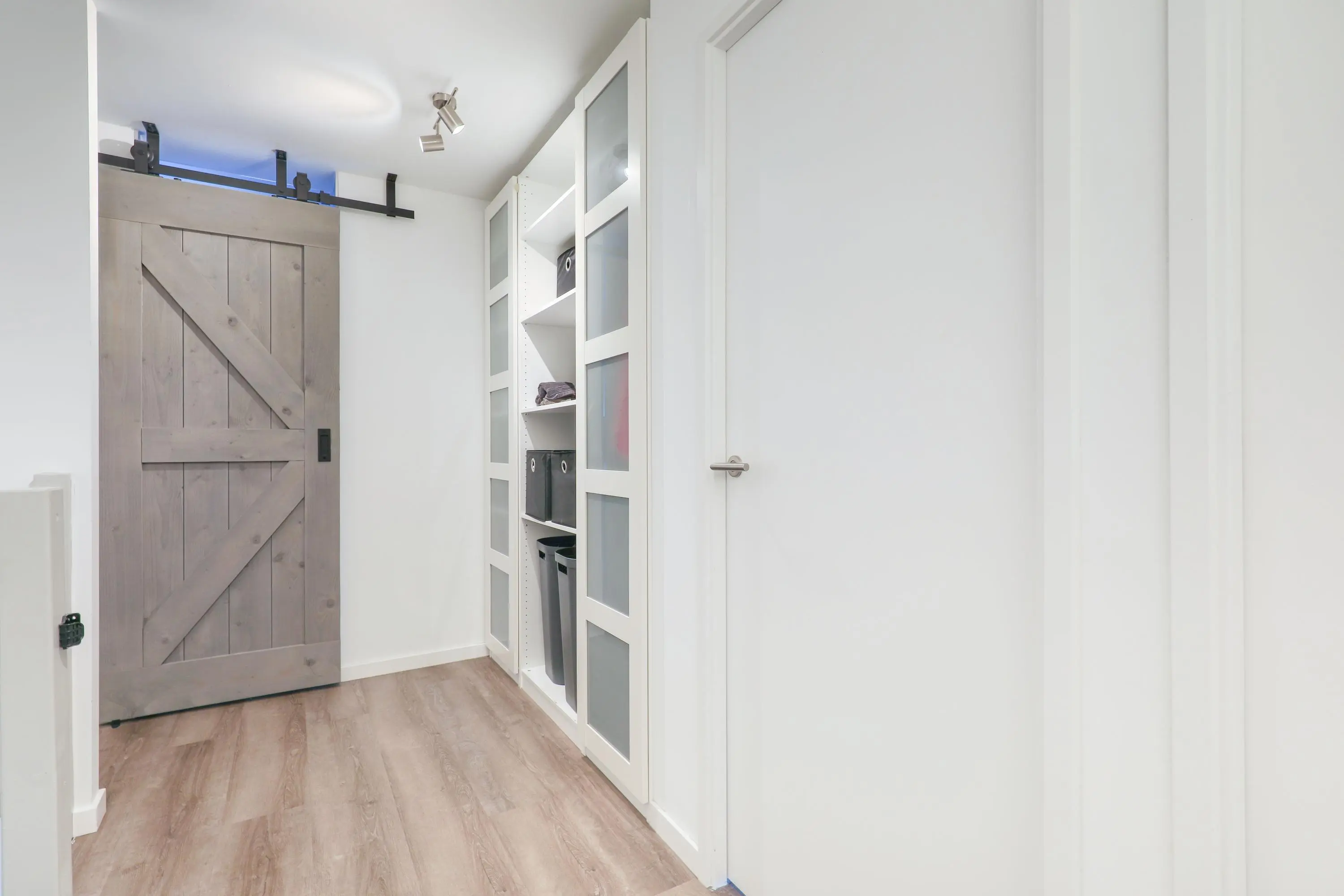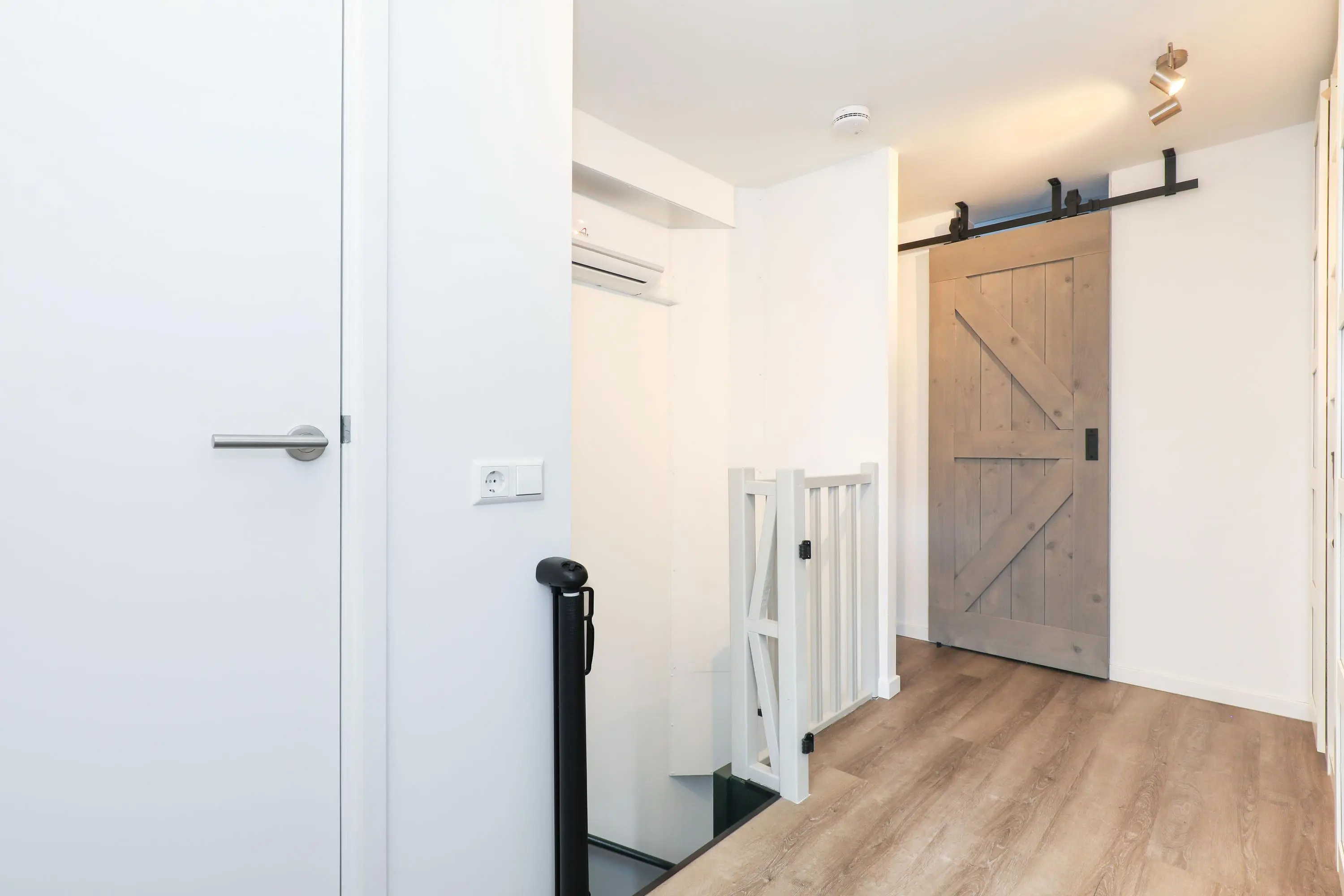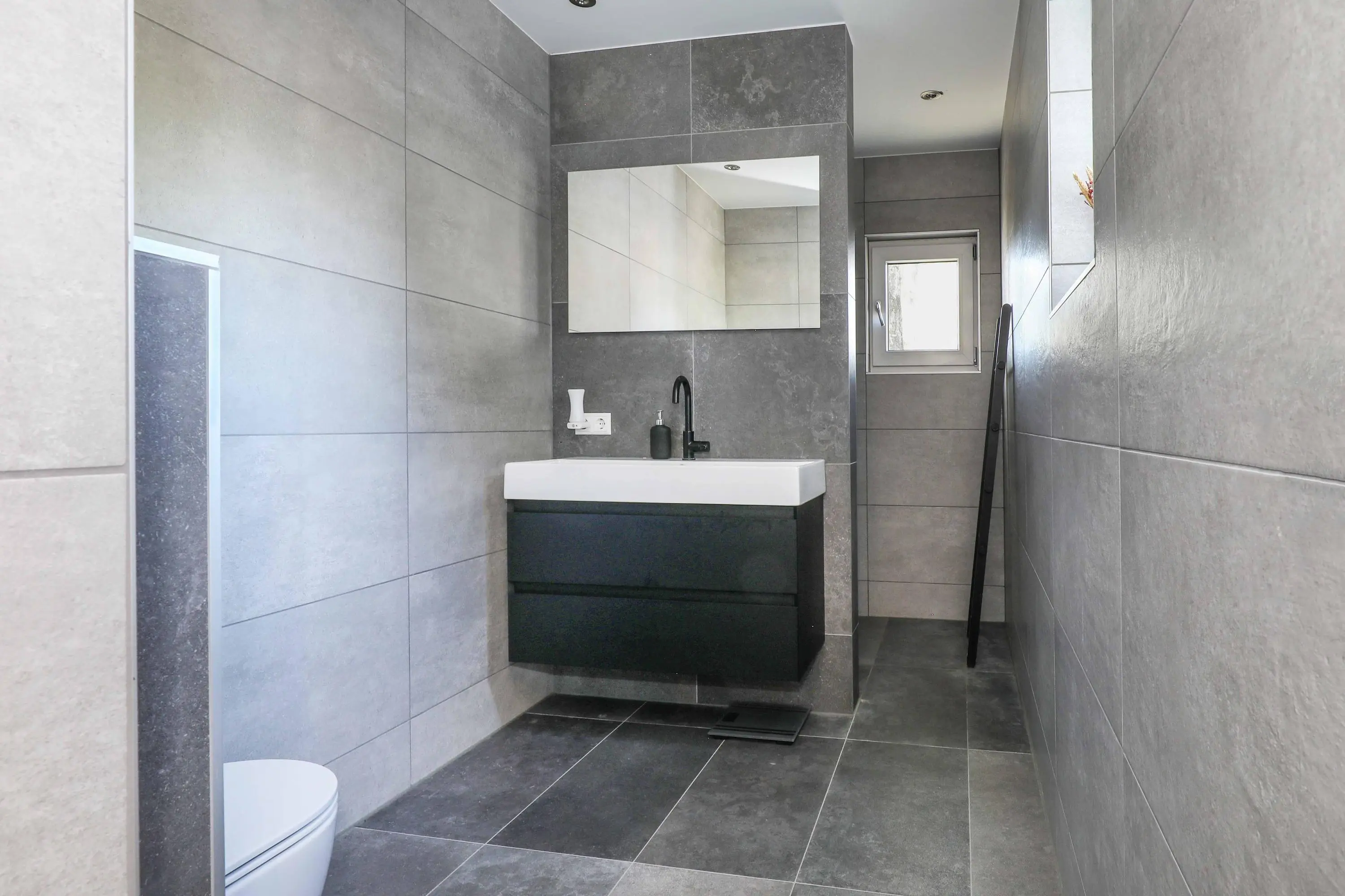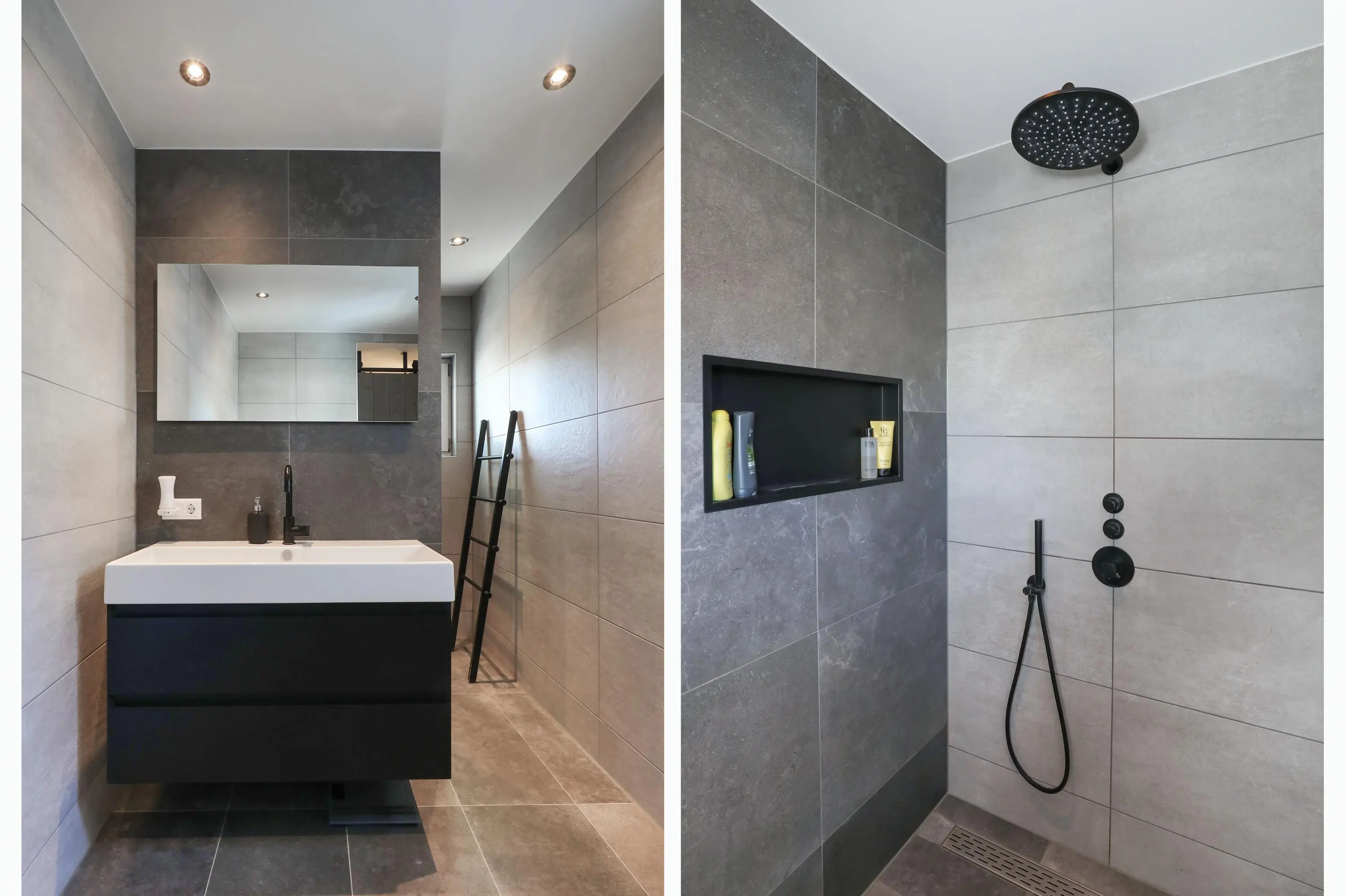 Verdieping: overloop met ruimte voor de wasmachine-/drogeropstelling, vaste kast v.v. C.V.-installatie, twee in grootte variërende slaapkamers aan de achterzijde en een derde slaapkamer aan de voorzijde. Door uitbouw op deze verdieping aan de voorzijde is er een royale badkamer gecreëerd (2021) met ruime inloopdouche, toilet, wastafelmeubel en eveneens comfortabele vloerverwarming.