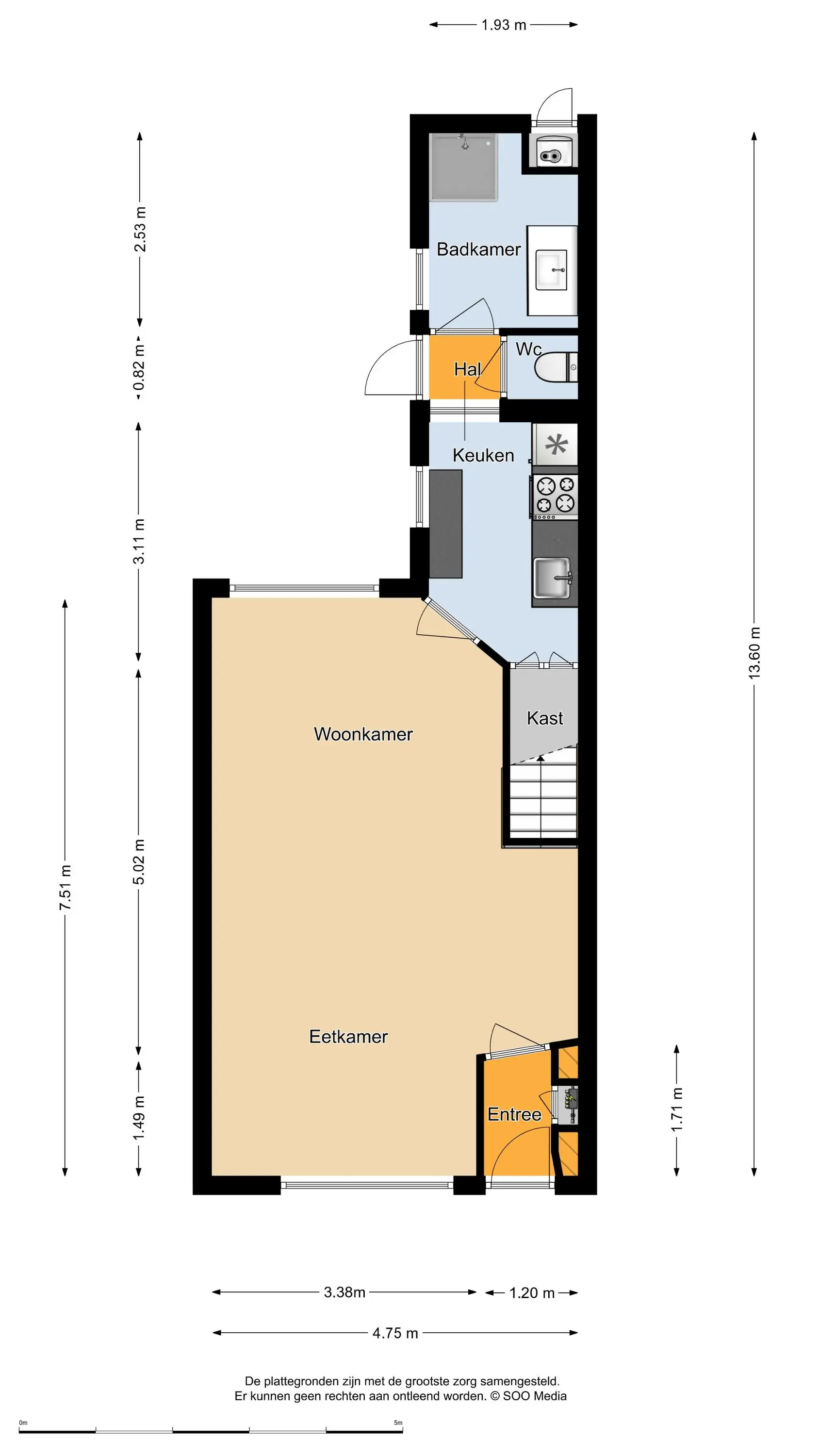 Begane grond: entree/hal met meterkast en toegang tot de lichte leefruimte met trapopgang naar de verdieping. De woonkamer is op verschillende manieren in te richten, beschikt over grote raampartijen met voldoende daglicht en een laminaatvloer. De dichte keuken bevindt zich aan de achterzijde van de woning, is modern (2020) en beschikt over een koelkast, combi-oven, gaskookplaat, afzuigkap, spoelbak met Quooker, vaatwasser en voldoende bergruimte. Vanuit hier is tevens de praktische kelderkast te bereiken. Vanuit de keuken bereik je een tweede hal met toegang tot de achtertuin, separate toiletruimte en de badkamer (2020) v.v. douche, wastafelmeubel en comfortabele vloerverwarming.