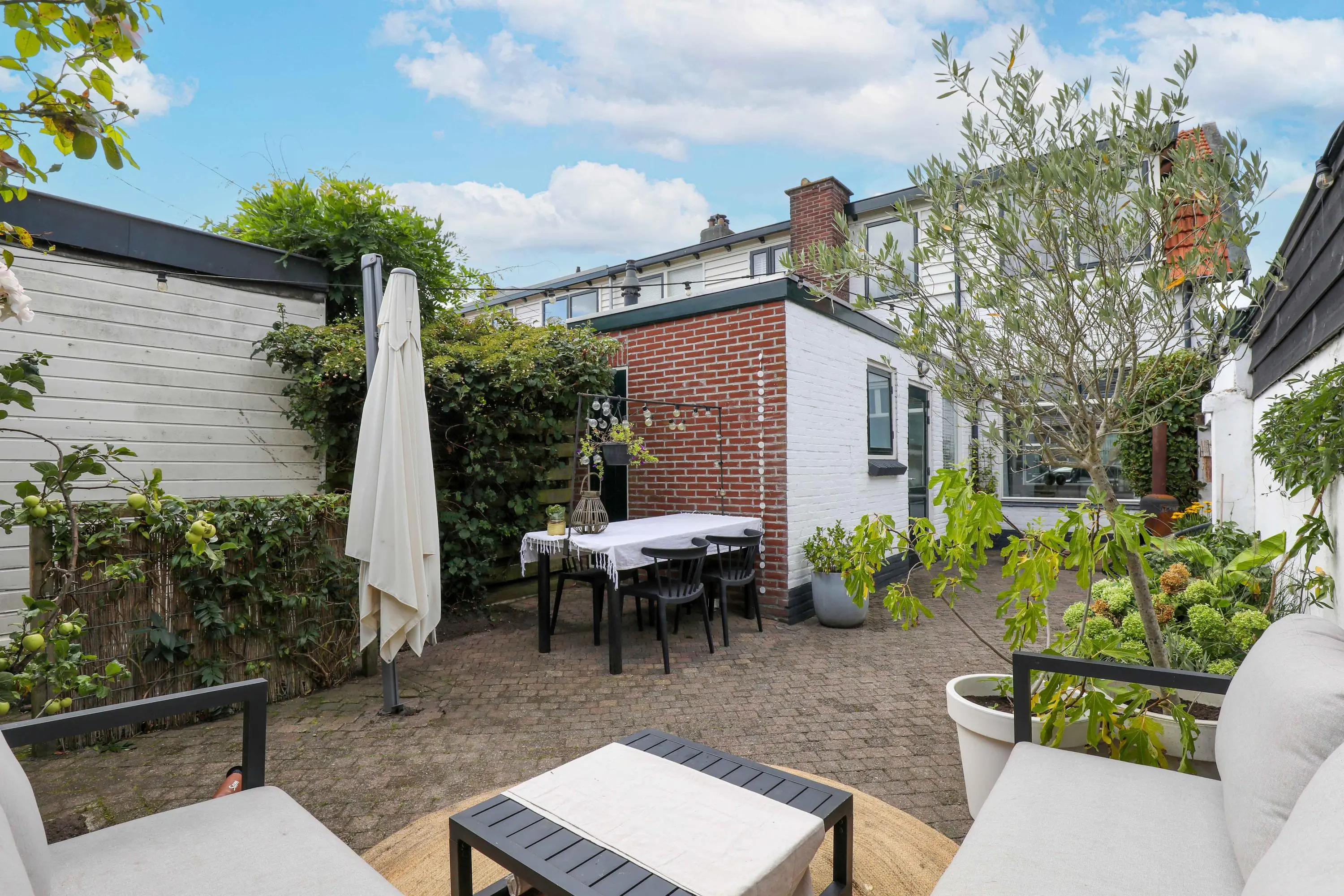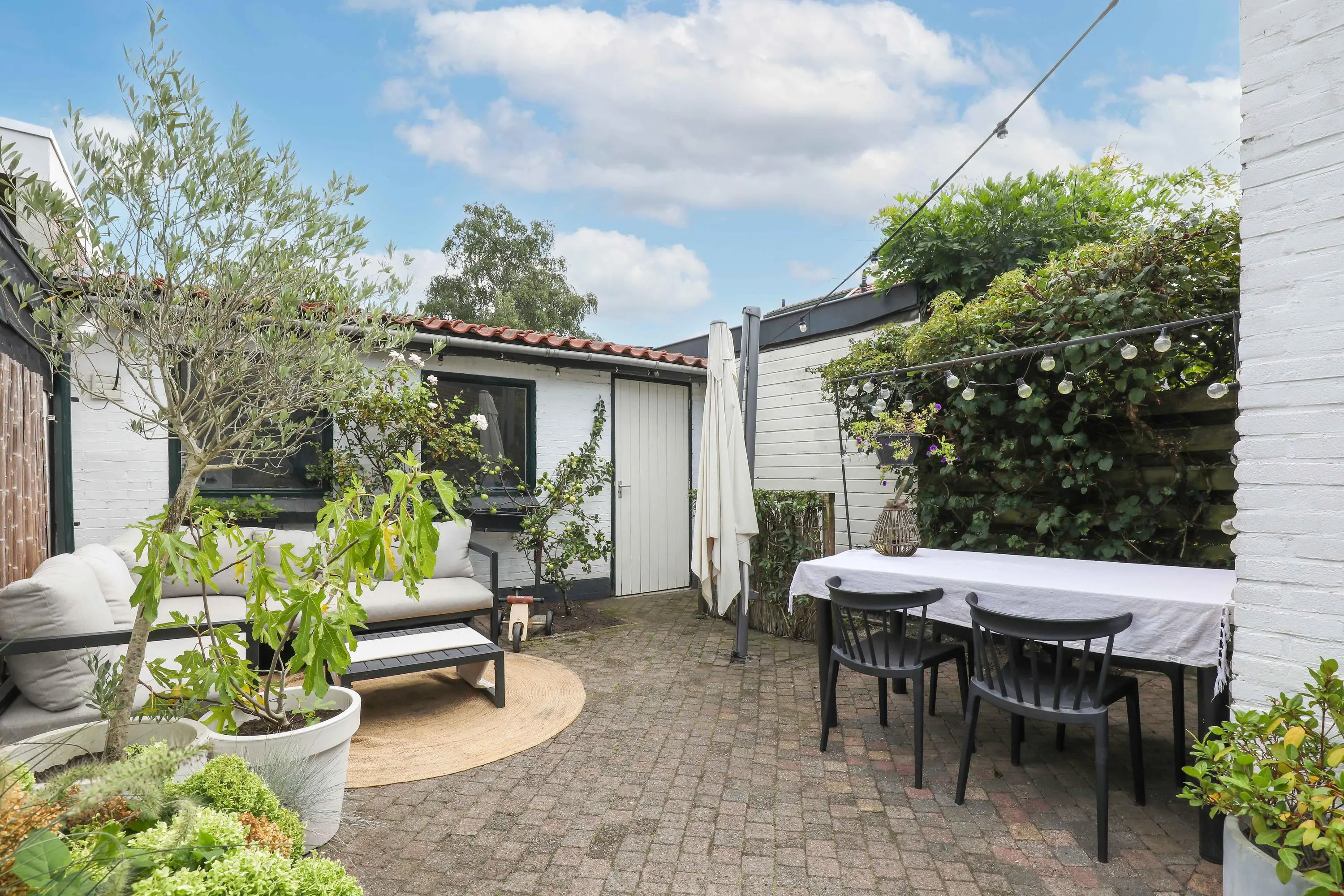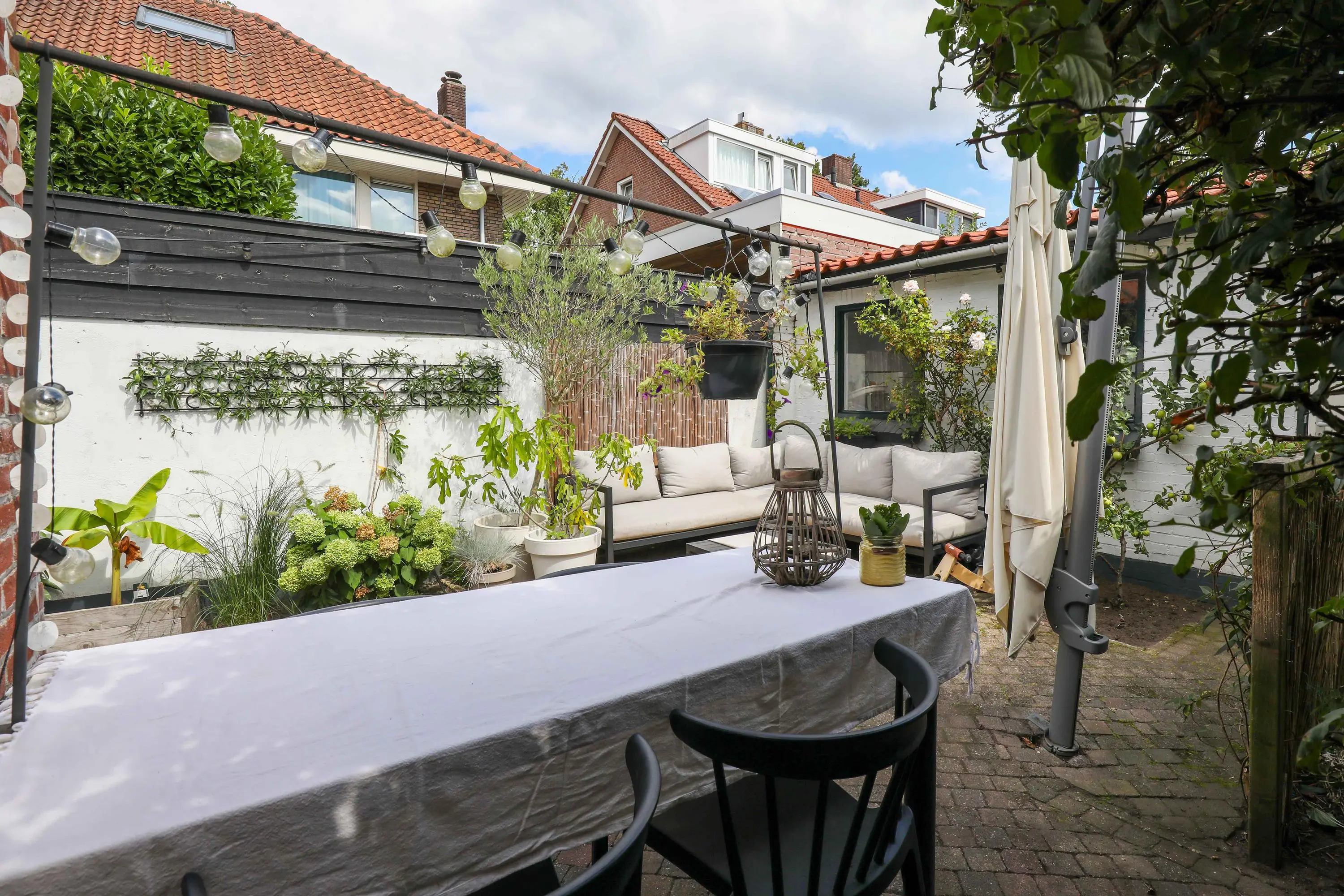 Tuin en ruime berging: de achtertuin is sfeervol en onderhoudsvriendelijk aangelegd en gelegen op het oosten. Er zijn verschillende terrassen aanwezig zodat er op zomerse dagen op diverse momenten zowel in een plek in de zon als in de schaduw te vinden is. De ruime berging achterin de tuin biedt ruimte voor het stallen van o.a. fietsen en tuingereedschap, maar hier bevindt zich ook de aansluiting voor wasmachine en droger. De berging is middels een achterom via de steeg achter het huis te bereiken.