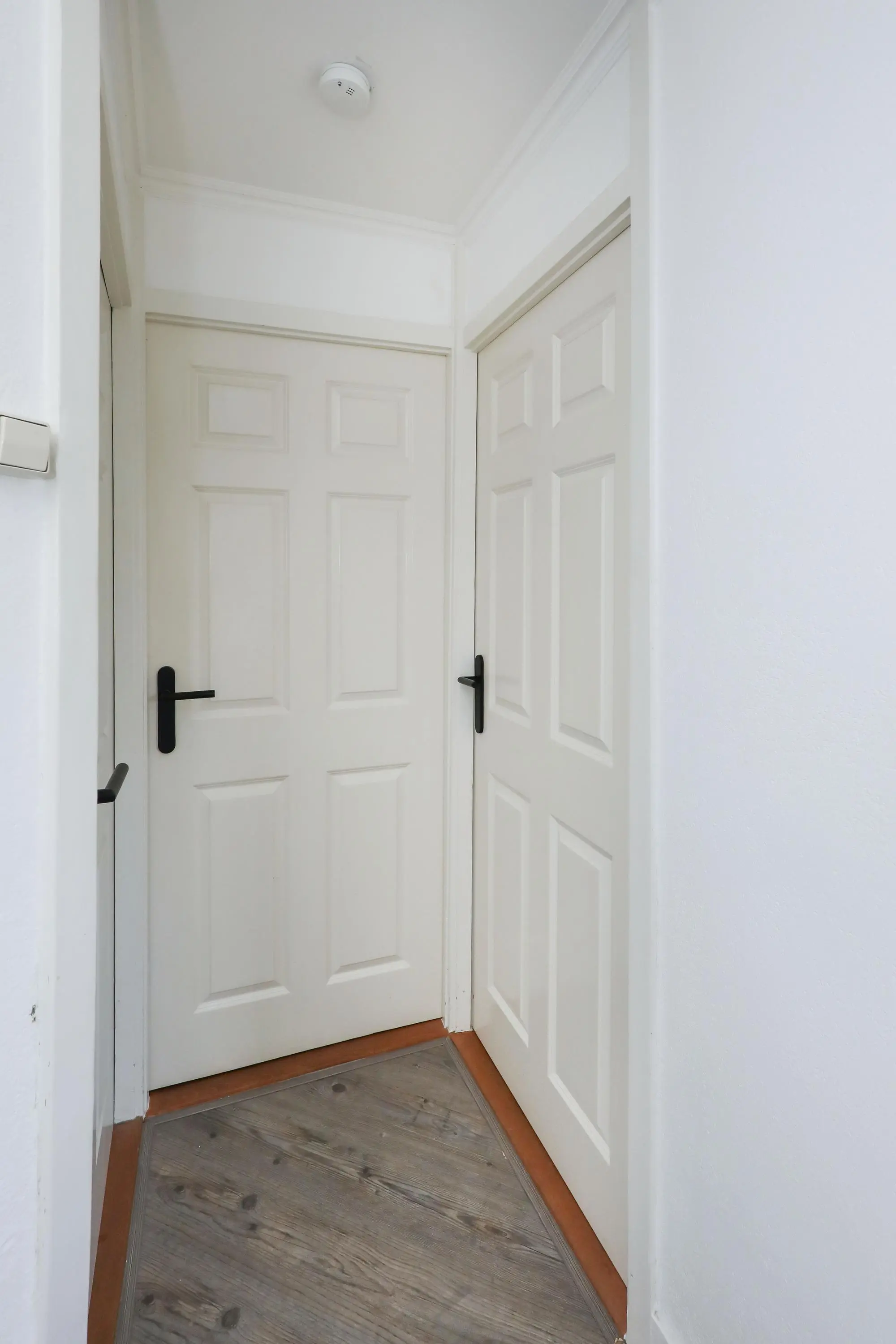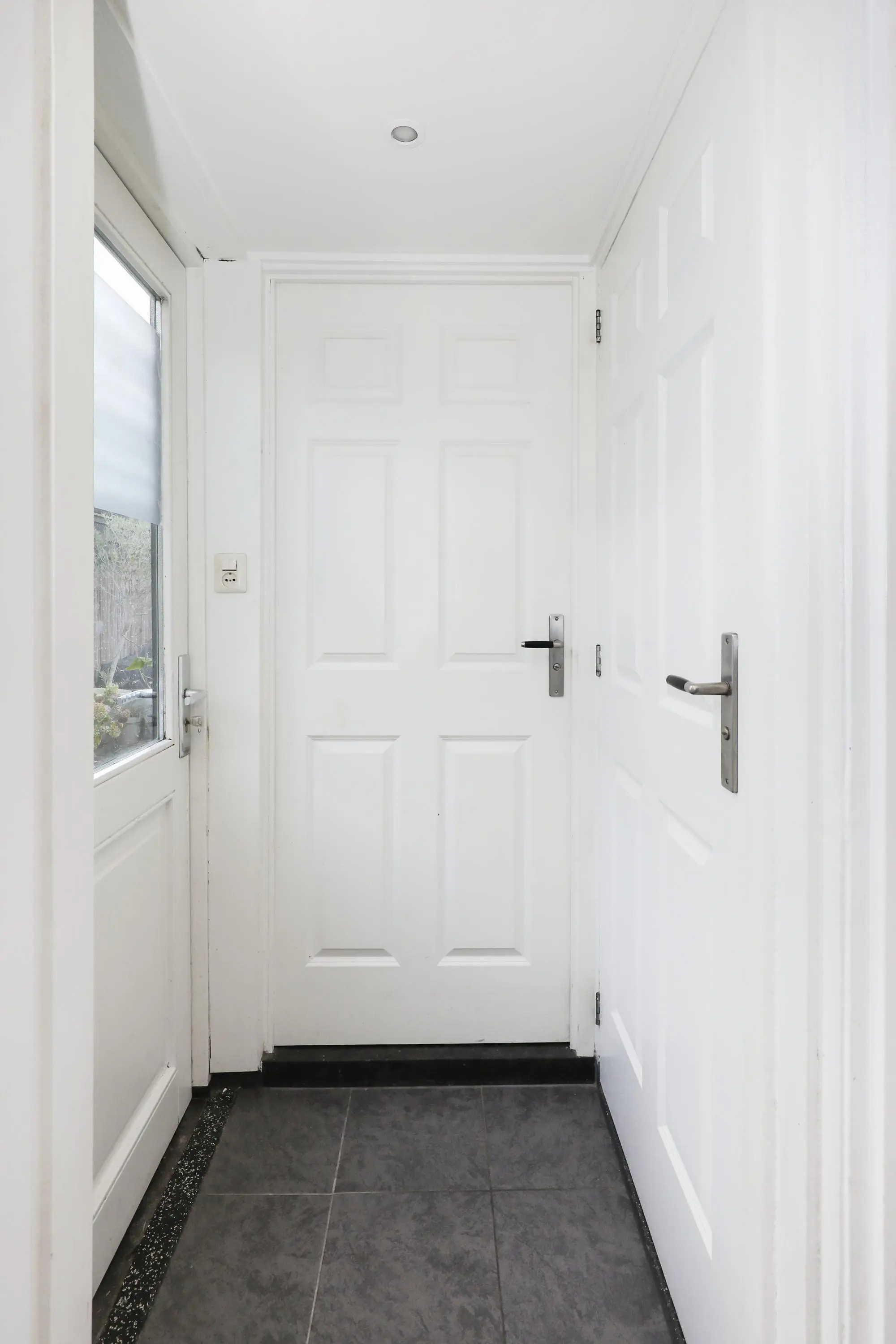 Verdieping: overloop met vlizotrap naar praktische bergvliering, twee vergelijkbare slaapkamers aan de voorzijde beide v.v. vaste kasten en een dakkapel, derde slaapkamer aan de achterzijde eveneens v.v. dakkapel. Deze verdieping beschikt over een keurige laminaatvloer en houten deuren met chique, zwart deurbeslag.
