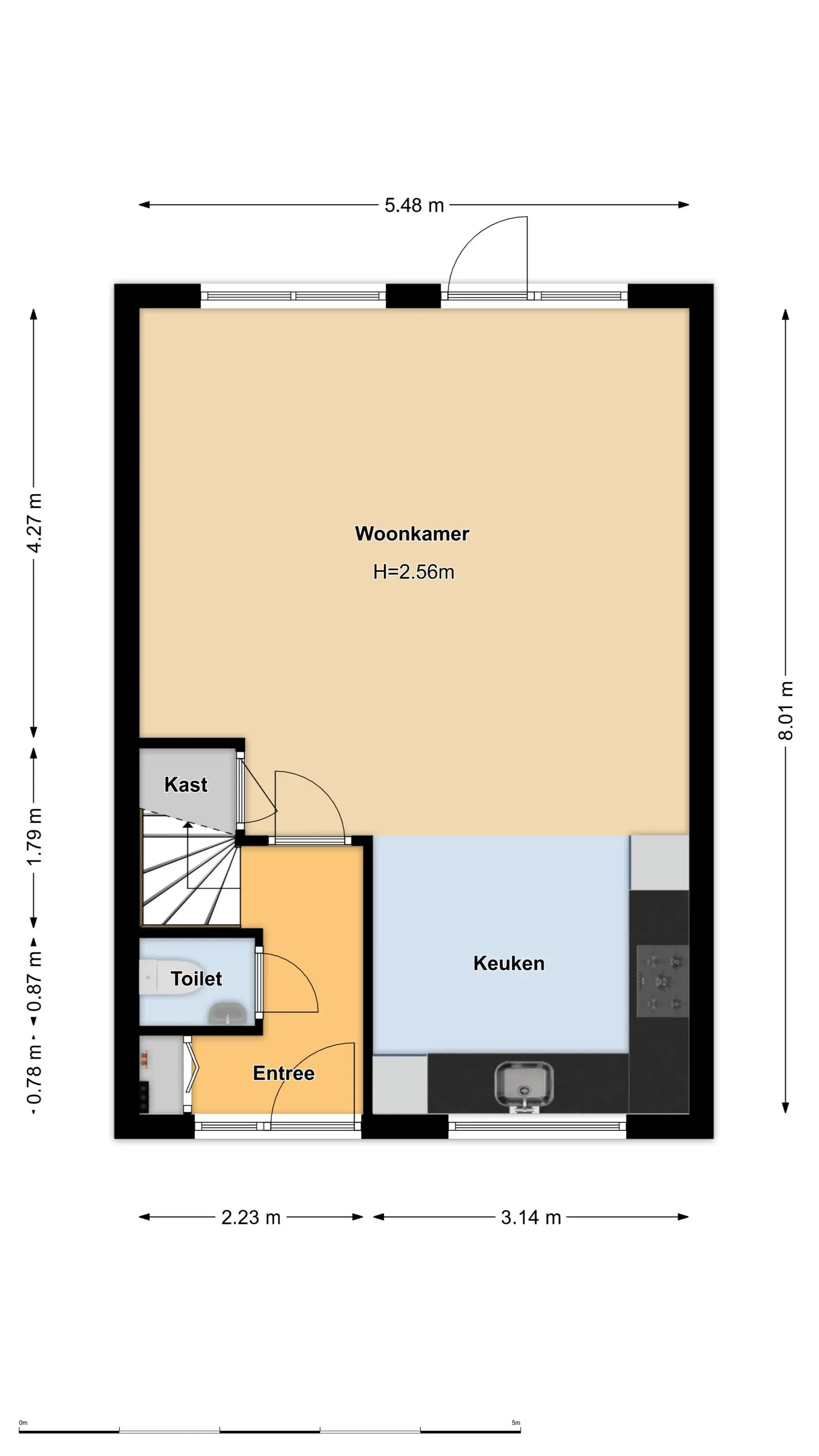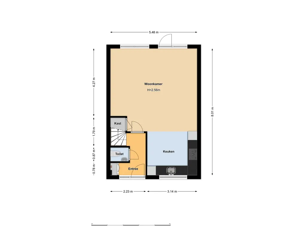 Begane grond: entree/hal met meterkast, toiletruimte, trapopgang naar 1e verdieping en toegang tot de leefruimte. Aan de voorzijde bevindt zich de open keuken welke voorzien is van diverse inbouwapparatuur. Aan de achterzijde ligt de woonkamer met praktische trapkast en deur naar de achtertuin.