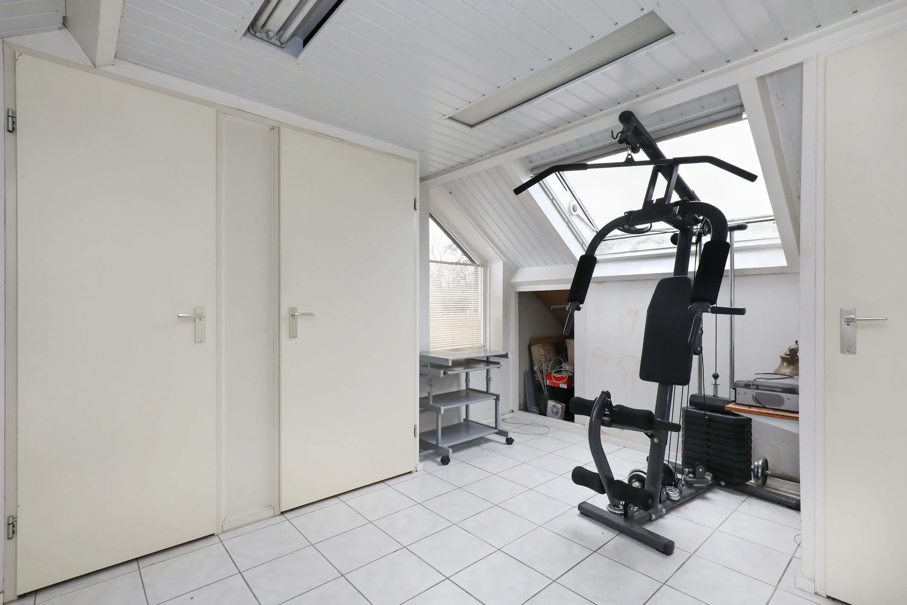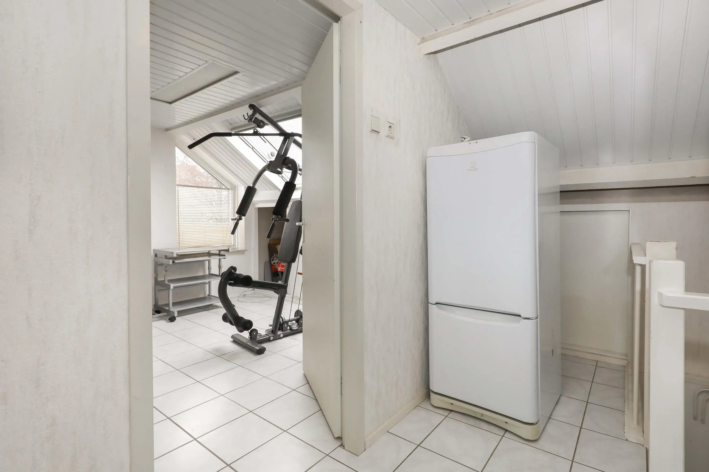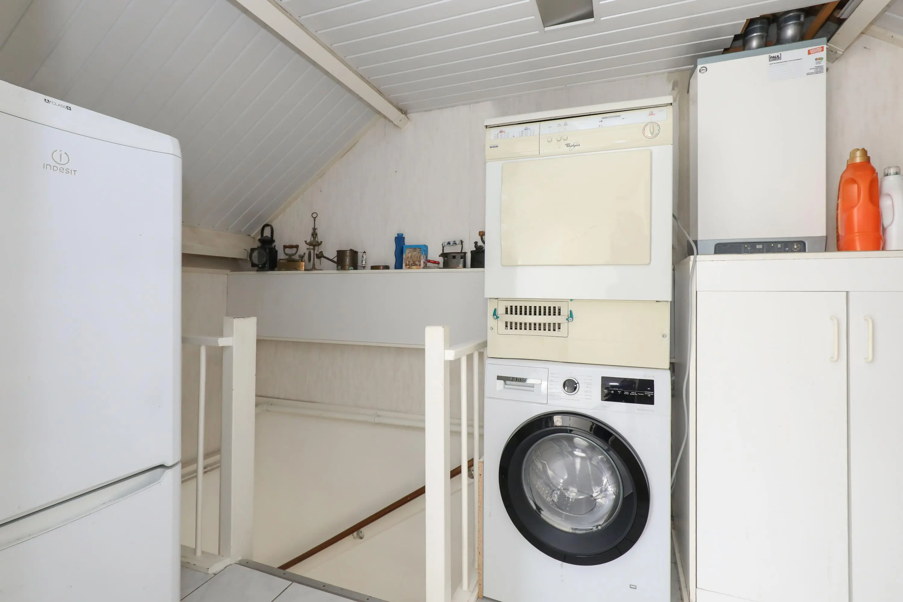 2e verdieping: overloop met ruimte voor wasmachine-/drogeropstelling, C.V.-installatie, vaste kast en toegang tot de royale 4e slaapkamer met dakraam, airconditioning en eveneens praktische vaste kasten.