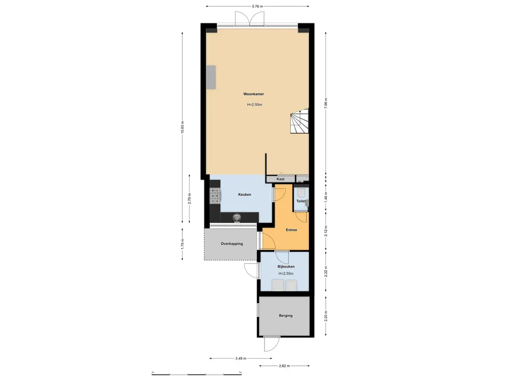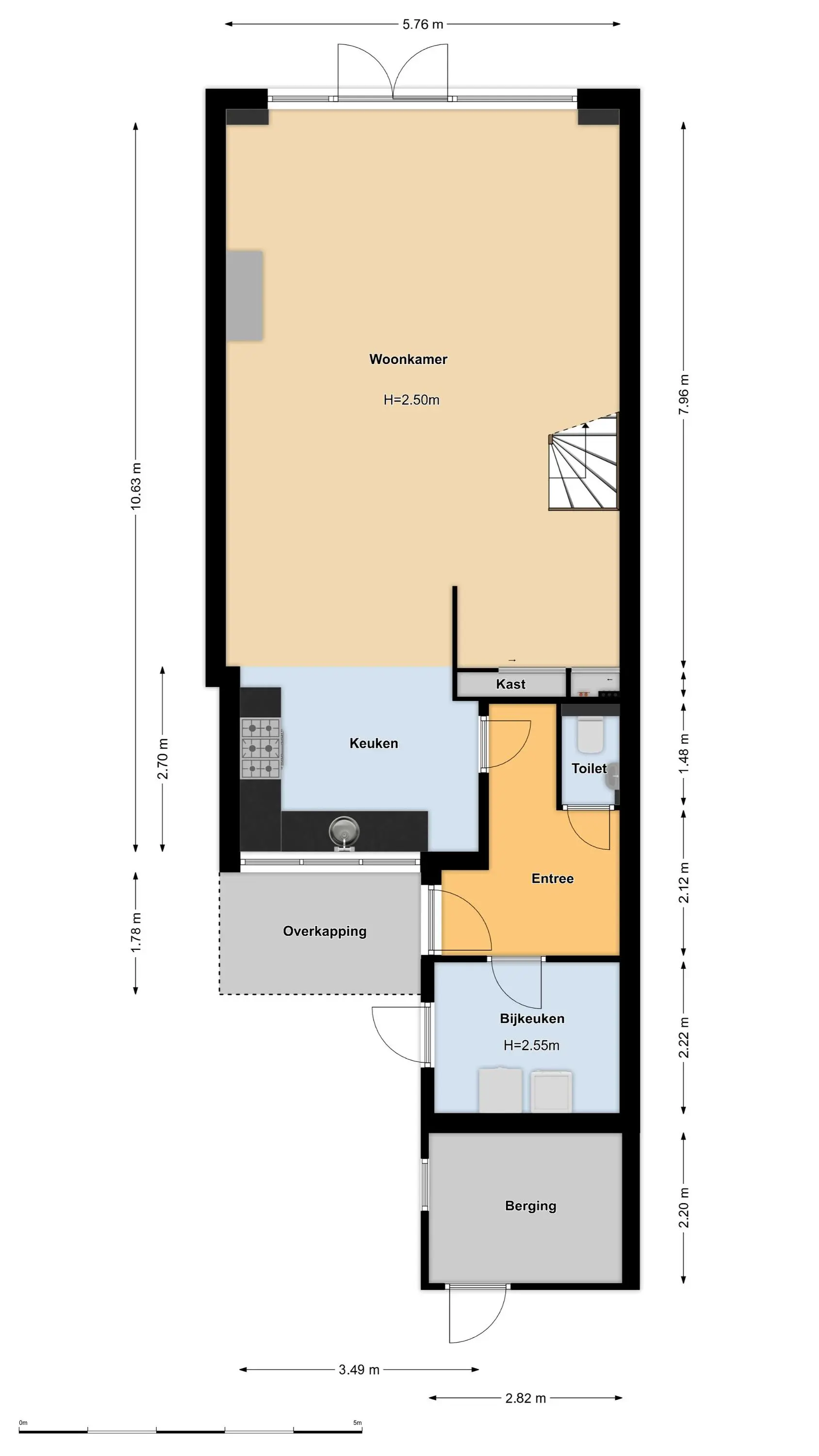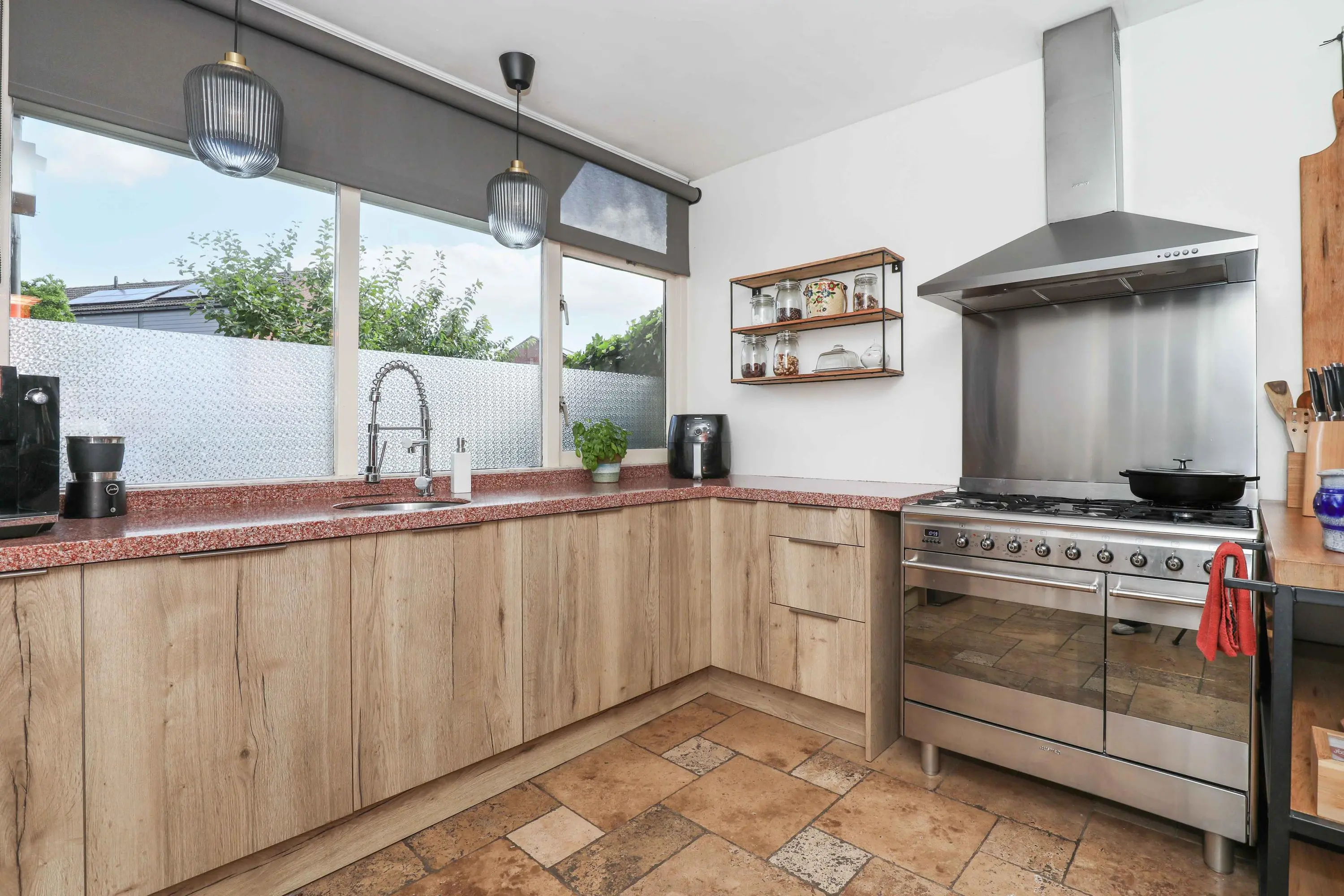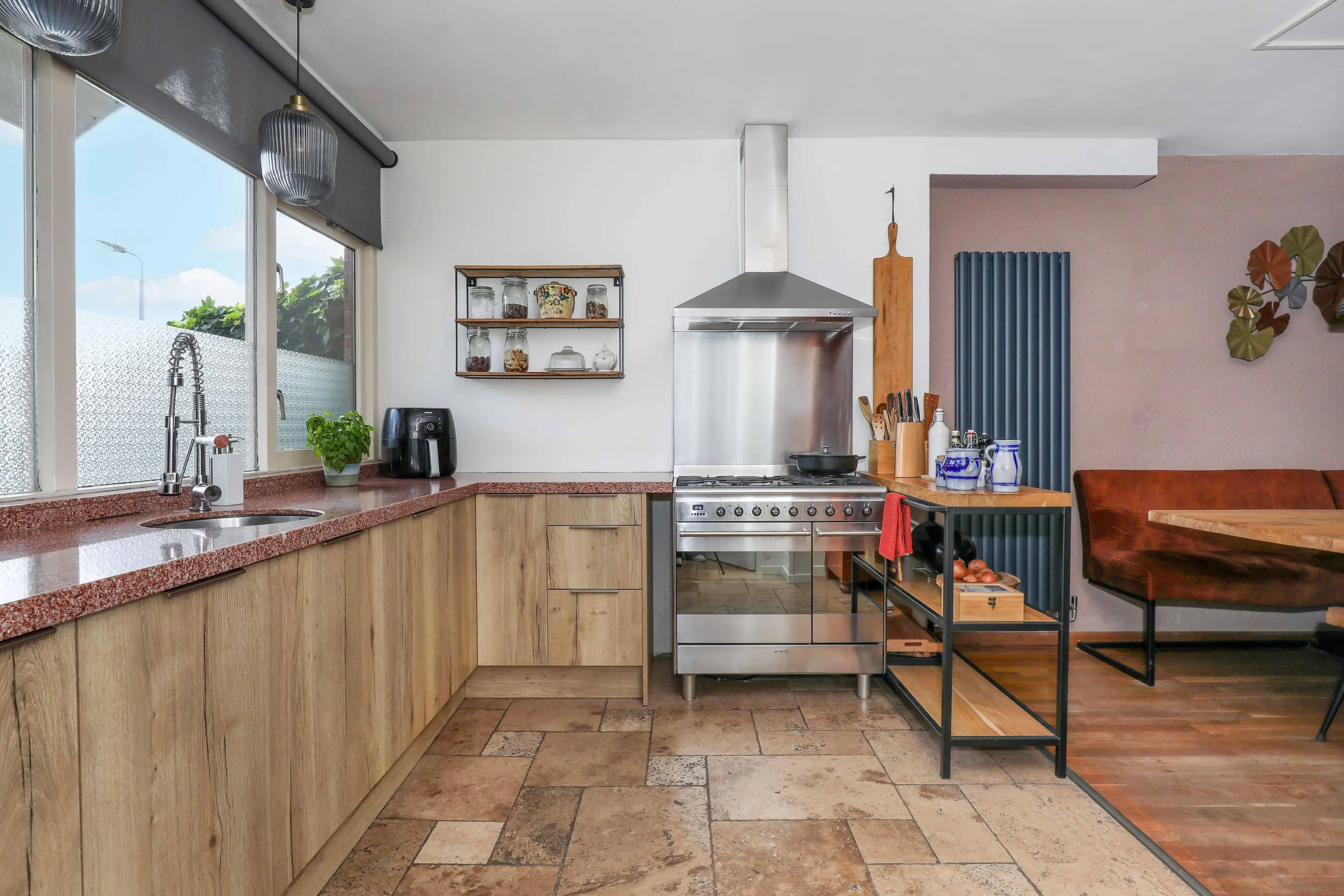 Begane grond: entree/hal met toegang tot de praktische bijkeuken, toiletruimte, garderobe én de toegang tot de leefruimte. Zodra je de leefruimte binnenstapt, ligt aan de voorzijde de complete open keuken (2021). Deze is van alle gemakken voorzien: een vaatwasser, een 6-pits fornuis van het merk SMEG met een brede oven van maar liefst 90 cm, een afzuigkap, een losstaande koel-vriescombinatie en een spoelbak.