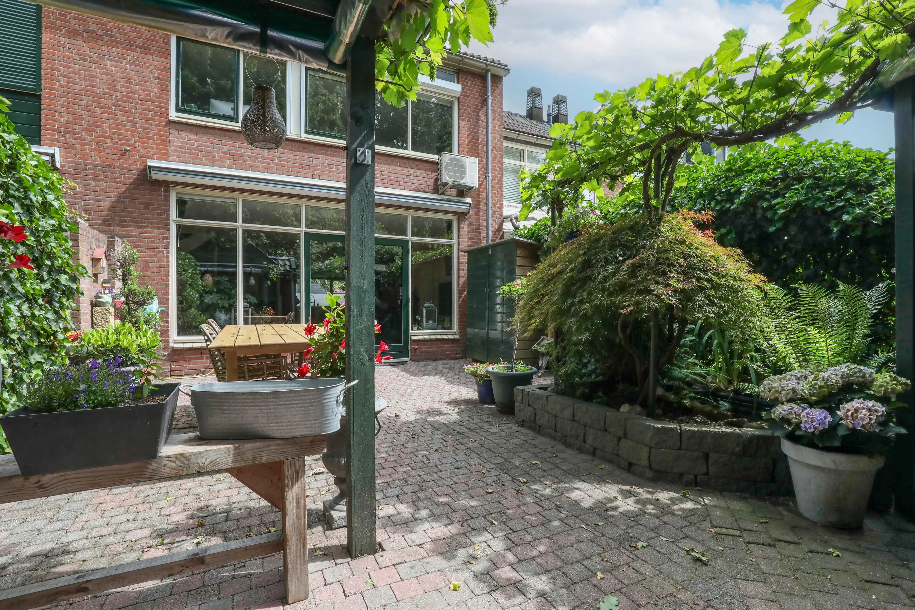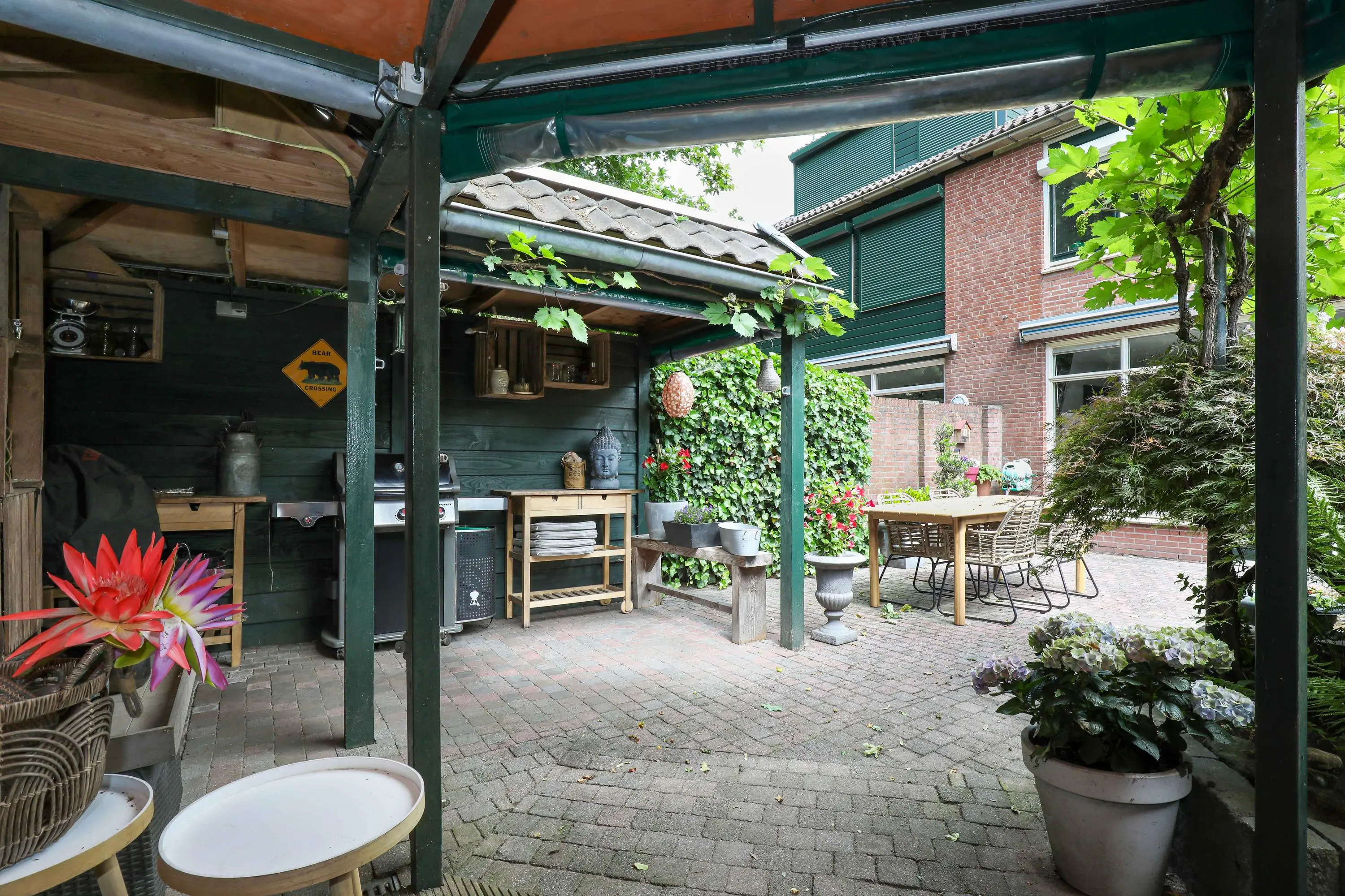 Tuin: aan de achterzijde van de tuin bevindt zich een fijne overkapping, die in de koudere maanden eenvoudig is af te sluiten met valzeilen. Zo kun je er het hele jaar door van genieten: in de zomer zit je hier heerlijk beschut in de schaduw, terwijl je in de winter de ruimte juist kunt verwarmen en er een knusse plek van maakt. Wat deze tuin echt bijzonder maakt, is de heerlijke combinatie van groen, privacy en functionaliteit. De tuin is fraai aangelegd met een mix van bestrating, borders en groene beplanting en kleurrijke bloemen. De sfeer is zowel gezellig als onderhoudsvriendelijk. Dankzij de ligging op het zuidwesten geniet je bovendien volop van de middag- en avondzon.