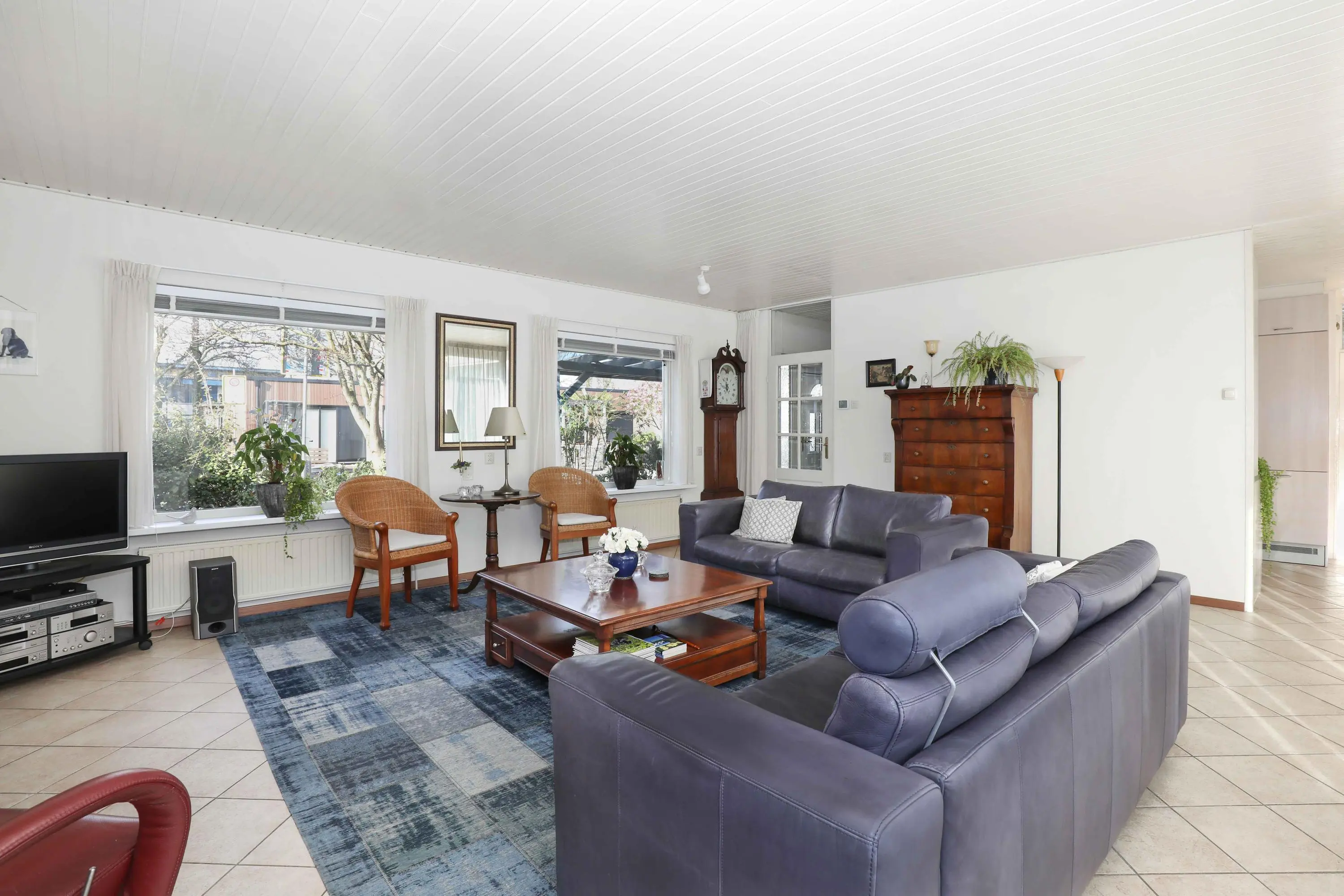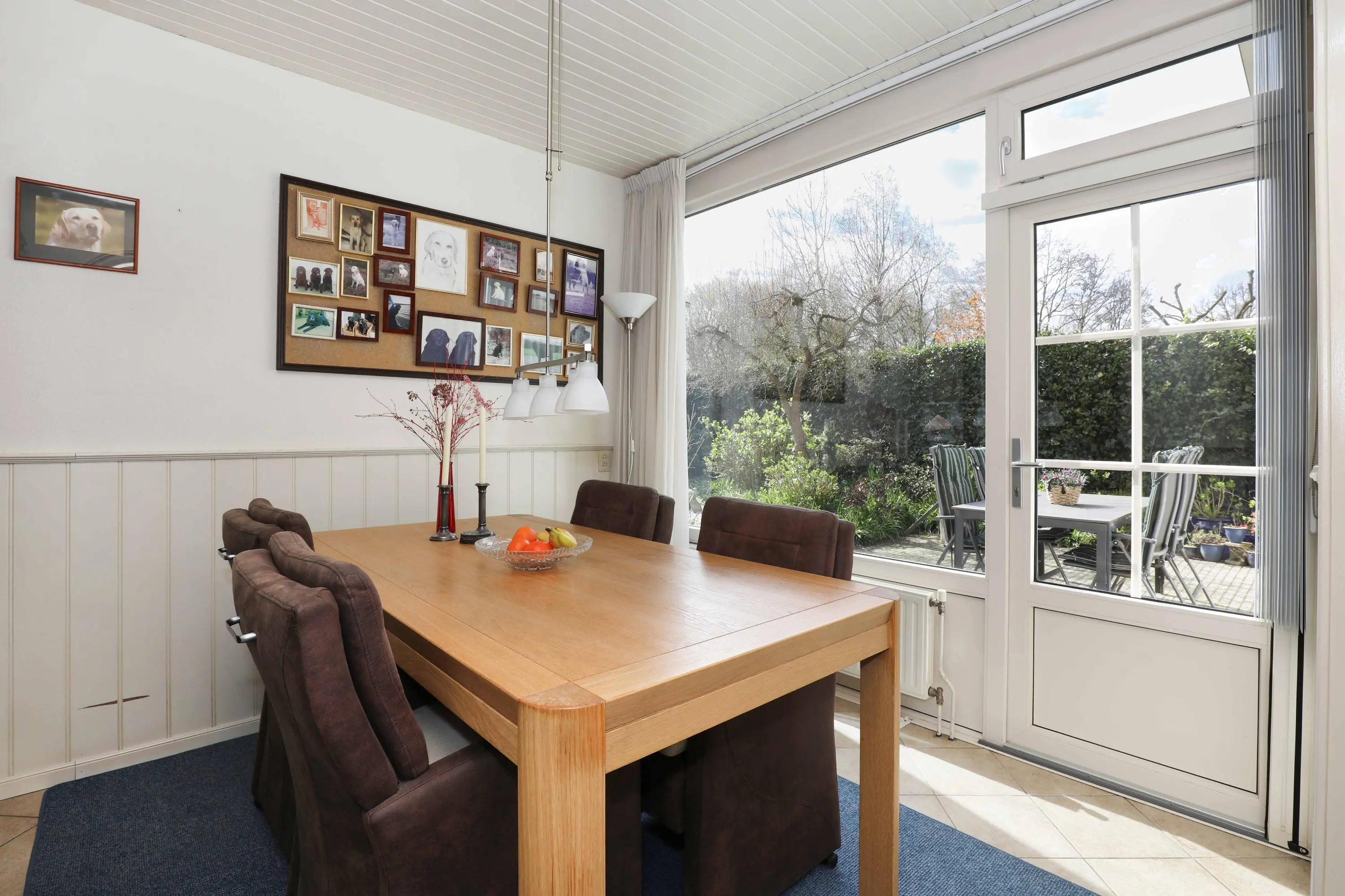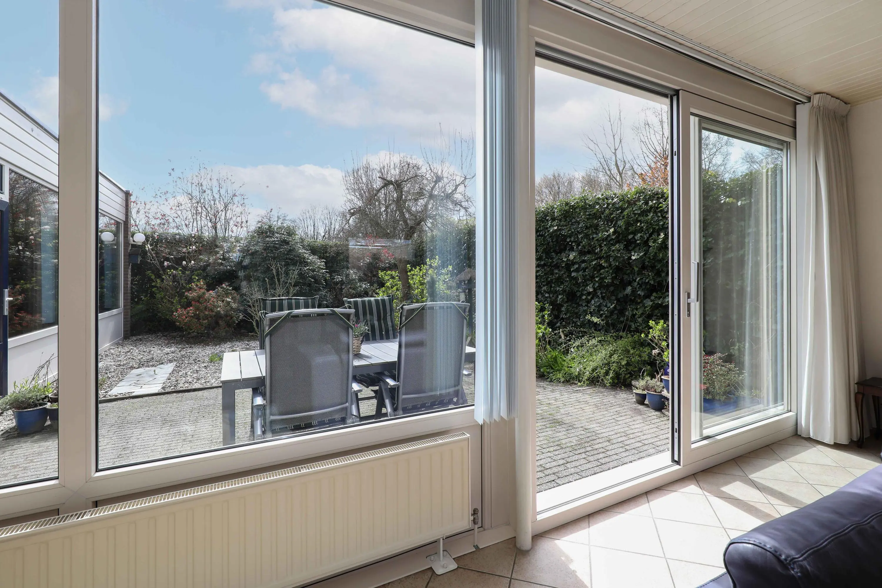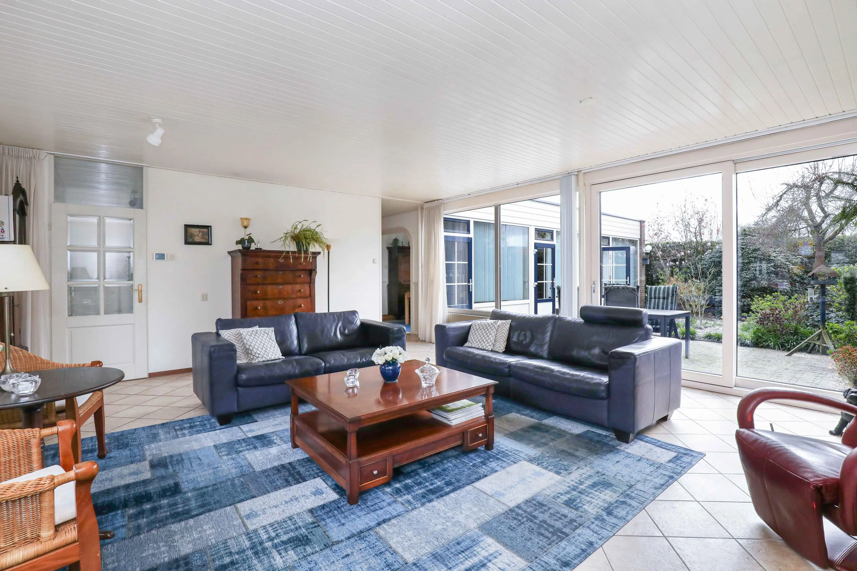 Entree/hal met meterkast, toiletruimte en toegang tot de royale en lichte woonkamer aan de voorzijde met schuifpui naar de patiotuin en een open verbinding met de eetkamer en de keuken. De keuken (1995) is in lichte kleurstelling en v.v. de nodige inbouwapparatuur. De eetkamer is eveneens licht en geeft toegang tot de patiotuin. Vanuit hier is de tweede hal te bereiken met deur naar de inpandige garage, praktische vaste kastenwand, bergruimte v.v. C.V.-installatie, badkamer (1996) v.v. douche, toilet en wastafelmeubel en de twee in grootte variërende slaapkamers, elk met deur naar de patiotuin en één v.v. praktische vaste kastenwand.