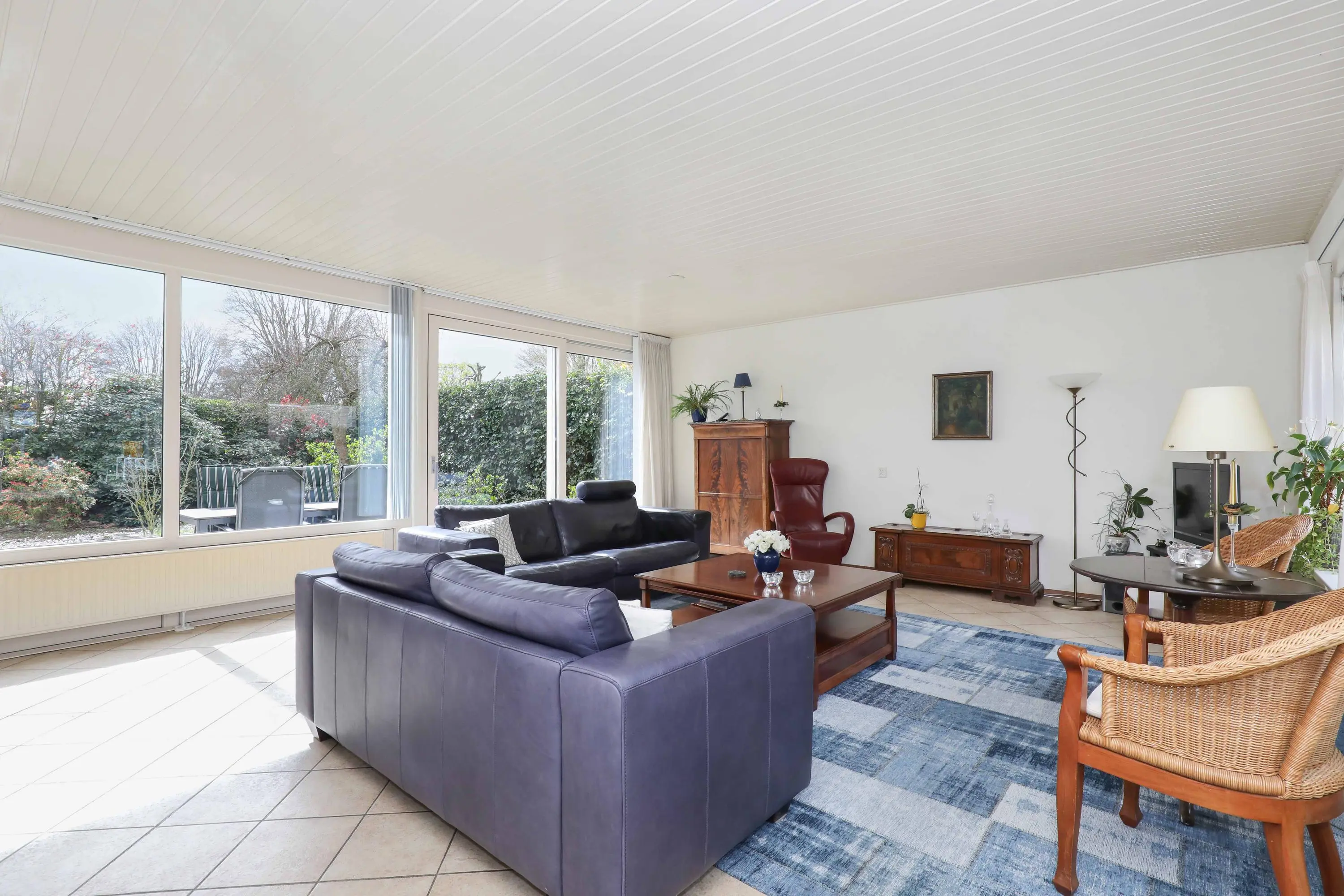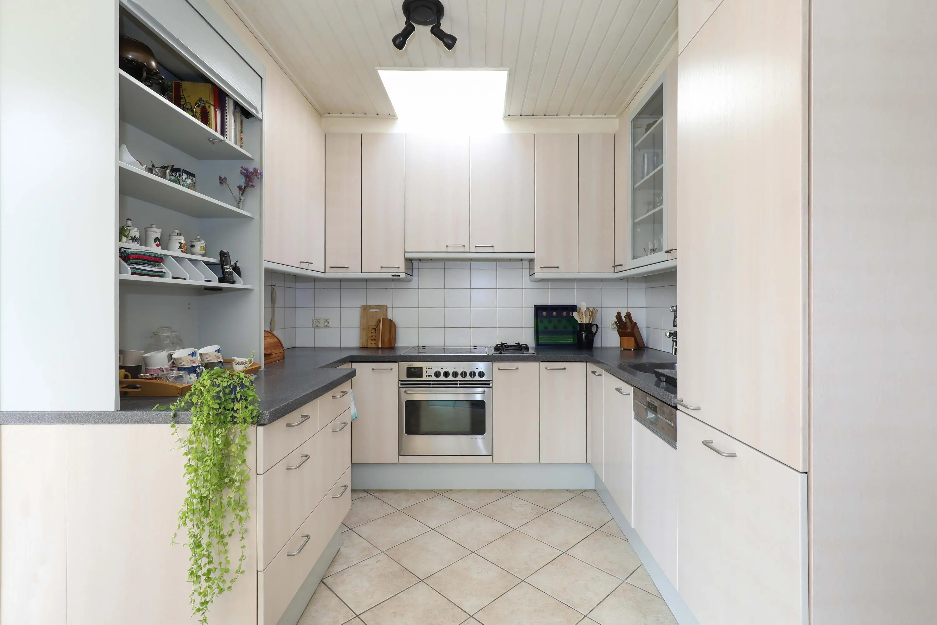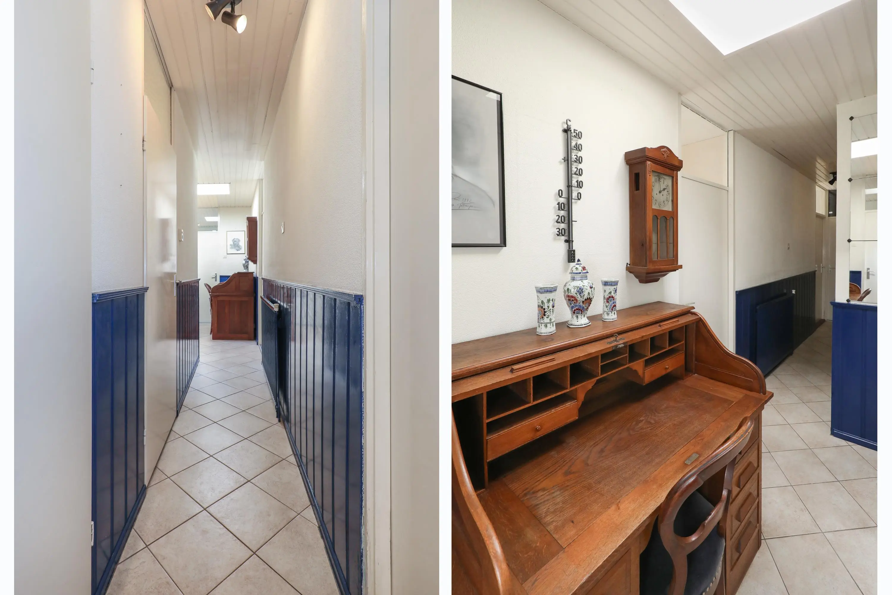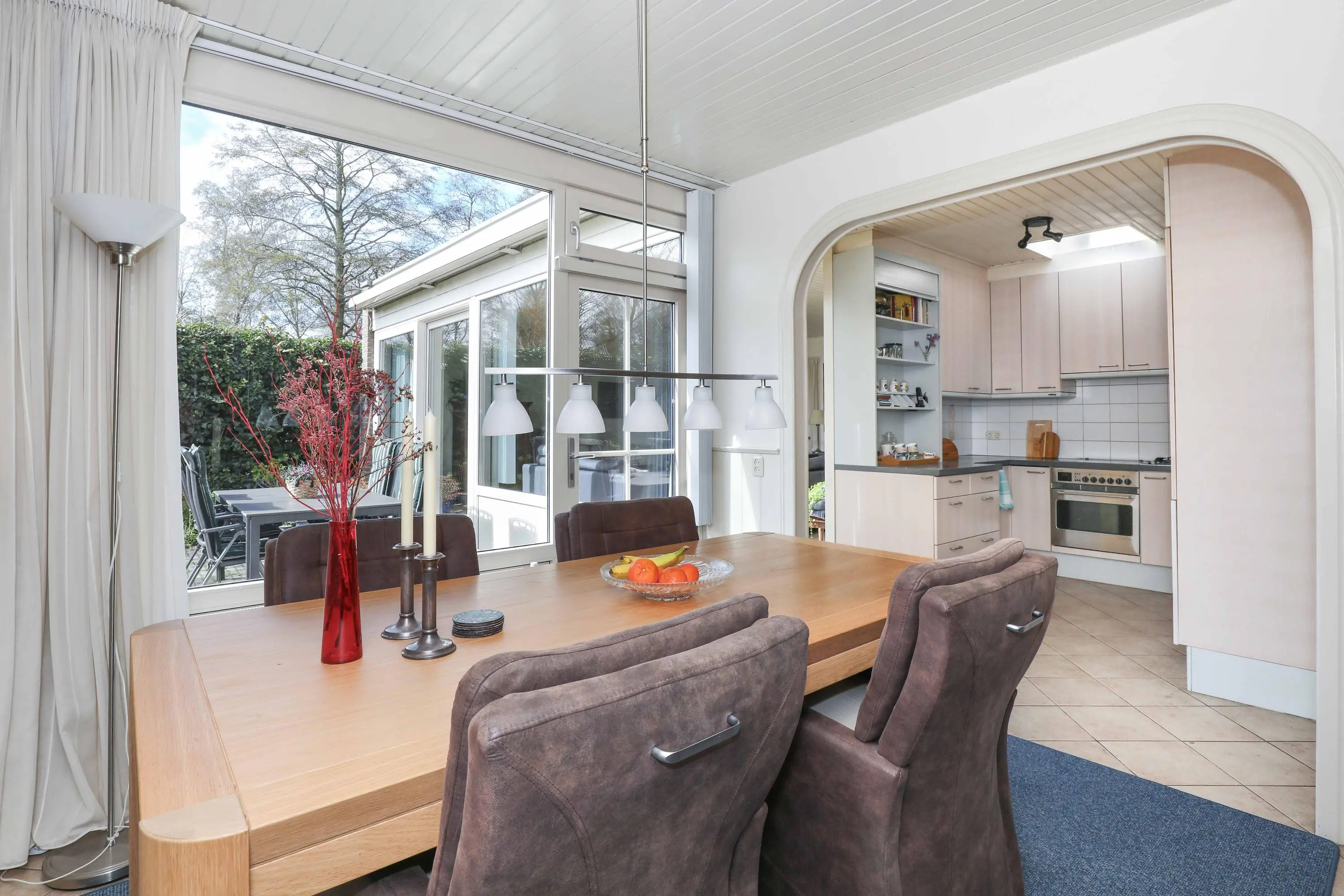 Entree/hal met meterkast, toiletruimte en toegang tot de royale en lichte woonkamer aan de voorzijde met schuifpui naar de patiotuin en een open verbinding met de eetkamer en de keuken. De keuken (1995) is in lichte kleurstelling en v.v. de nodige inbouwapparatuur. De eetkamer is eveneens licht en geeft toegang tot de patiotuin. Vanuit hier is de tweede hal te bereiken met deur naar de inpandige garage, praktische vaste kastenwand, bergruimte v.v. C.V.-installatie, badkamer (1996) v.v. douche, toilet en wastafelmeubel en de twee in grootte variërende slaapkamers, elk met deur naar de patiotuin en één v.v. praktische vaste kastenwand.