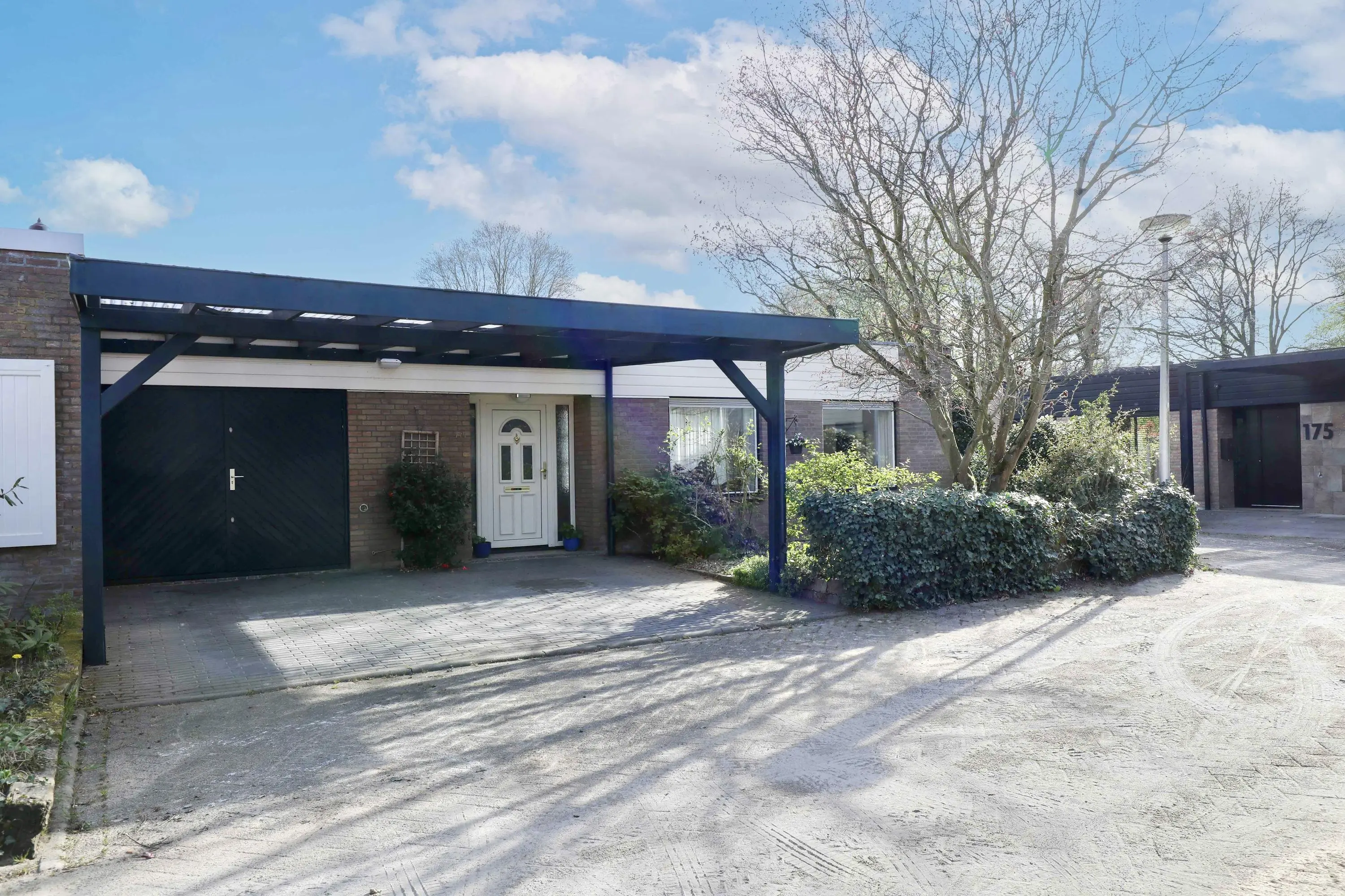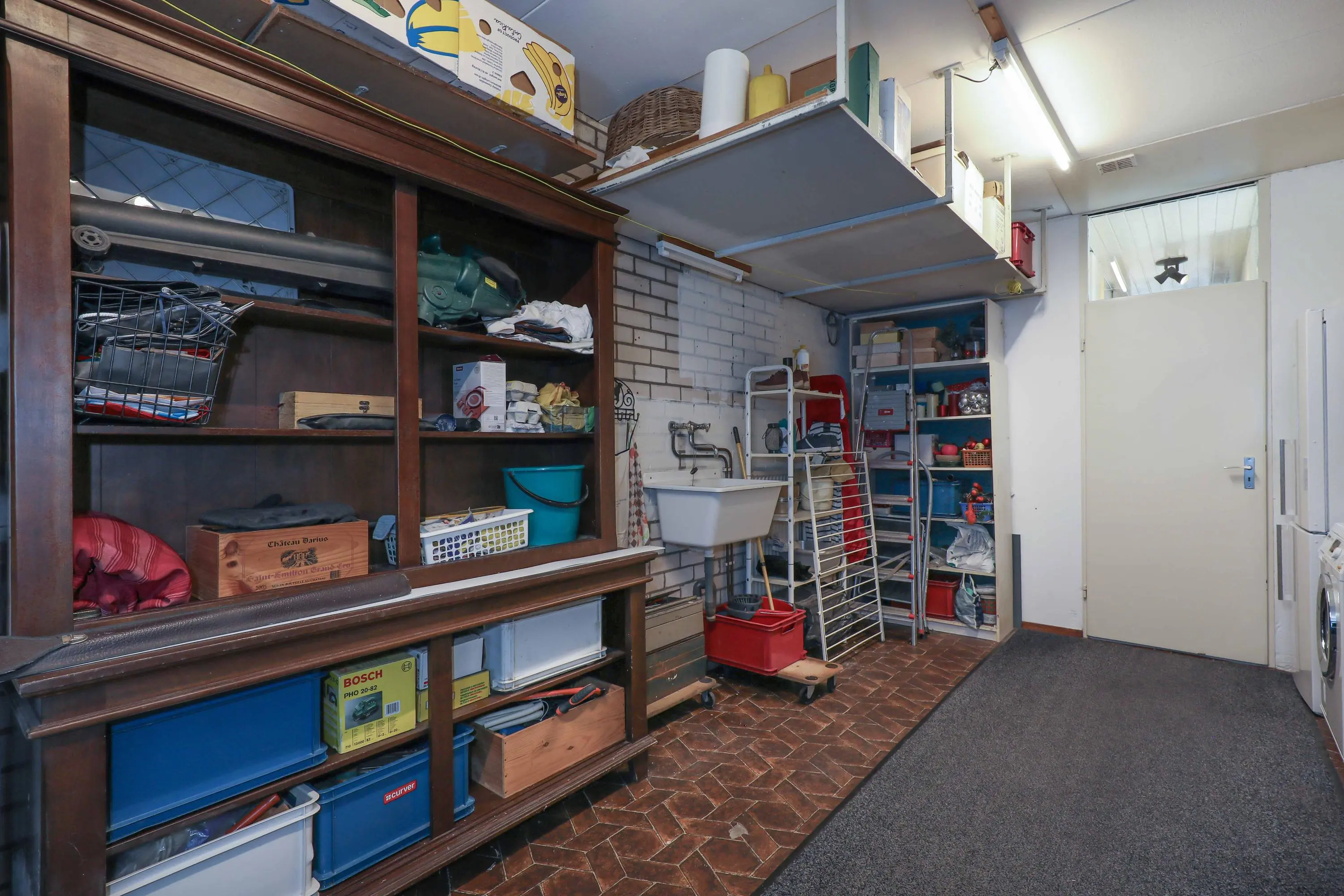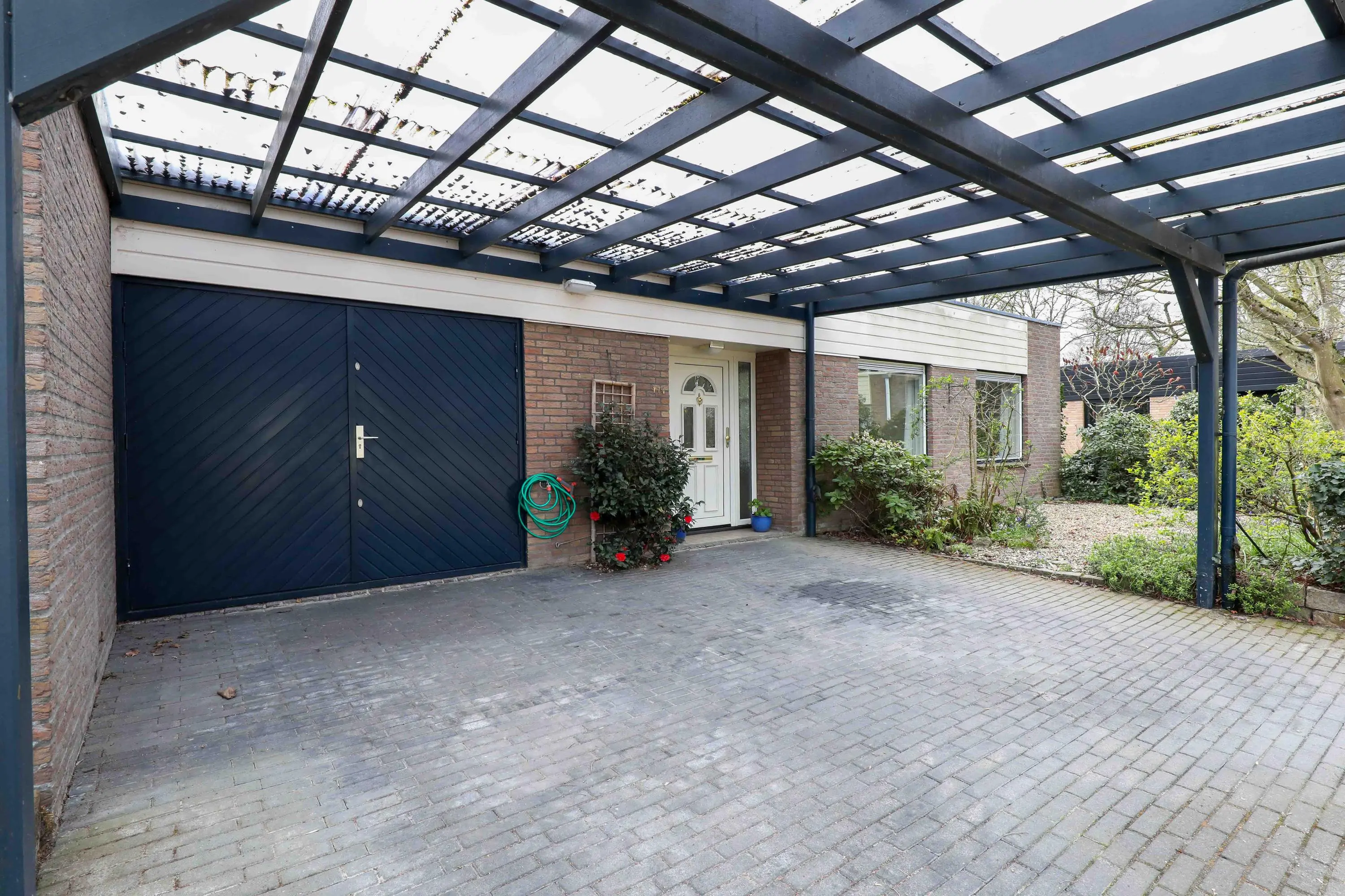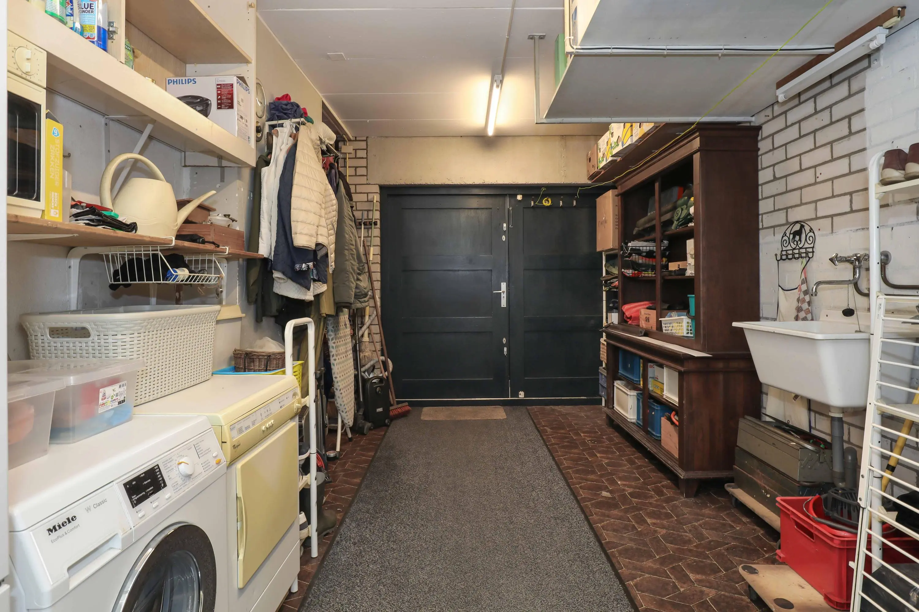 De inpandige garage aan de voorzijde van de woning is vanuit de carport te bereiken middels een dubbele openslaande deur. Hier bevindt zich de wasmachine-/drogeropstelling, een wastafel en hier is ruimte voor het stallen van o.a. fietsen en tuingereedschap. De carport aan de voorzijde biedt ruimte voor het parkeren van twee auto’s op eigen terrein.