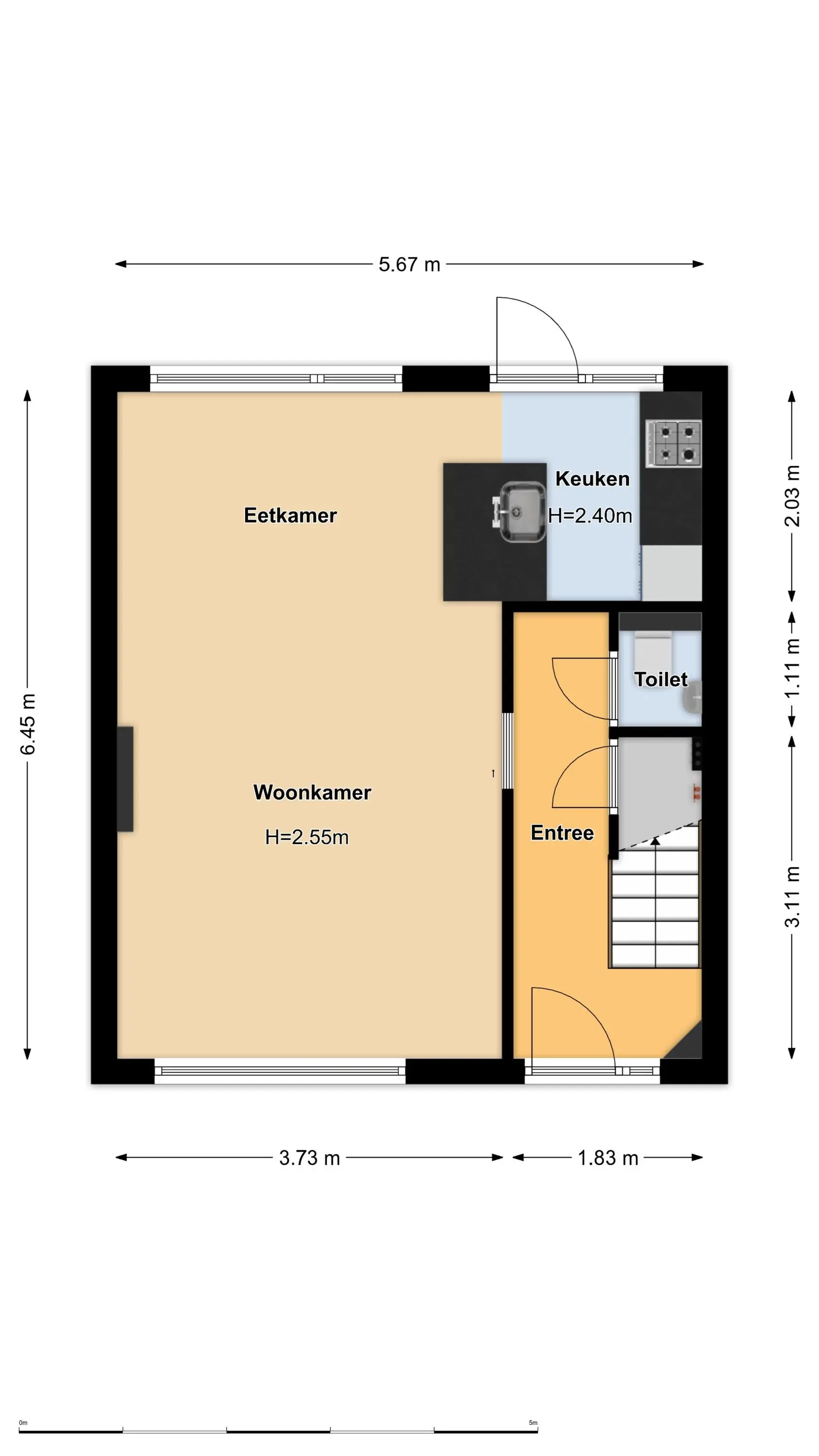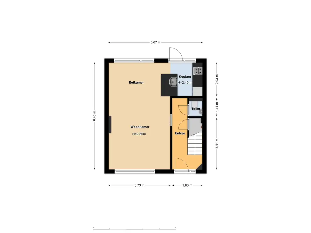Begane grond: entree/hal met trapopgang naar 1e verdieping, trapkast met meterkast, toiletruimte en schuifdeur naar de leefruimte. Aan de voorzijde bevindt zich de lichte woonkamer welke een open verbinding heeft met het eetgedeelte en de open keuken aan de achterzijde. De moderne keuken (2016) beschikt over een gaskookplaat, afzuigkap, koelkast, combi-oven en (schier)eiland met spoelbak en vaatwasser. Vanuit de keuken bereik je eveneens de achtertuin.