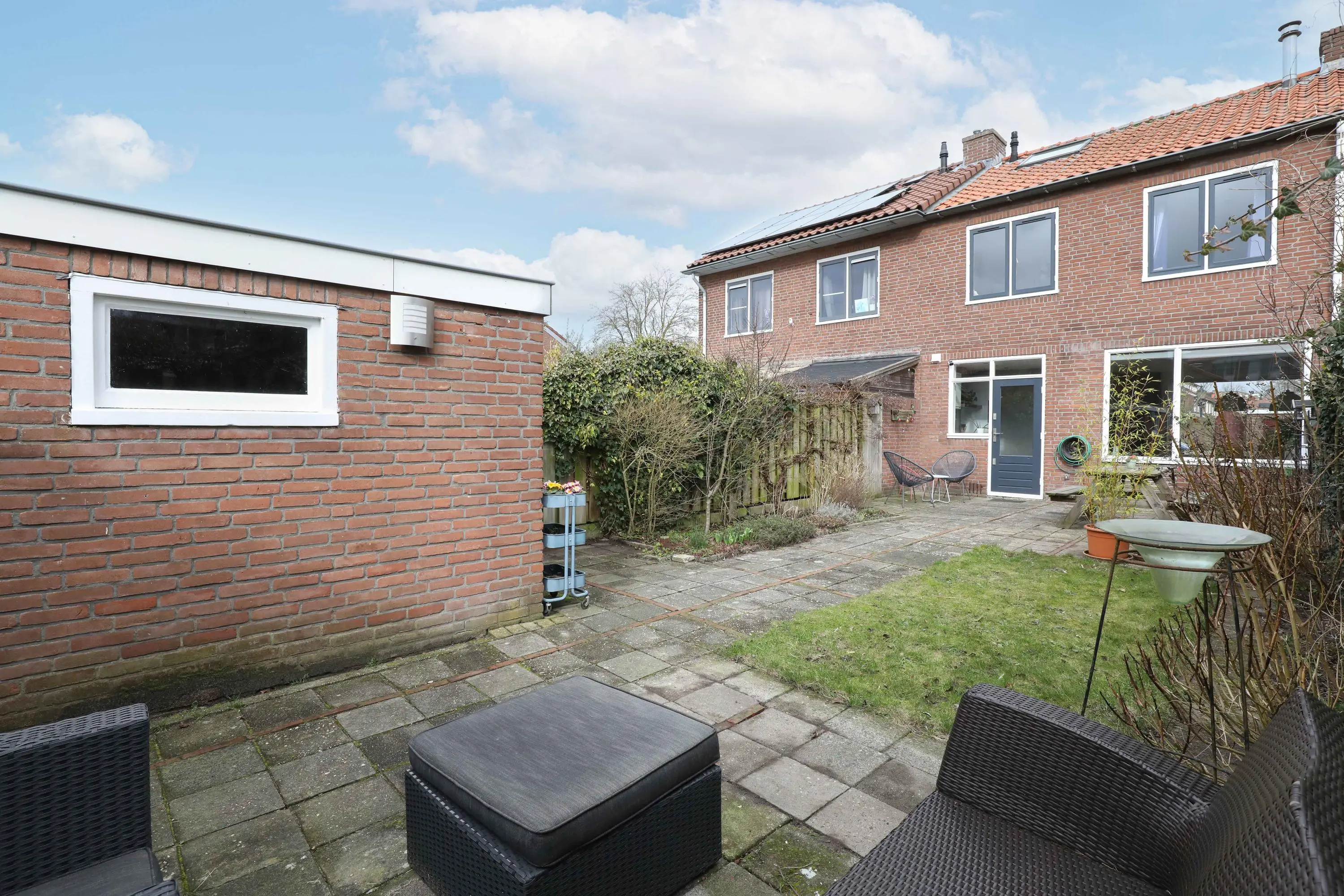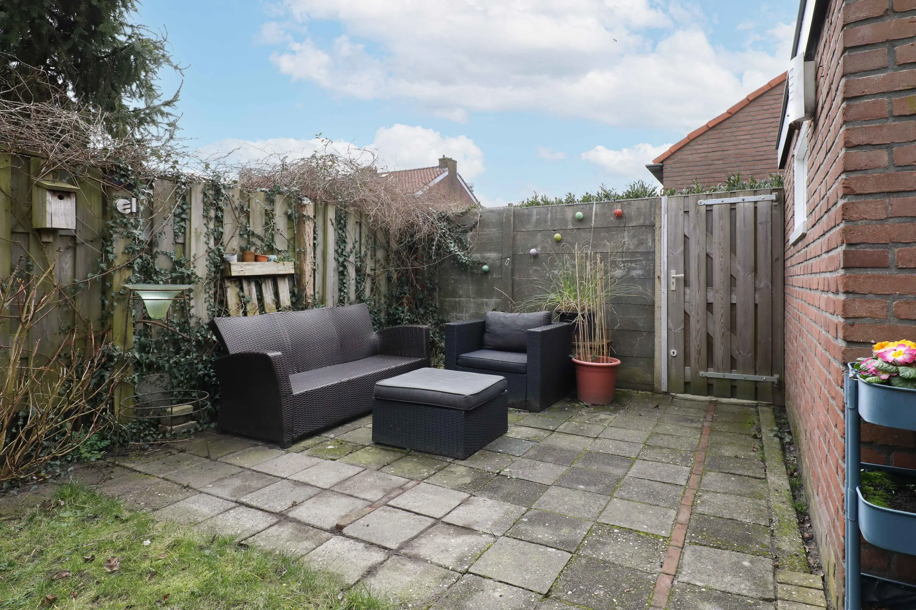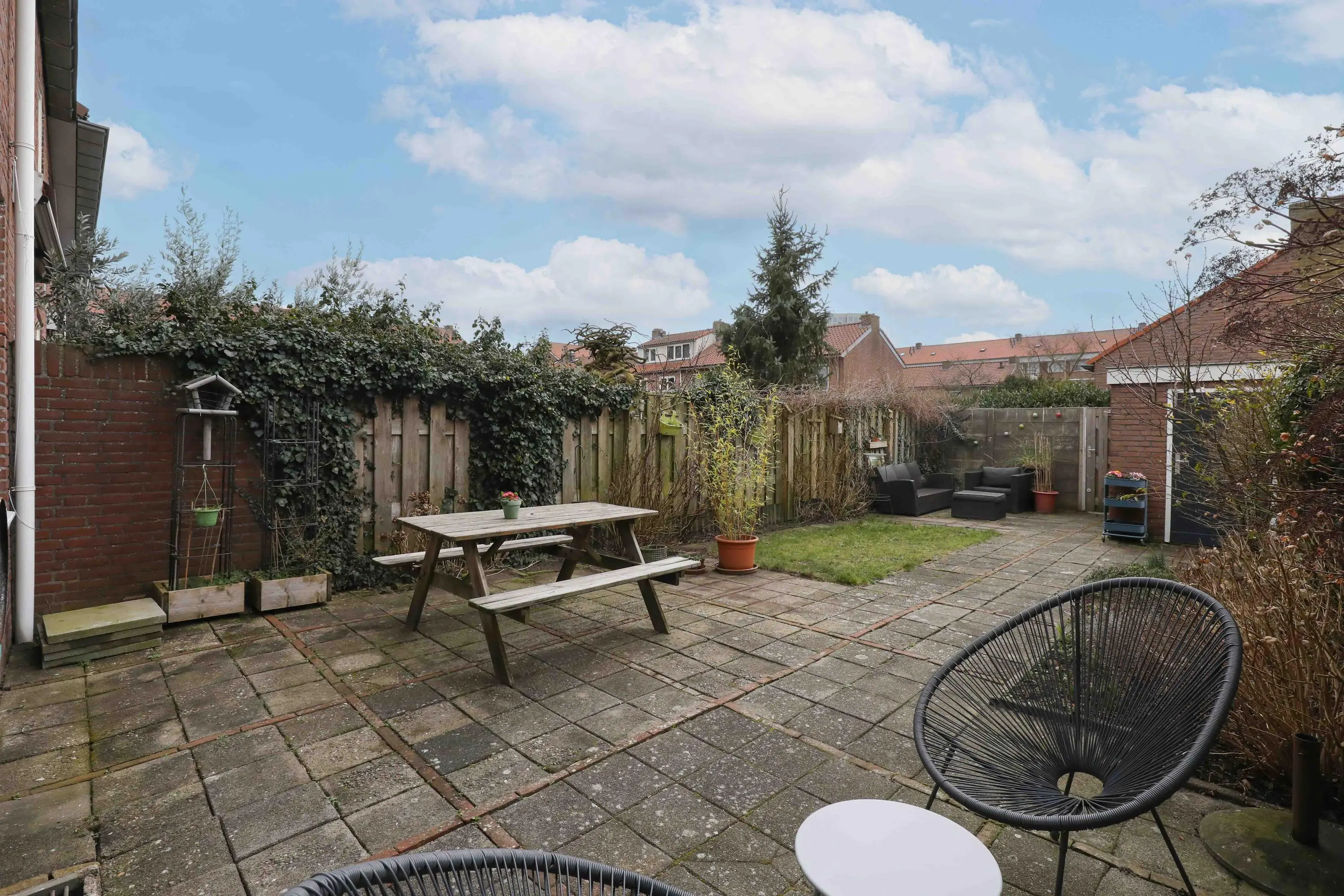 Tuin en vrijstaande stenen berging: de achtertuin is ruim 13 meter diep, onderhoudsvriendelijk aangelegd en gelegen op het zuidwesten. Er zijn twee terrassen aanwezig, een gazon en borders met beplanting. Door de prettige zonligging is het hier genieten tot de laatste zonuren! Achterin de tuin bevindt zich een vrijstaande stenen berging voor het stallen van o.a. fietsen en tuingereedschap. Deze is middels een achterom te bereiken.