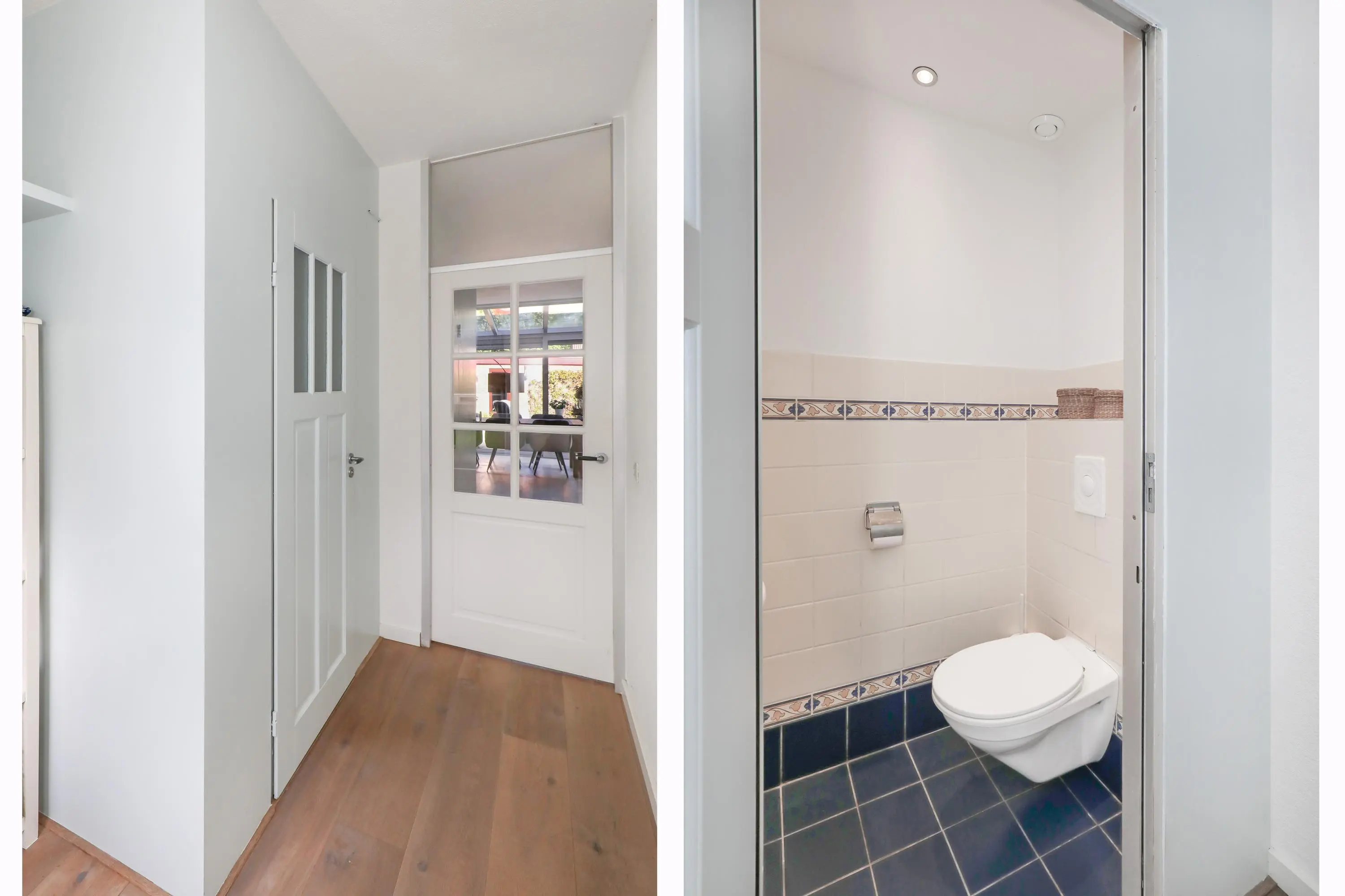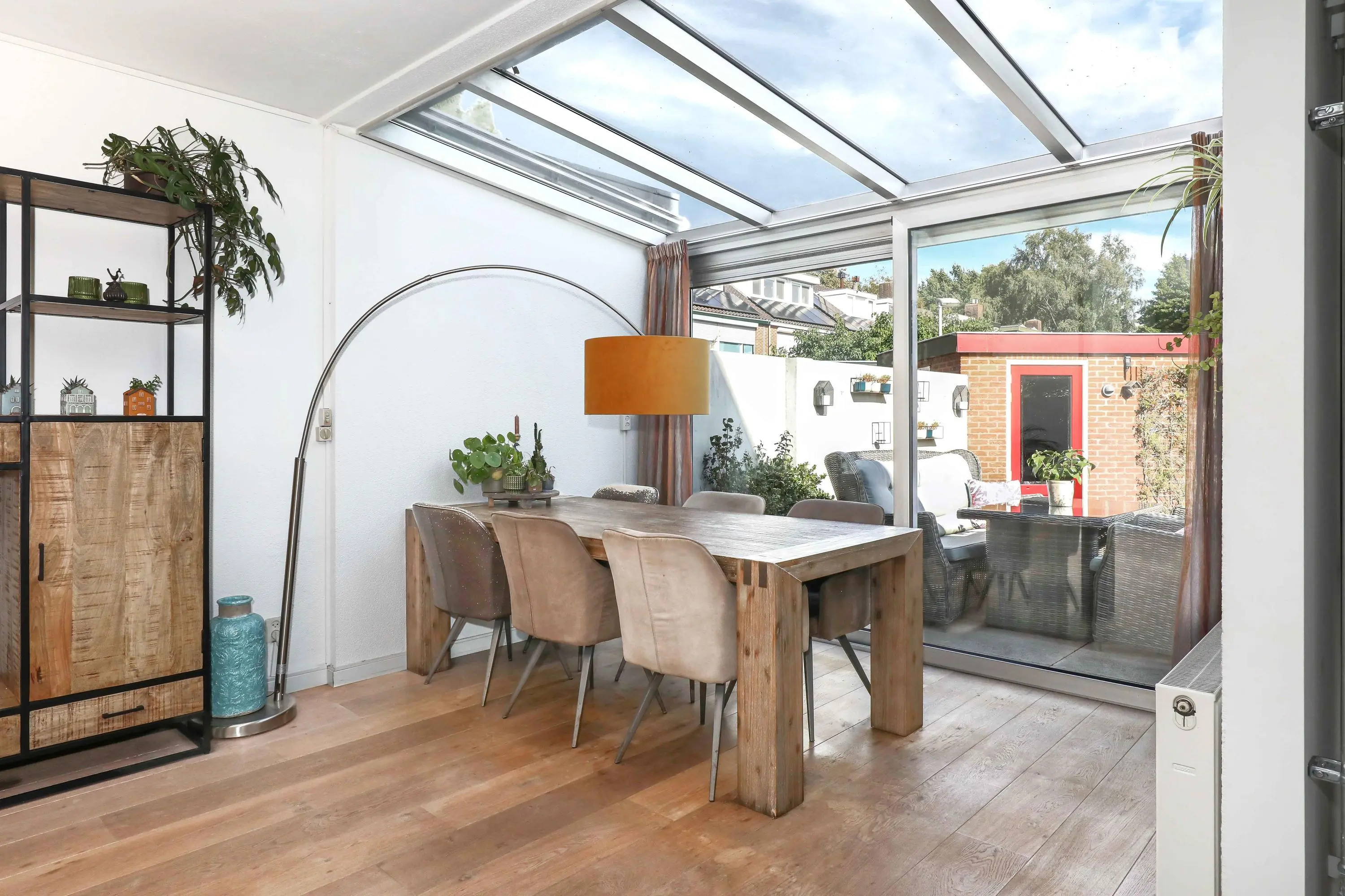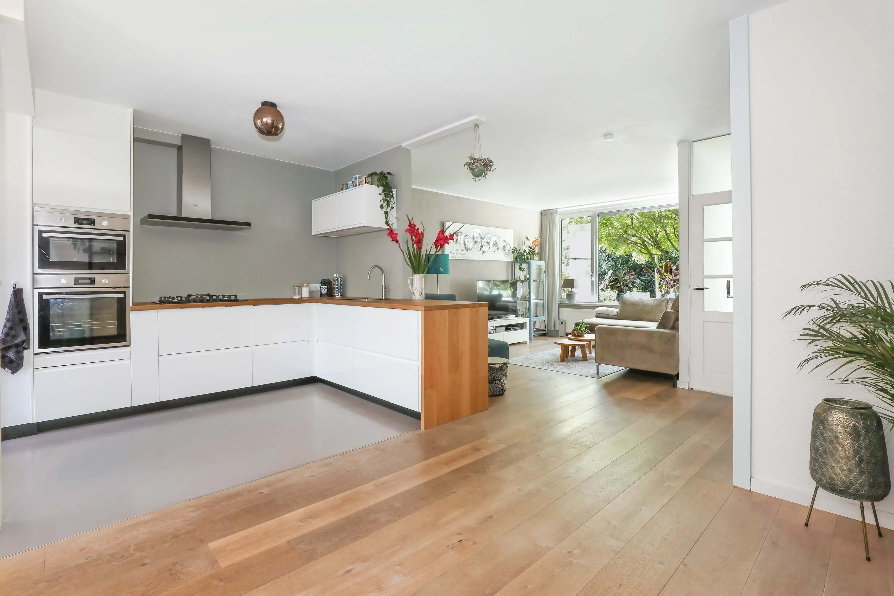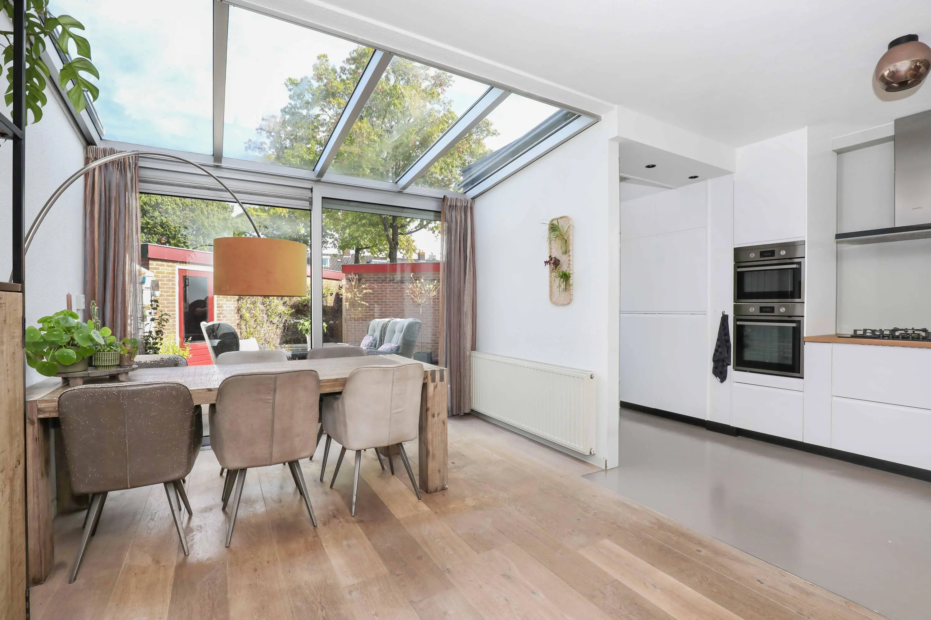 Begane grond: entree/hal met meterkast, toiletruimte en trapopgang naar de 1e verdieping. Aan de voorzijde bevindt zich de royale en lichte woonkamer met prachtig uitzicht op het groen. Aan de achterzijde bevindt zich een lichte, aangebouwde serre met eethoek – een heerlijke plek om te genieten van het daglicht. De houten vloer, het open karakter en zonneschermen aan beide zijden zorgen voor comfort en een warme sfeer. De moderne keuken (2022) is uitgerust met diverse inbouwapparatuur zoals een koelkast, vriezer, Quooker, vaatwasser, gaskookplaat, afzuigkap, twee combi-ovens en spoelbak en loopt door in de bijkeuken met extra werk- en opbergruimte.