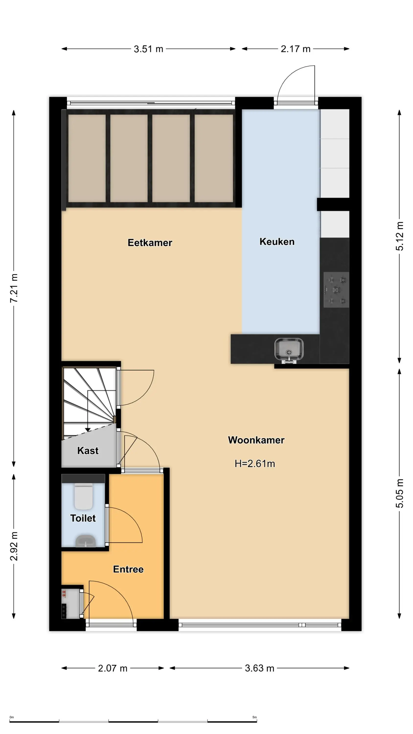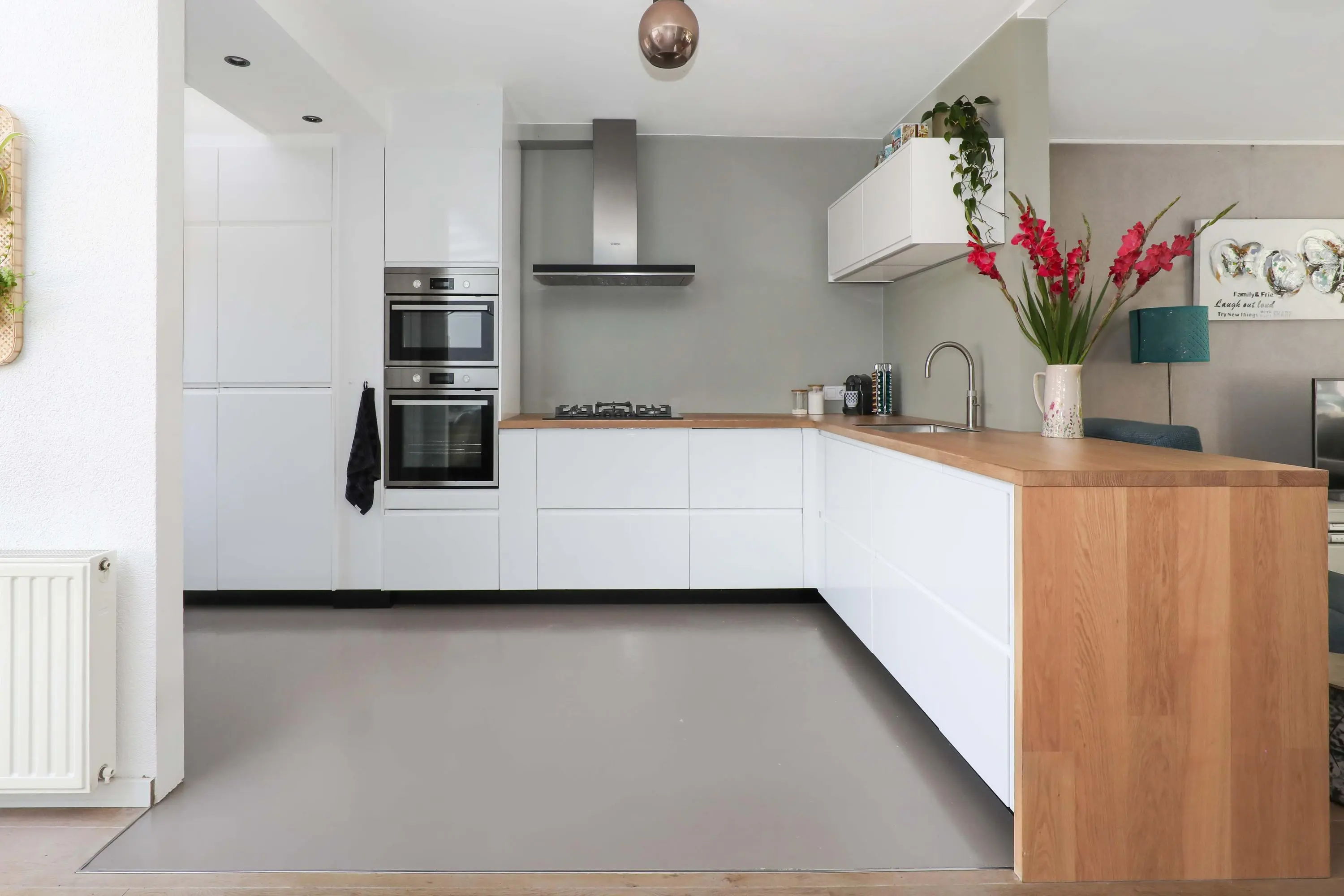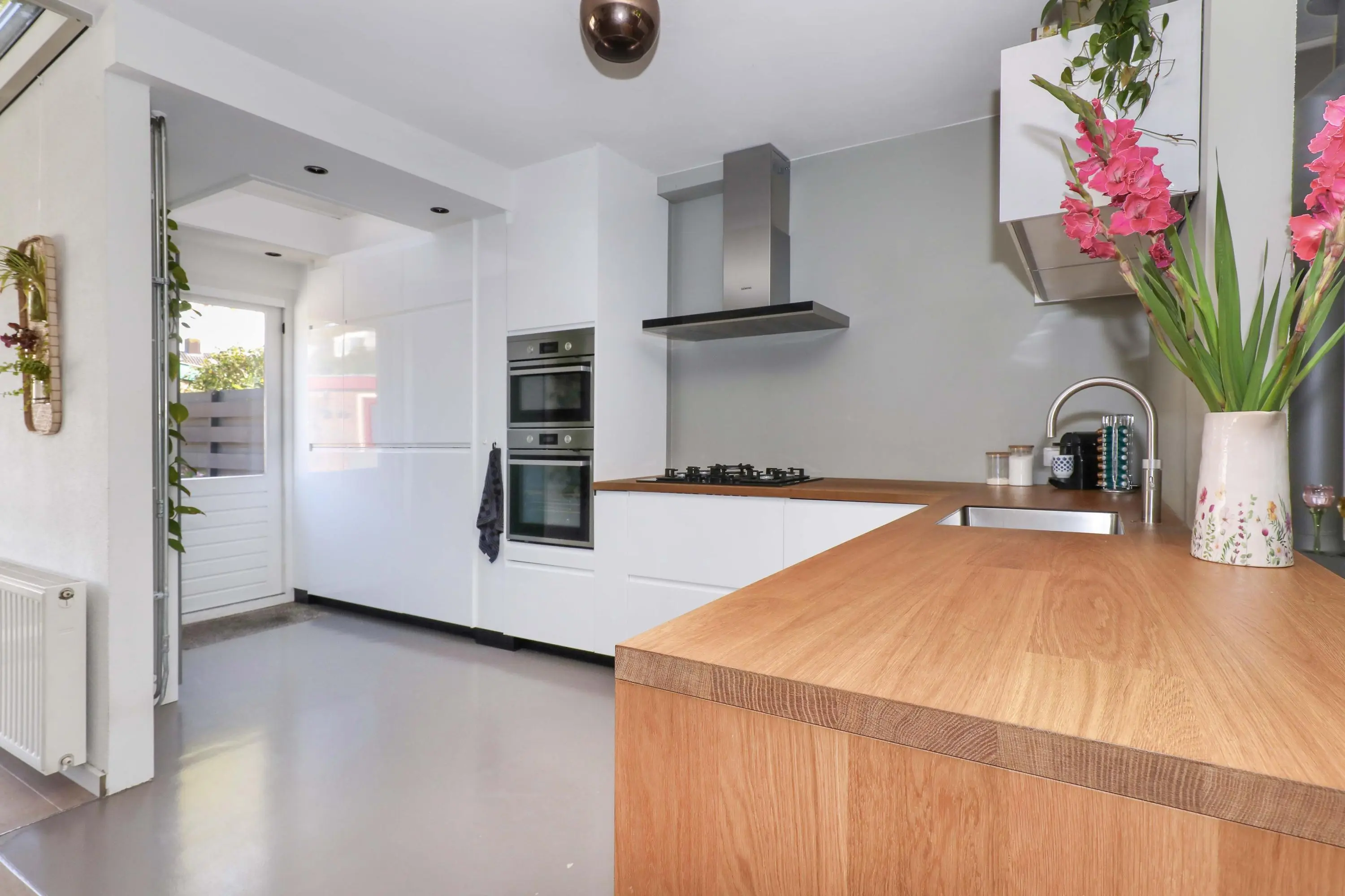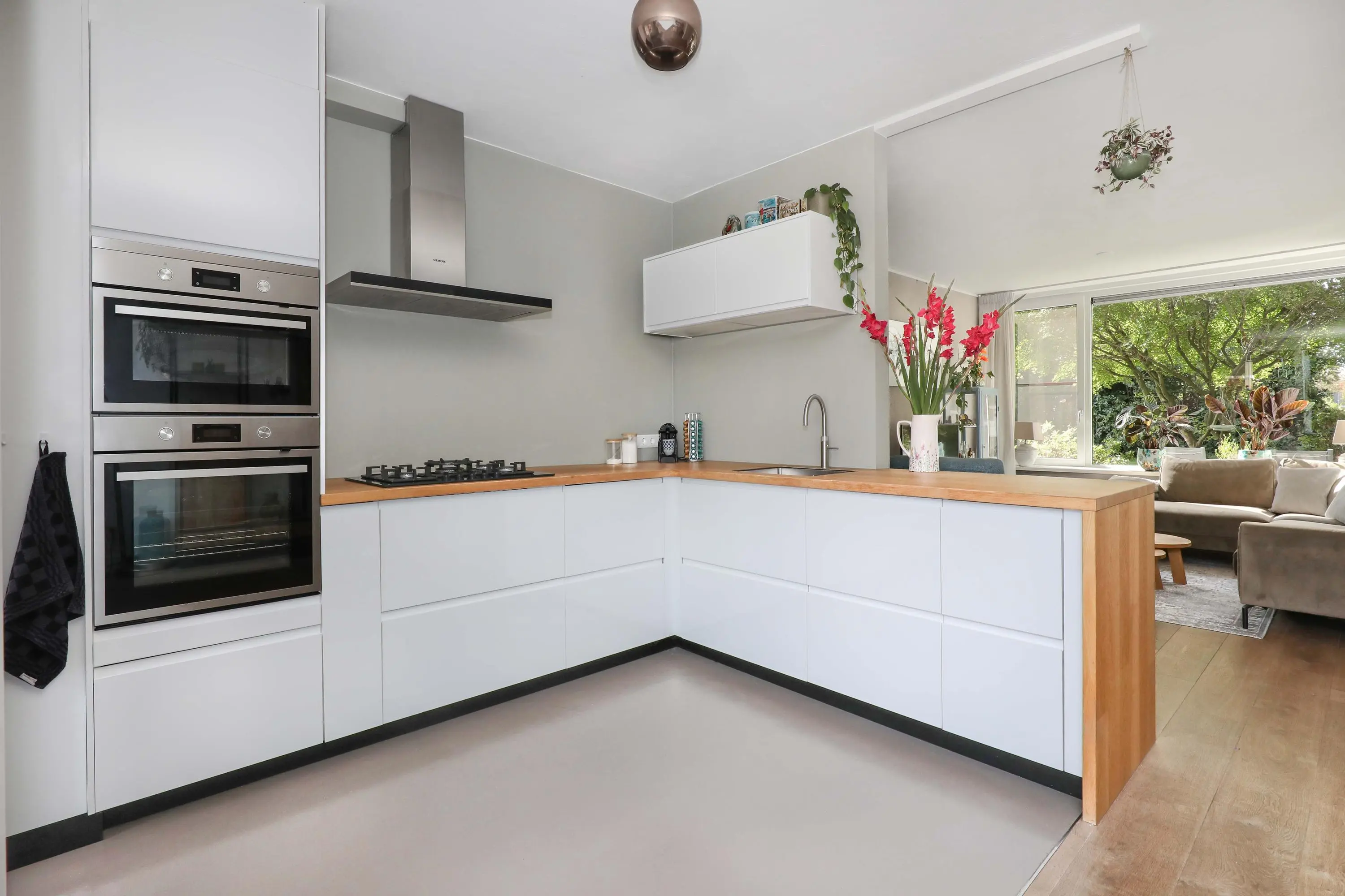 Begane grond: entree/hal met meterkast, toiletruimte en trapopgang naar de 1e verdieping. Aan de voorzijde bevindt zich de royale en lichte woonkamer met prachtig uitzicht op het groen. Aan de achterzijde bevindt zich een lichte, aangebouwde serre met eethoek – een heerlijke plek om te genieten van het daglicht. De houten vloer, het open karakter en zonneschermen aan beide zijden zorgen voor comfort en een warme sfeer. De moderne keuken (2022) is uitgerust met diverse inbouwapparatuur zoals een koelkast, vriezer, Quooker, vaatwasser, gaskookplaat, afzuigkap, twee combi-ovens en spoelbak en loopt door in de bijkeuken met extra werk- en opbergruimte.