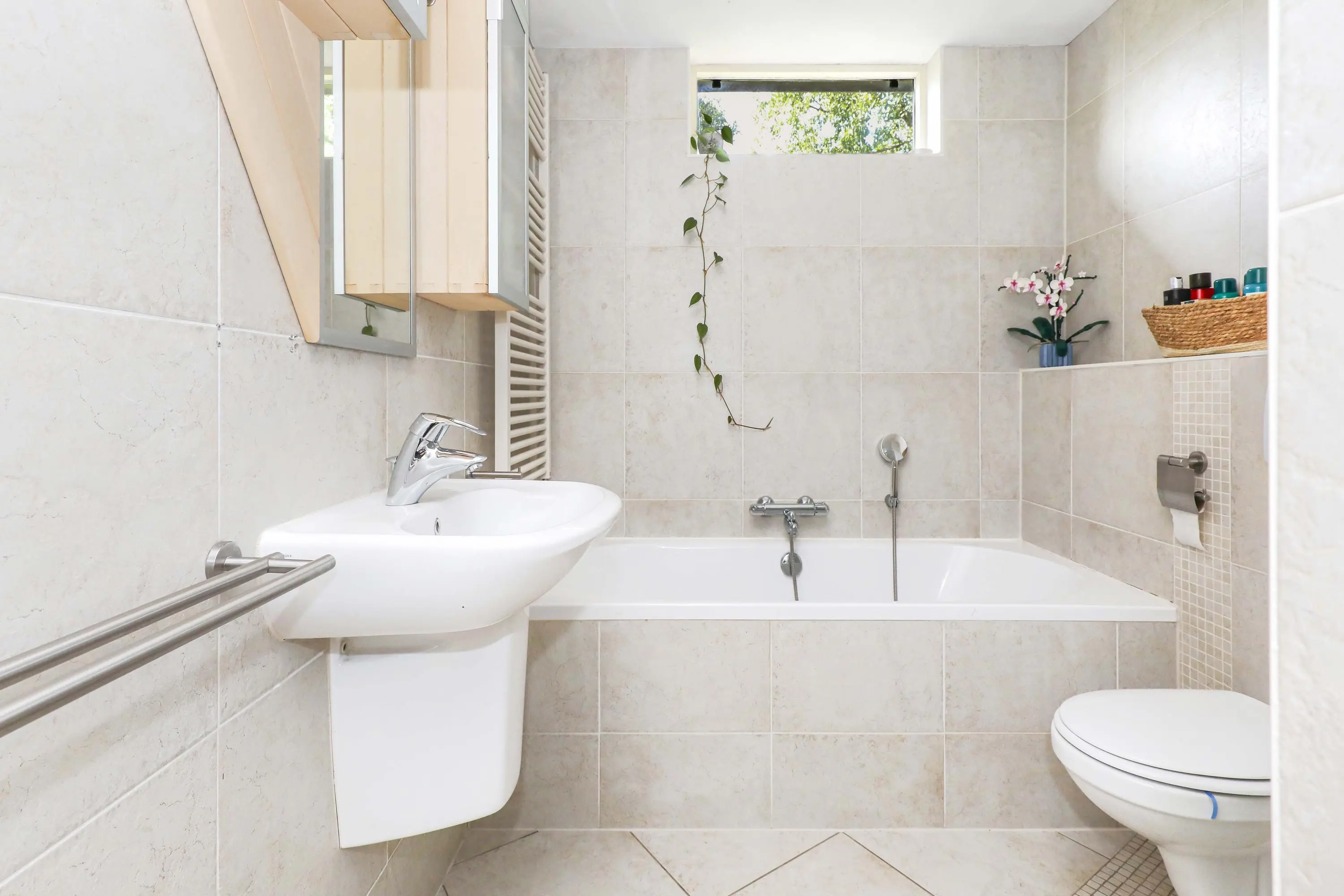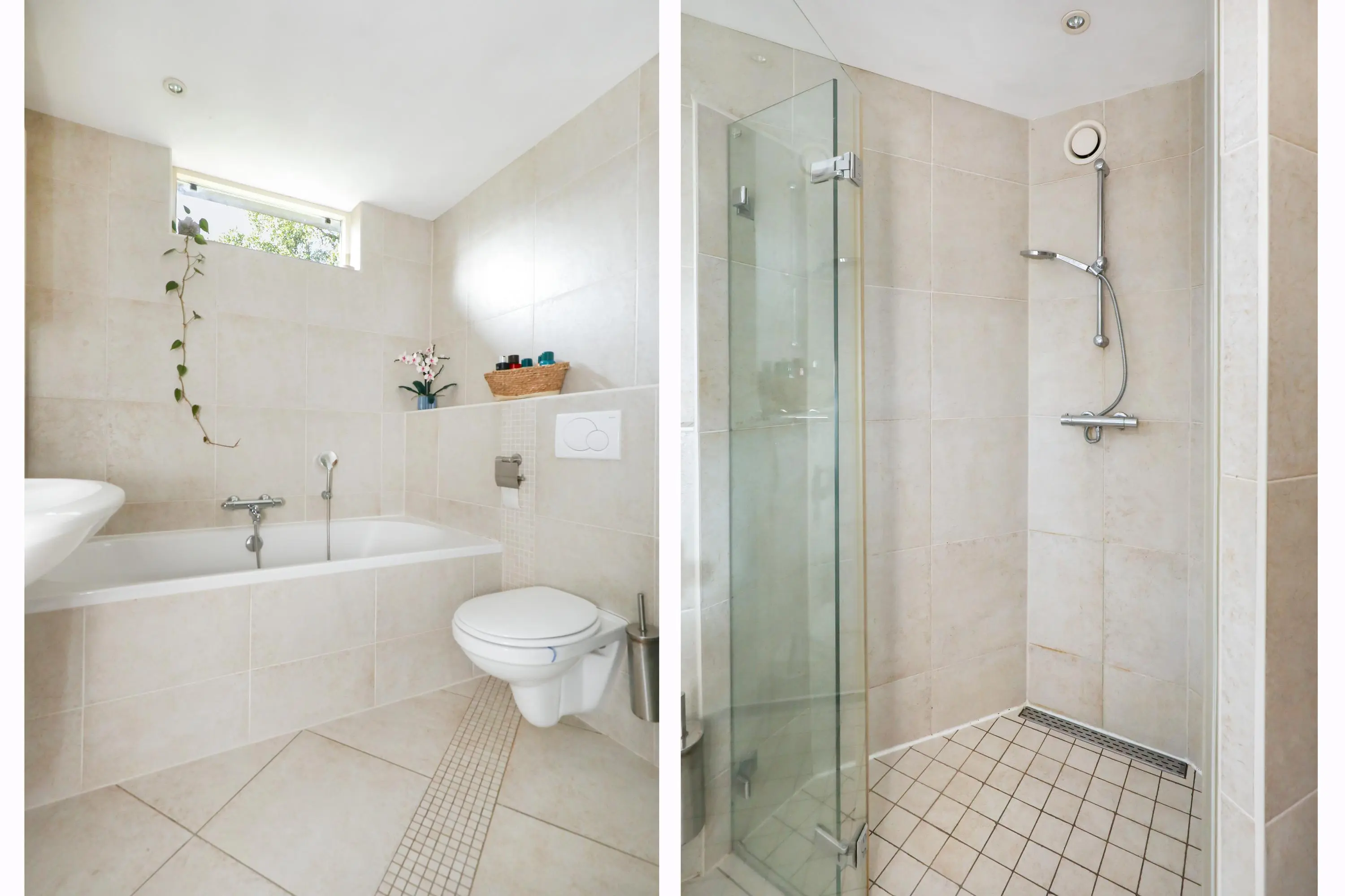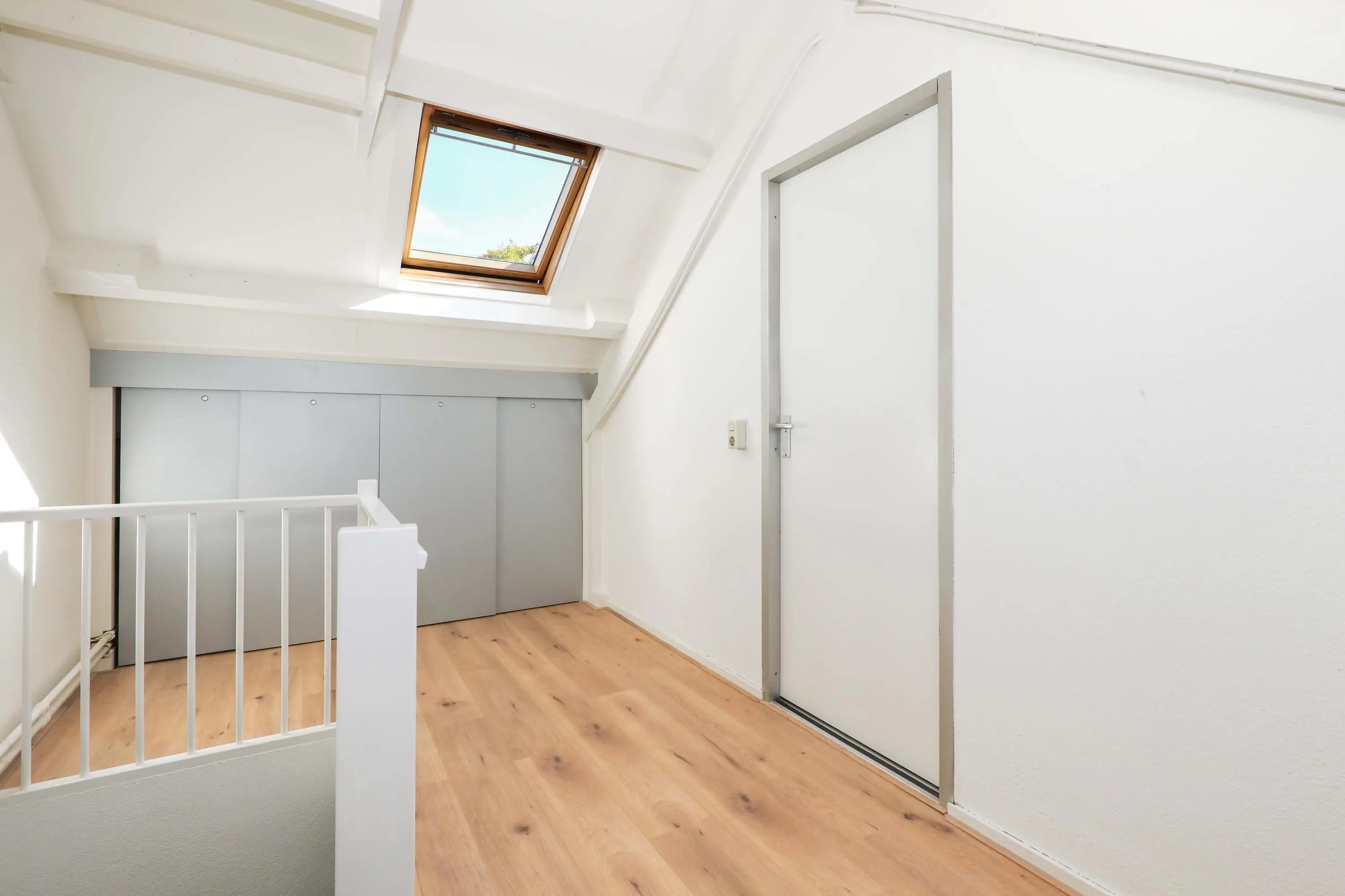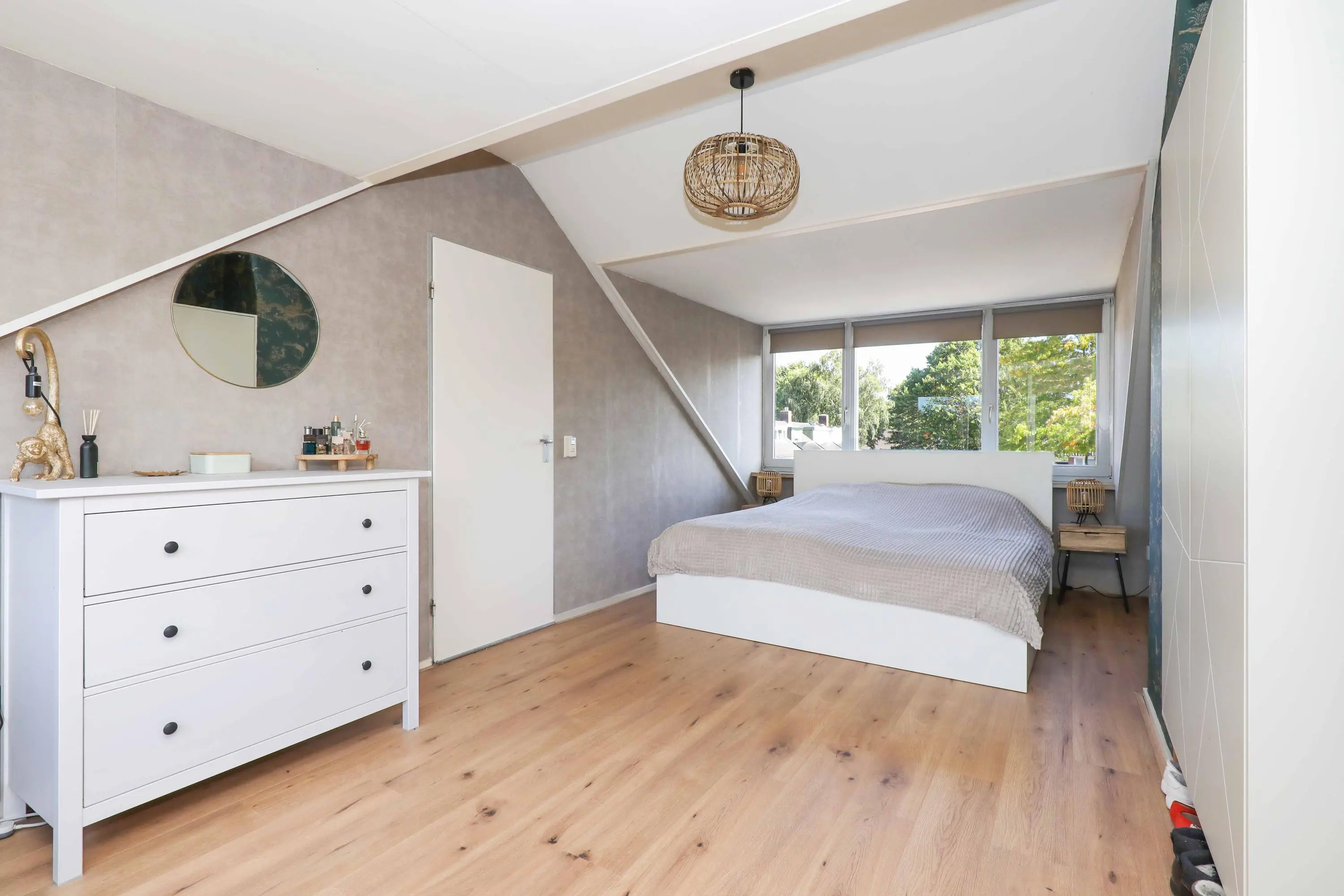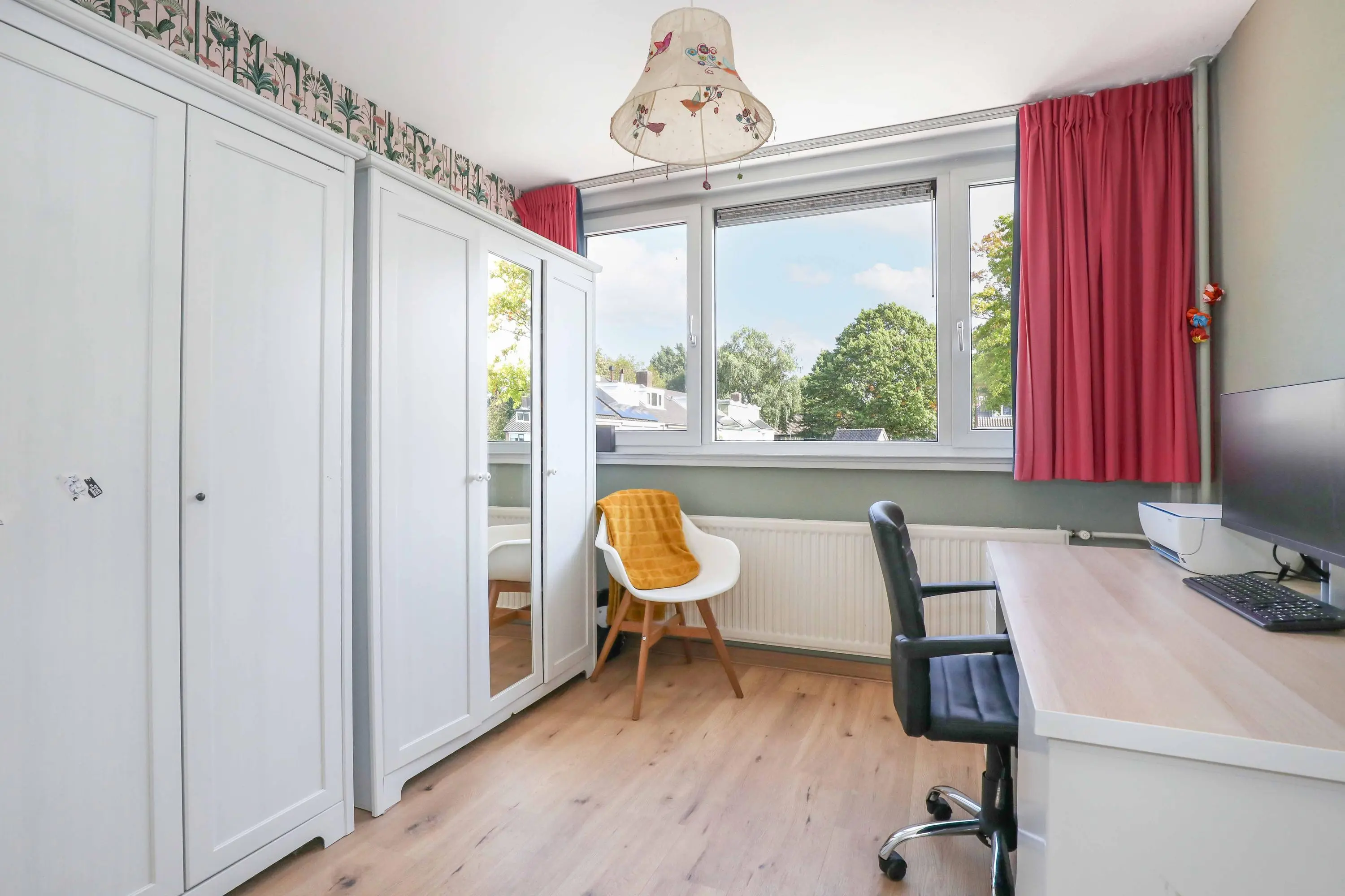 1e verdieping: overloop met trapopgang naar 2e verdieping, twee in grootte variërende, ruime slaapkamers aan de achterzijde en een royale 3e slaapkamer aan de voorzijde met praktische vaste kast. De badkamer is in 2013 gerenoveerd en voorzien van een inloopdouche, ligbad, wastafelmeubel, toilet, handdoekradiator en comfortabele elektrische vloerverwarming.