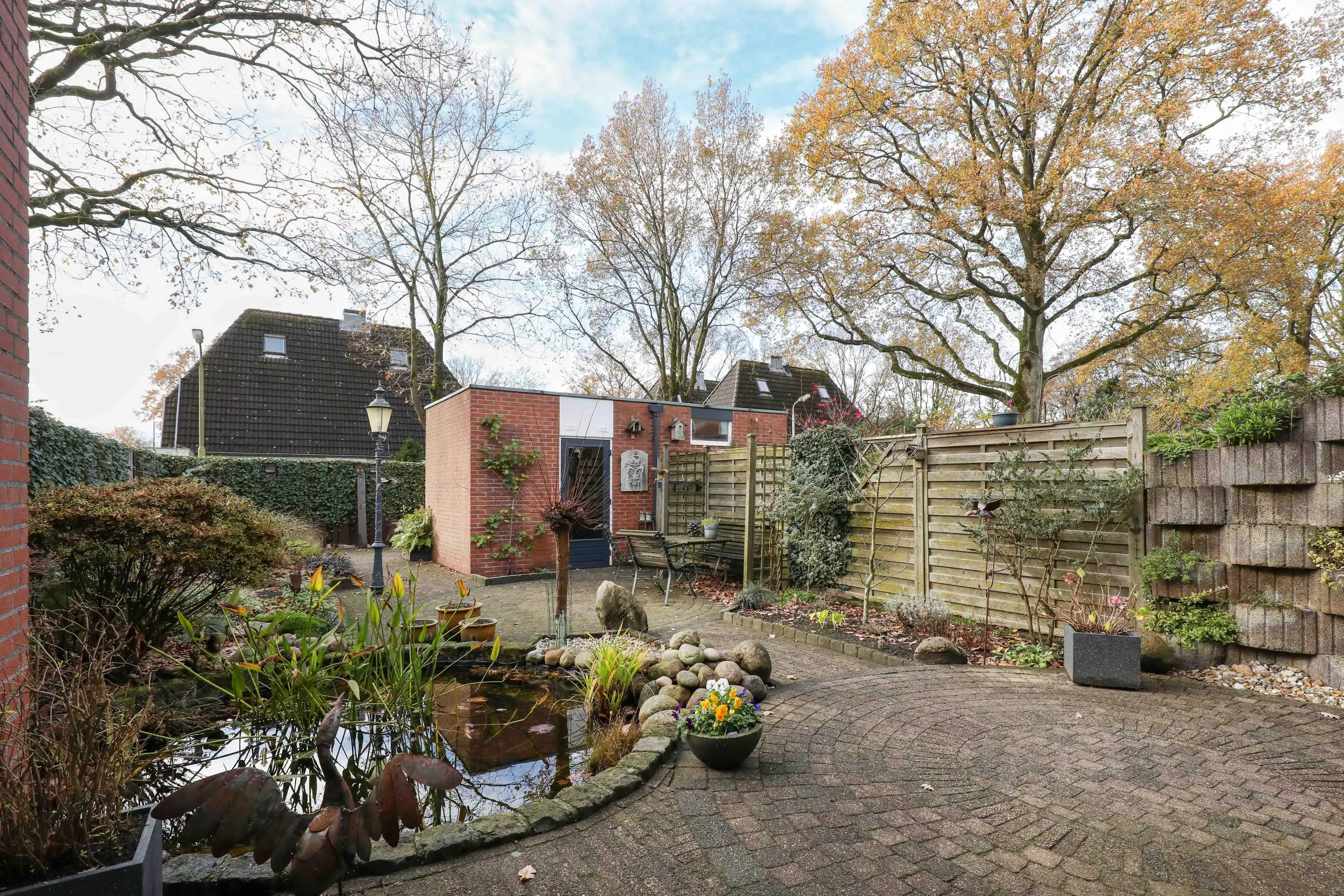 Tuin en aangebouwde stenen berging: de achtertuin is ruim 16 meter diep, gelegen op het zuidwesten en onderhoudsvriendelijk ingericht. Er zijn meerdere terrassen aanwezig, een sfeervolle vijver en meerdere borders met groene beplanting. Tevens is er een (elektrisch bedienbaar) zonnescherm geplaatst zodat het ook op zomerse dagen prettig vertoeven is in de schaduw. In de achtertuin is een stenen berging aanwezig voor het stallen van o.a. fietsen en tuingereedschap. De tuin is via een achterom te bereiken.