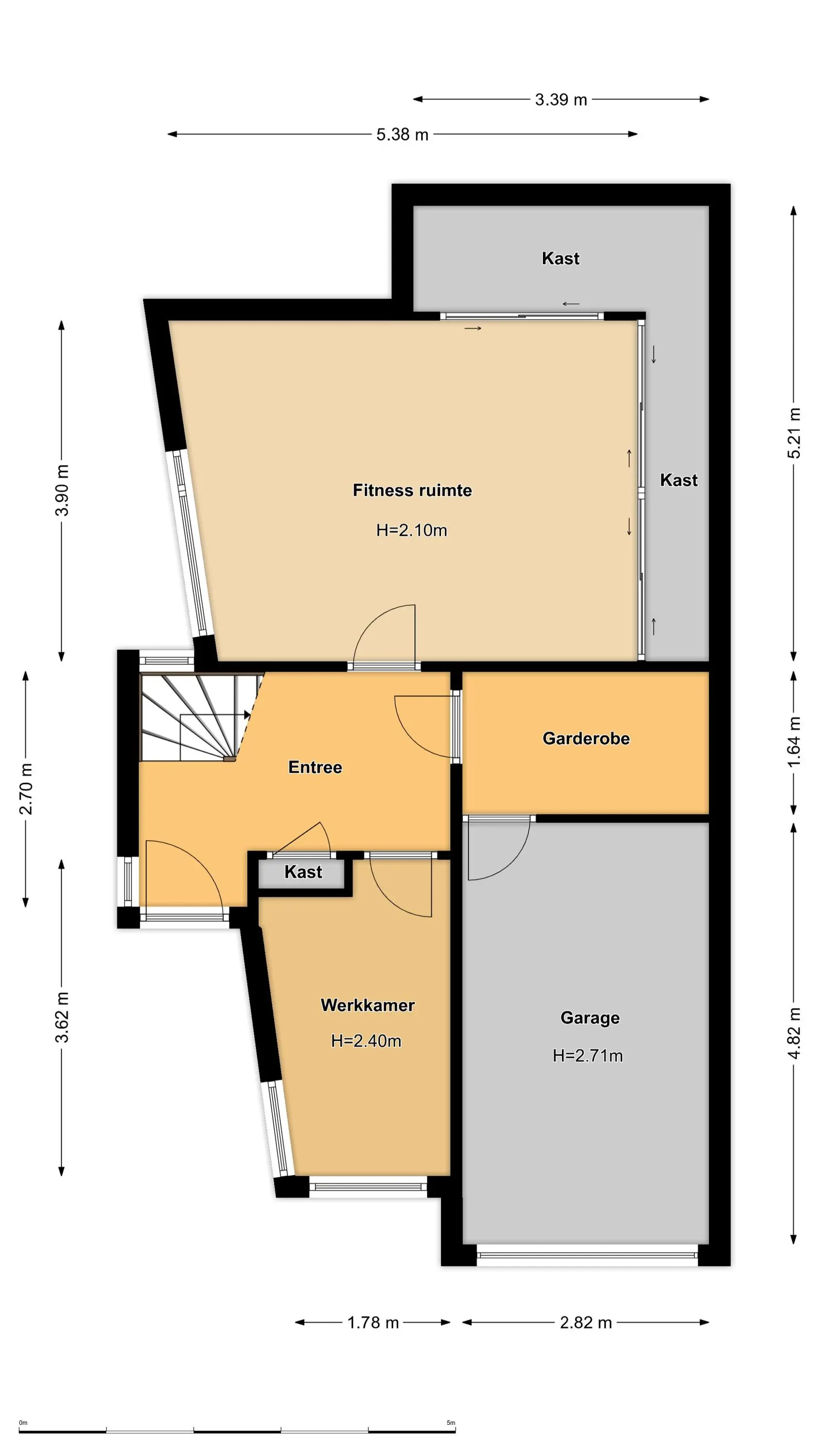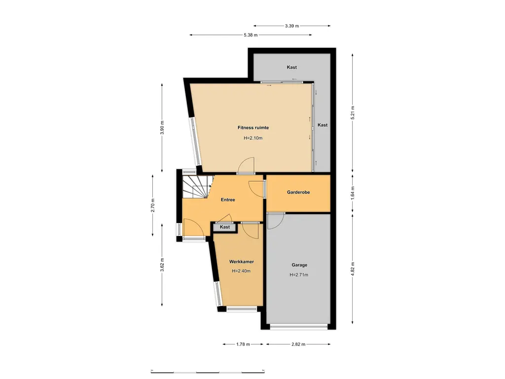Begane grond: ruime en lichte entree/hal met meterkast, trapopgang naar 1e verdieping, toegang tot de werkkamer aan de voorzijde en toegang tot een multifunctionele ruimte aan de achterzijde welke momenteel in gebruik is als fitnessruimte en beschikt over een grote praktische kastenwand. Vanuit de hal is er tevens toegang tot een tweede hal met ruimte voor garderobe en vanuit hier bereik je ook de inpandige garage aan de voorzijde van de woning.