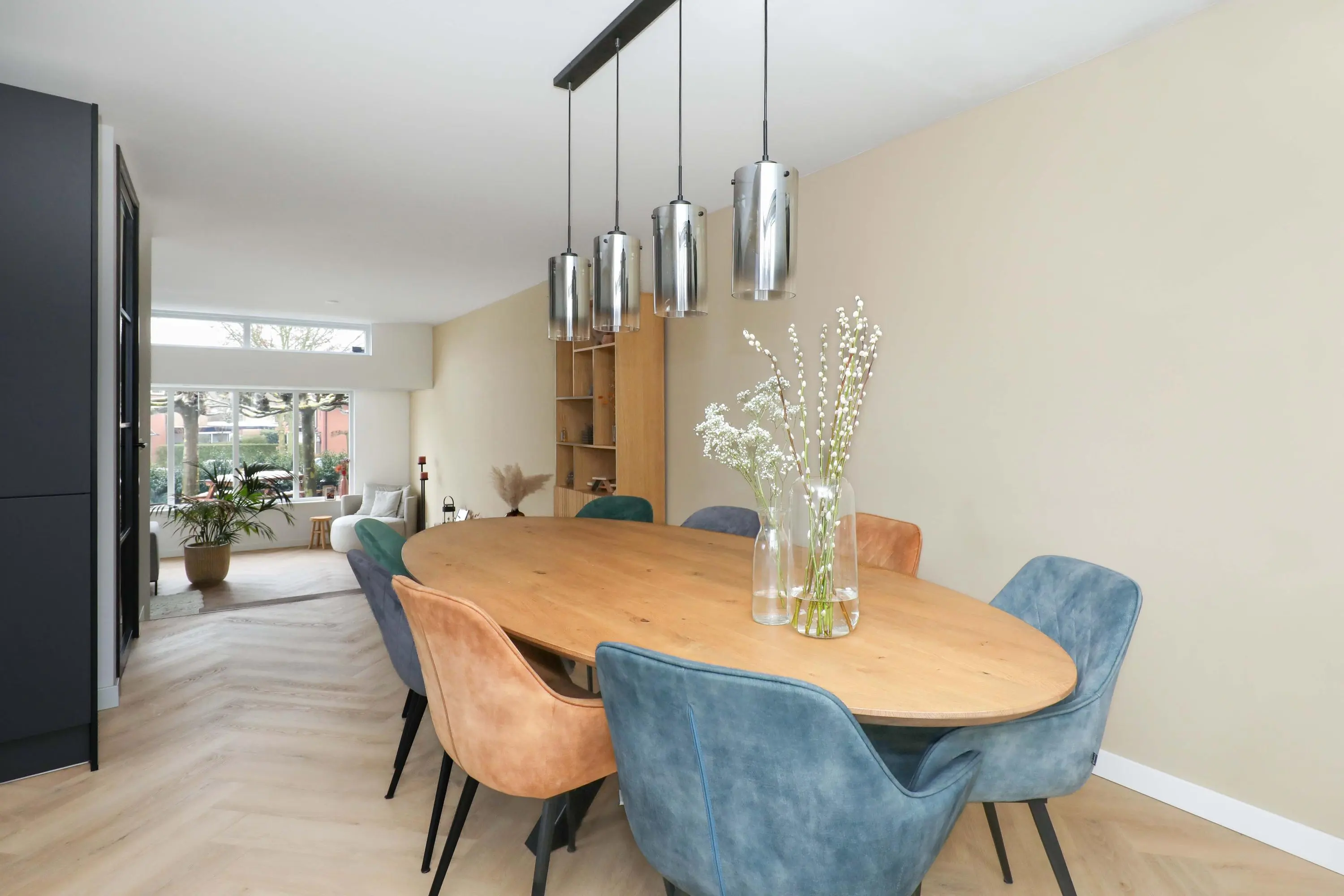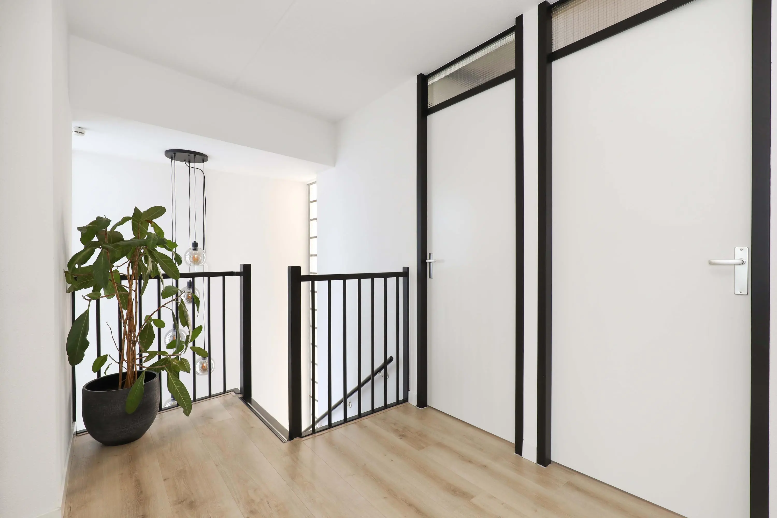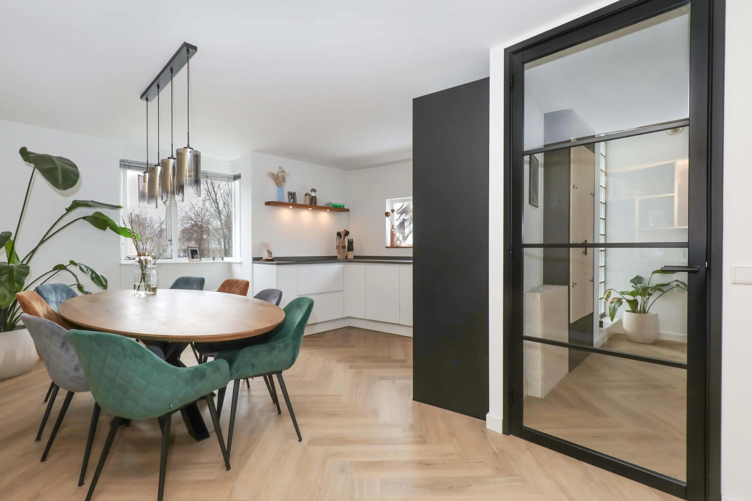 1e verdieping (woonverdieping): overloop met trapopgang naar 2e verdieping, toiletruimte, vaste kast en toegang tot de leefruimte. Aan de voorzijde bevindt zich de eetkamer met moderne open keuken in zwart/witte kleurstelling (2022) v.v. inductiekookplaat met geïntrigeerde afzuiging, koelkast, vriezer, combi-oven, vaatwasser en spoelbak met Quooker. Aan de achterzijde bevindt zich de woonkamer welke een split-level halve verdieping lager ligt dan de keuken en eetkamer wat zorgt voor een speels effect. De woonkamer is ruim, licht en geeft een prachtig vrij uitzicht over het groen. Vanuit de woonkamer is er toegang tot de achtertuin welke gelegen is op dezelfde etage. Deze gehele verdieping is v.v. comfortabele vloerverwarming en een fraaie visgraat PVC-vloer.