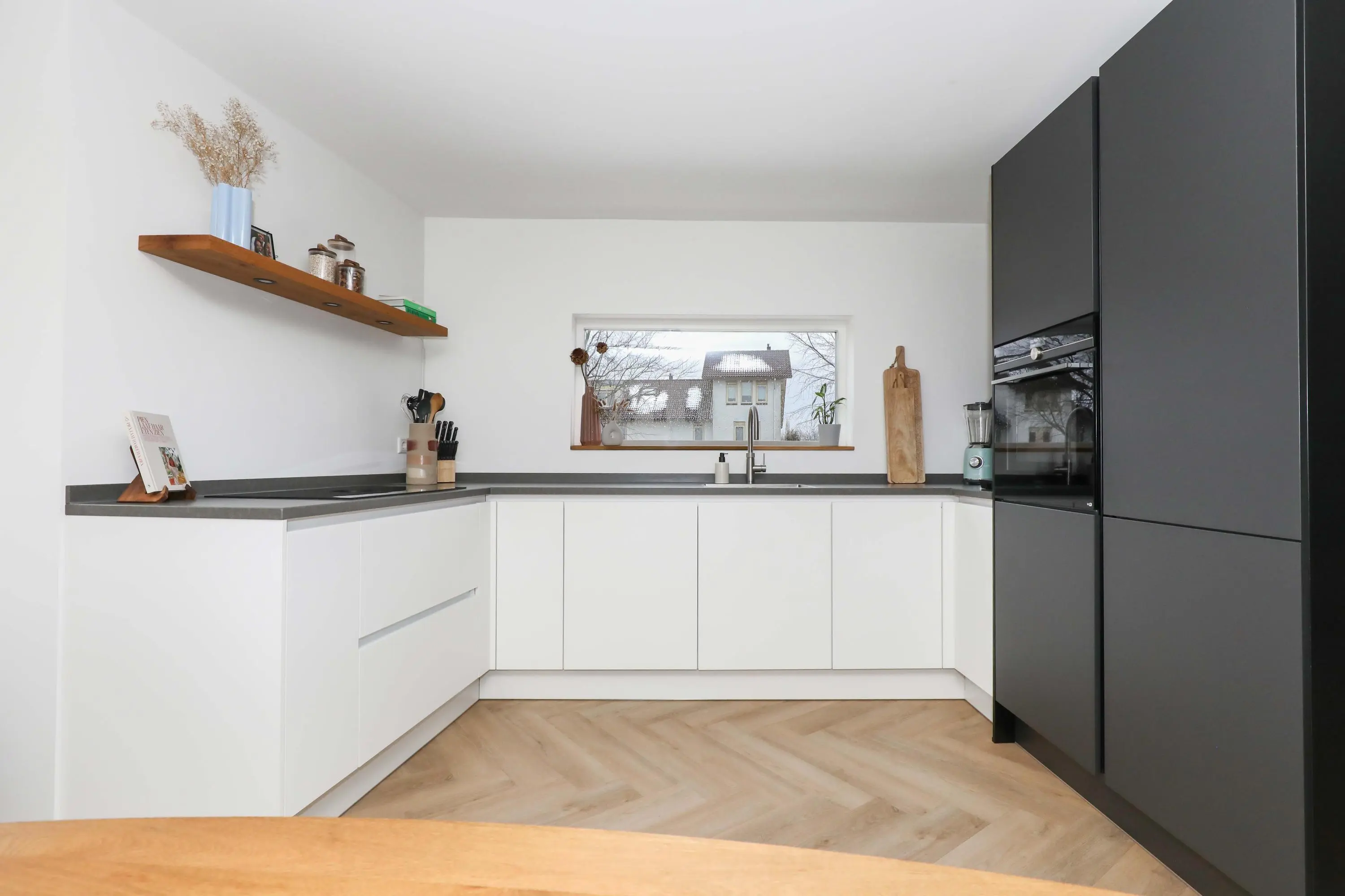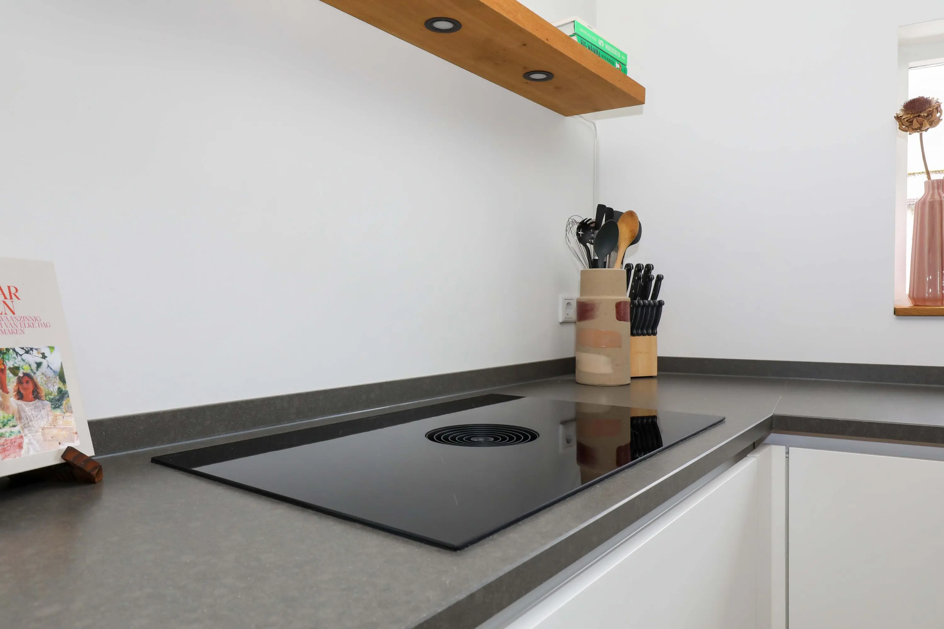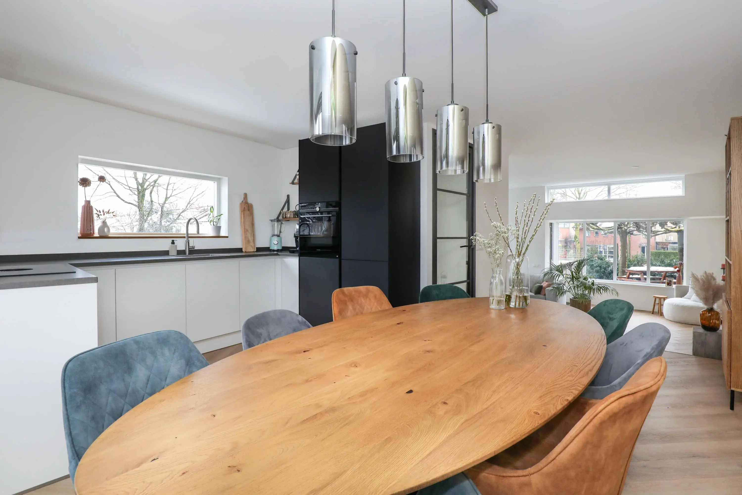 1e verdieping (woonverdieping): overloop met trapopgang naar 2e verdieping, toiletruimte, vaste kast en toegang tot de leefruimte. Aan de voorzijde bevindt zich de eetkamer met moderne open keuken in zwart/witte kleurstelling (2022) v.v. inductiekookplaat met geïntrigeerde afzuiging, koelkast, vriezer, combi-oven, vaatwasser en spoelbak met Quooker. Aan de achterzijde bevindt zich de woonkamer welke een split-level halve verdieping lager ligt dan de keuken en eetkamer wat zorgt voor een speels effect. De woonkamer is ruim, licht en geeft een prachtig vrij uitzicht over het groen. Vanuit de woonkamer is er toegang tot de achtertuin welke gelegen is op dezelfde etage. Deze gehele verdieping is v.v. comfortabele vloerverwarming en een fraaie visgraat PVC-vloer.