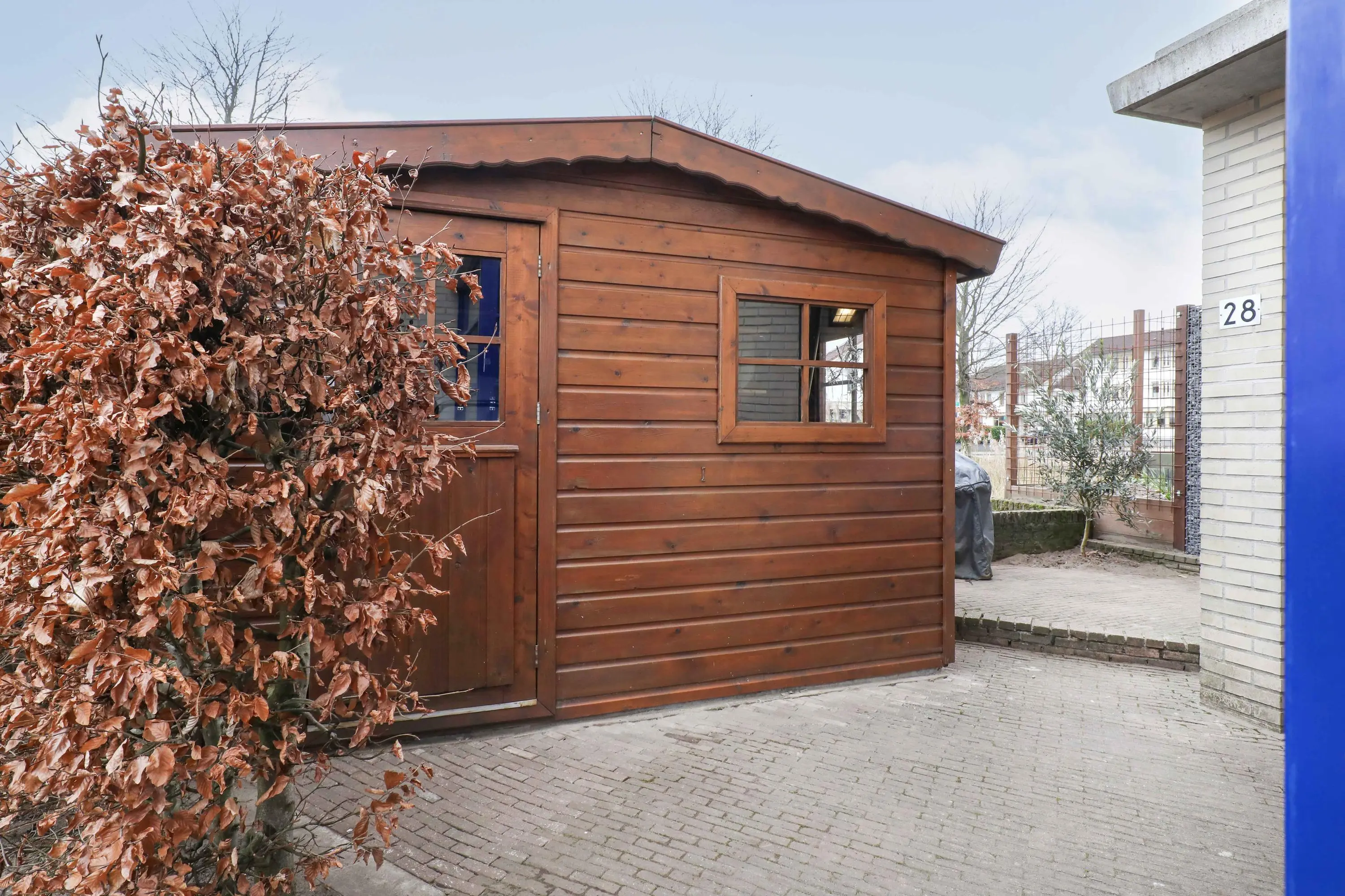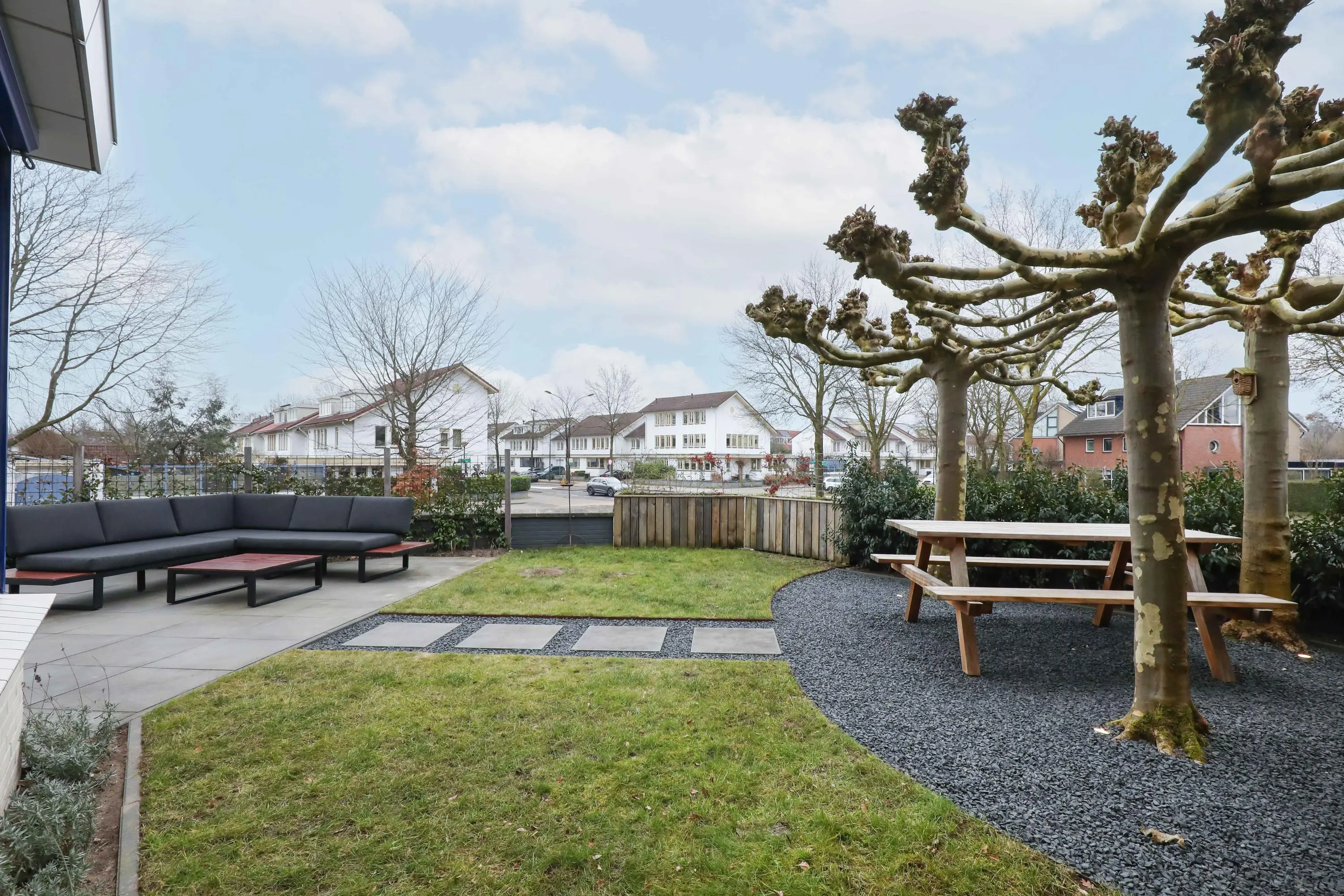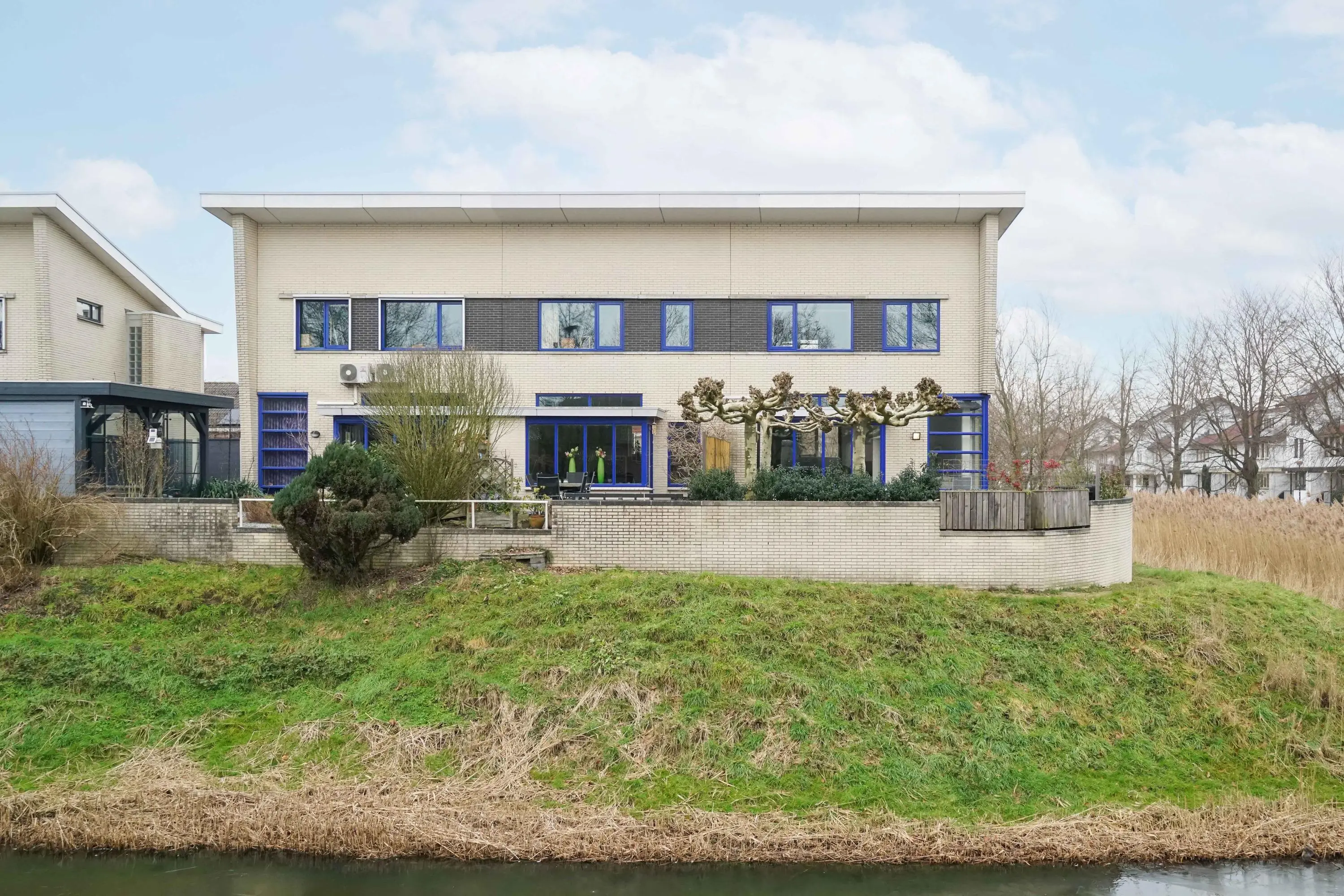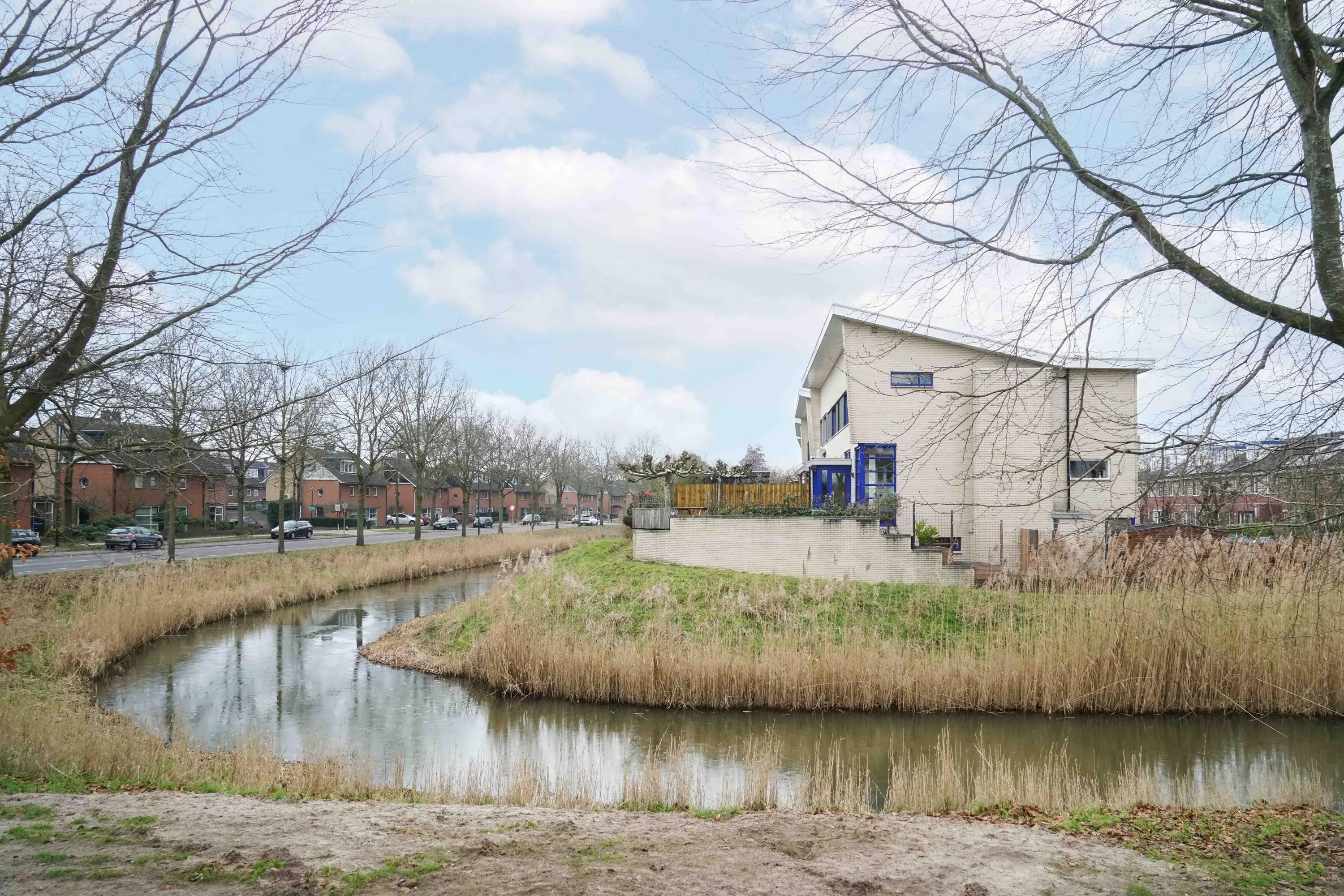 Tuin en berging: de achtertuin is recent opnieuw aangelegd, heeft een prettig vrij uitzicht over het water en het groen en is gelegen op het zuiden. Er zijn meerdere sfeervolle terrassen gecreëerd, er is een gazon aanwezig en borders met groene beplanting. De voortuin is weer gelegen op de begane grond en hier bevindt zich een vrijstaande houten berging voor het stallen van o.a. tuingereedschap en voor de garage is er ruimte voor het parkeren van een auto op eigen terrein.