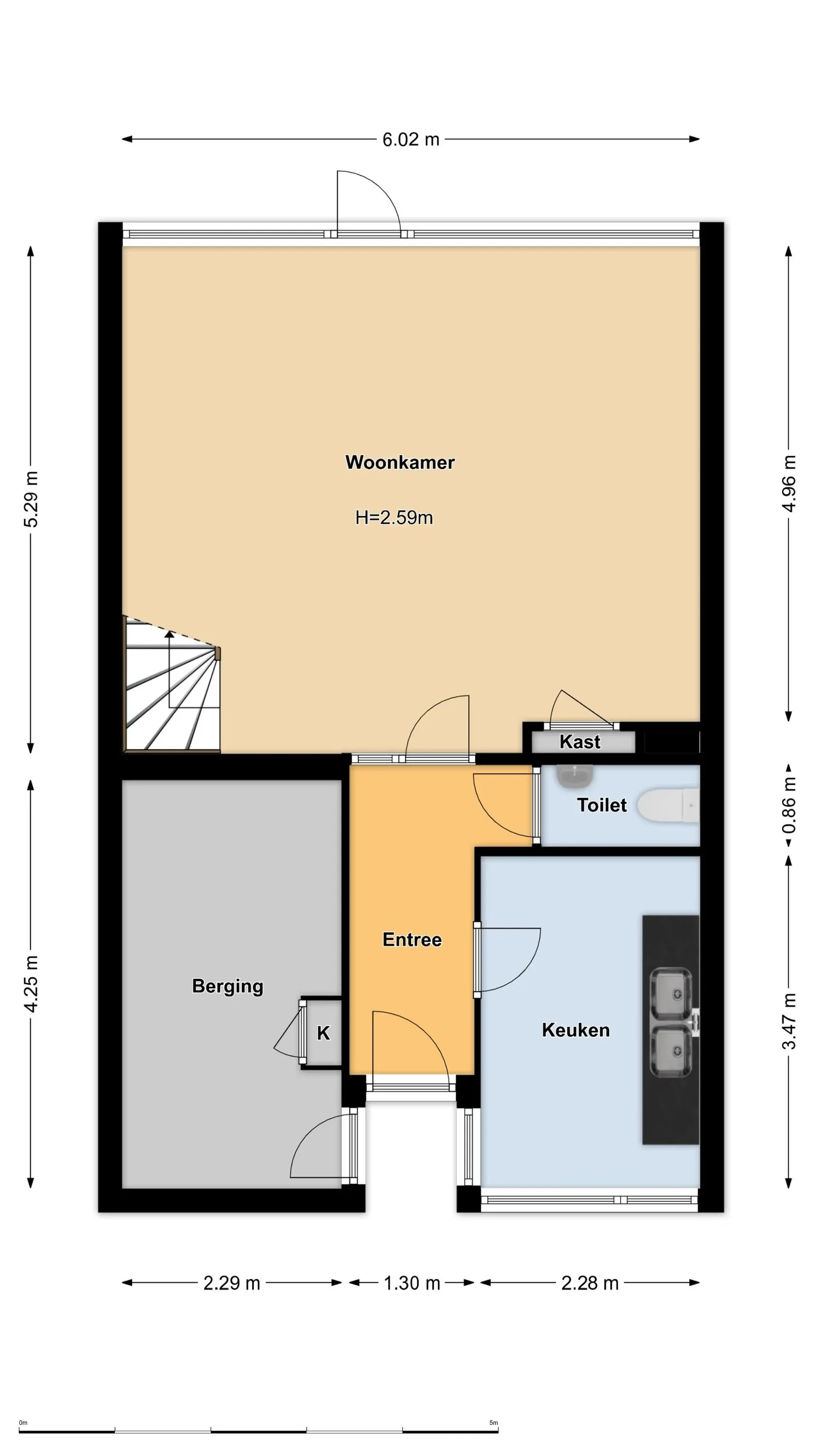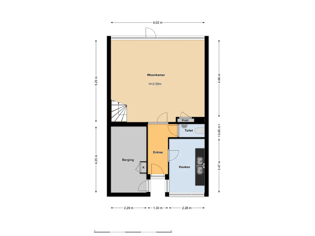 Begane grond: entree/hal met deur naar dichte keuken aan de voorzijde, toiletruimte en toegang tot de ruime en lichte woonkamer aan de achterzijde waar zich de trapopgang naar de verdieping bevindt, een praktische vaste kast en de deur naar de achtertuin.