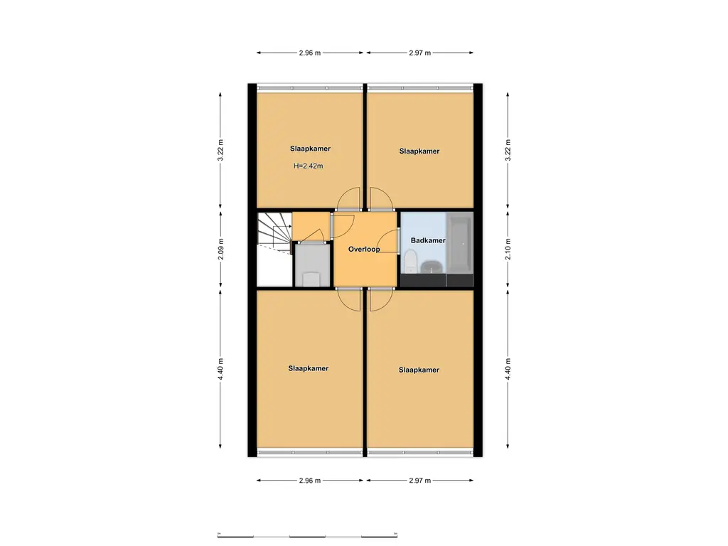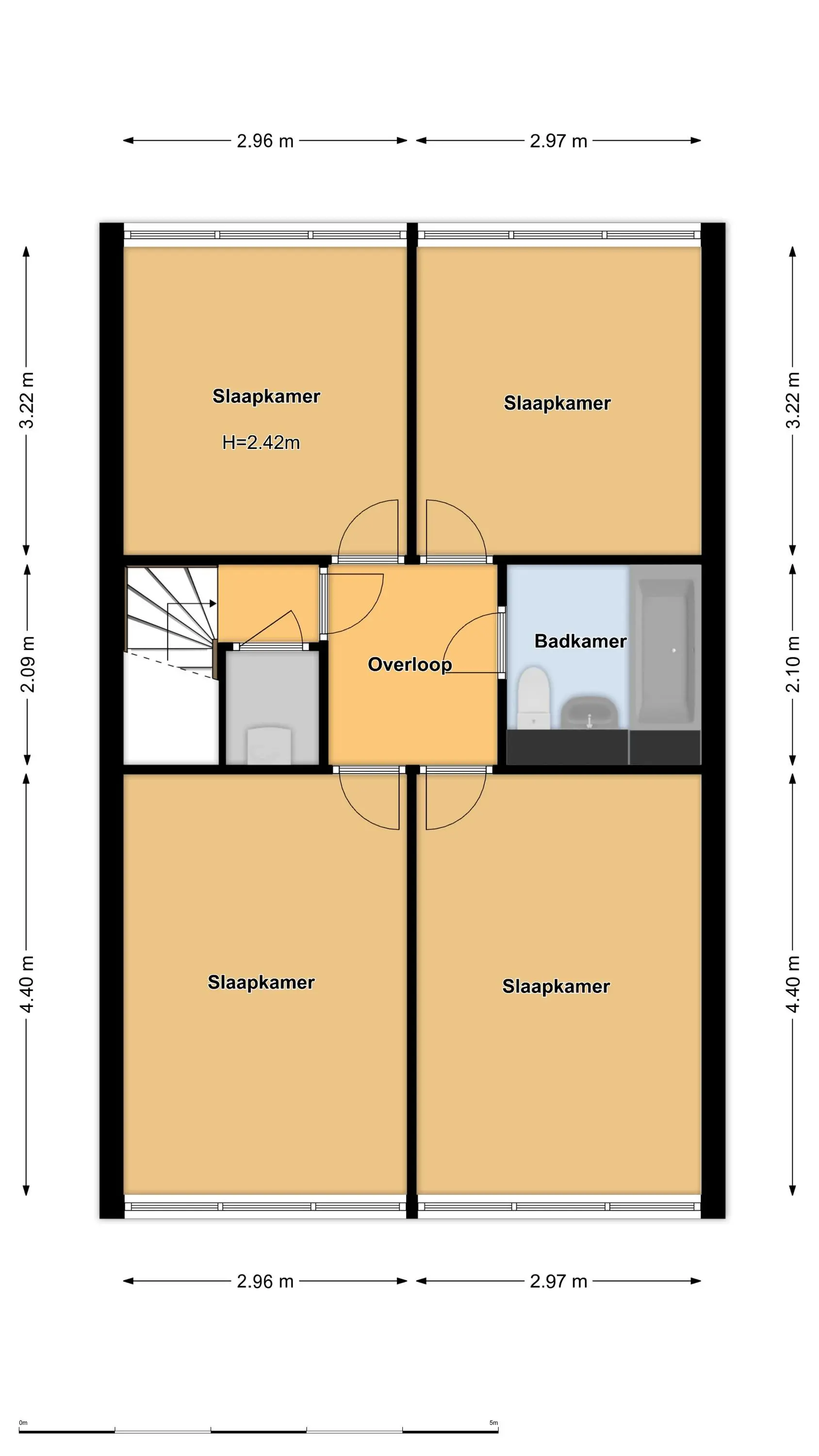 Verdieping: hal met was- en C.V.-ruimte (2011), deur naar overloop met twee royale, vergelijkbare slaapkamers aan de voorzijde en twee eveneens vergelijkbare slaapkamers aan de achterzijde. De badkamer is eenvoudig en beschikt over een ligbad-/douchecombinatie, toilet en wastafel.