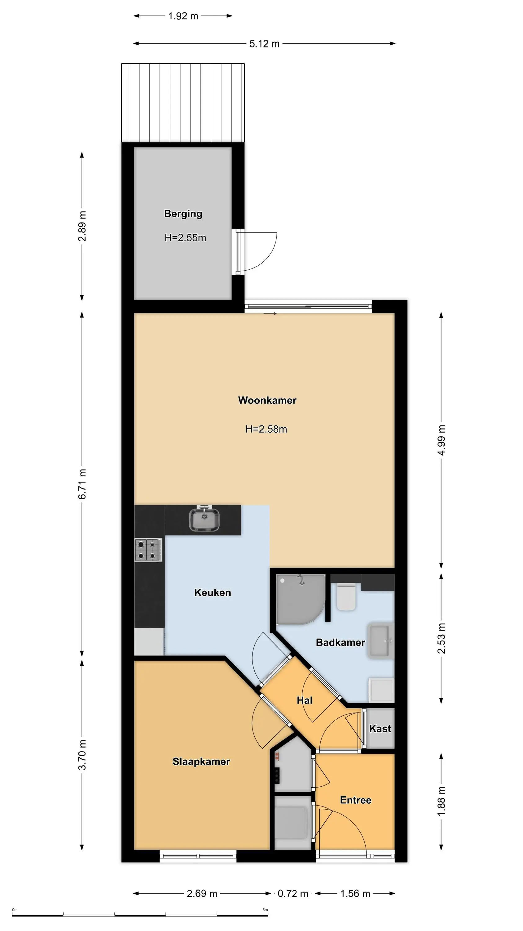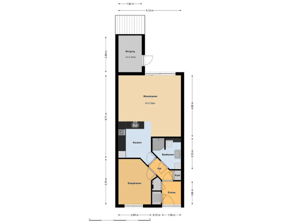 Eigen entree/hal met vaste kast v.v. C.V.-installatie, meterkast en deur naar 2e hal. Hier bevindt zich een praktische vaste kast, toegang tot de slaapkamer aan de voorzijde, toegang tot de nette badkamer welke beschikt over een inloopdouche, wastafelmeubel, toilet en wasmachine-aansluiting. Aan de achterzijde van het appartement bevindt zich de leefruimte met lichte woonkamer met sfeervolle schuifpui naar de tuin, open keuken in lichte kleurstelling en v.v. koelkast, gaskookplaat, afzuigkap, combi-oven(?) en spoelbak. Vanuit hier is eveneens de tuin te bereiken.