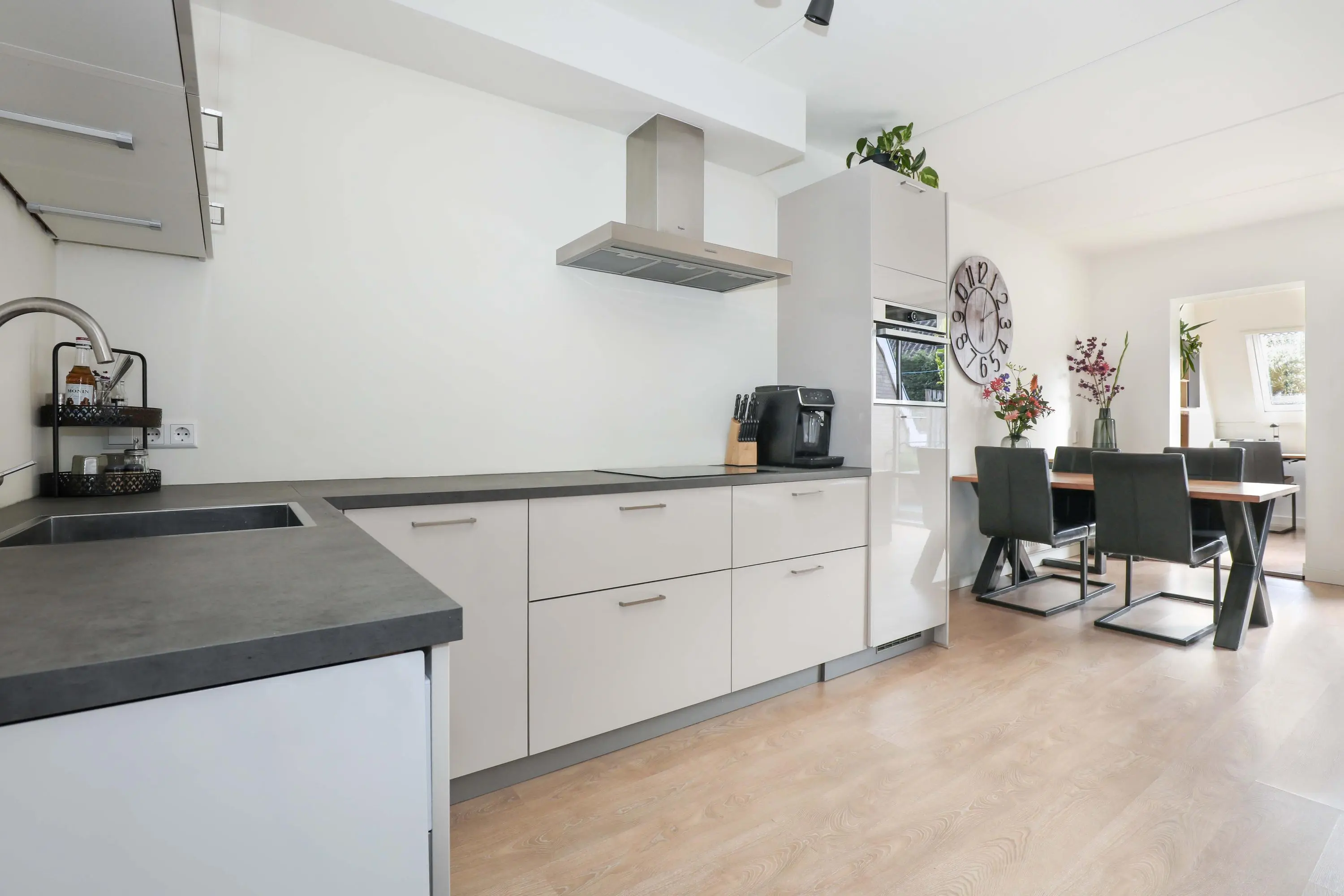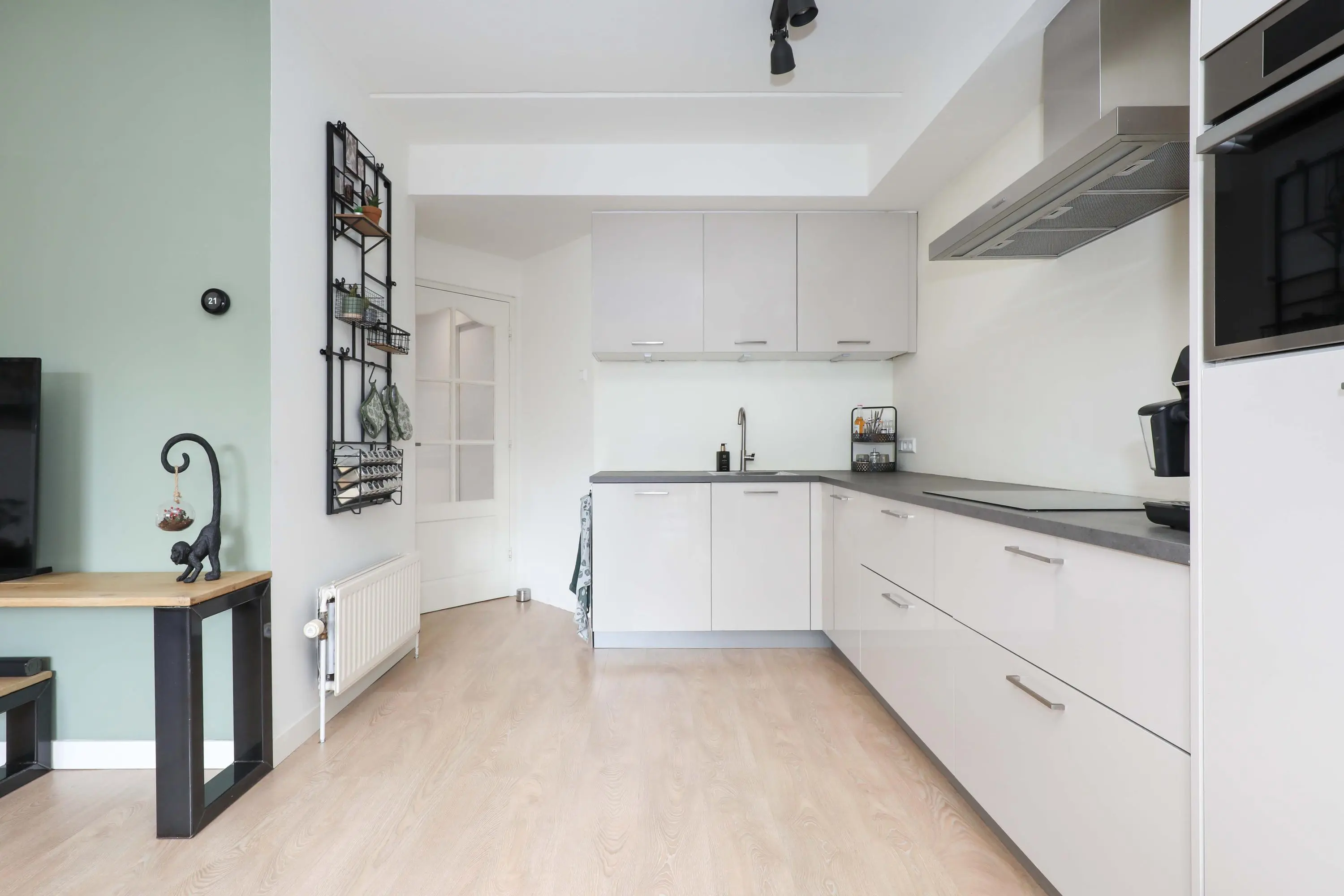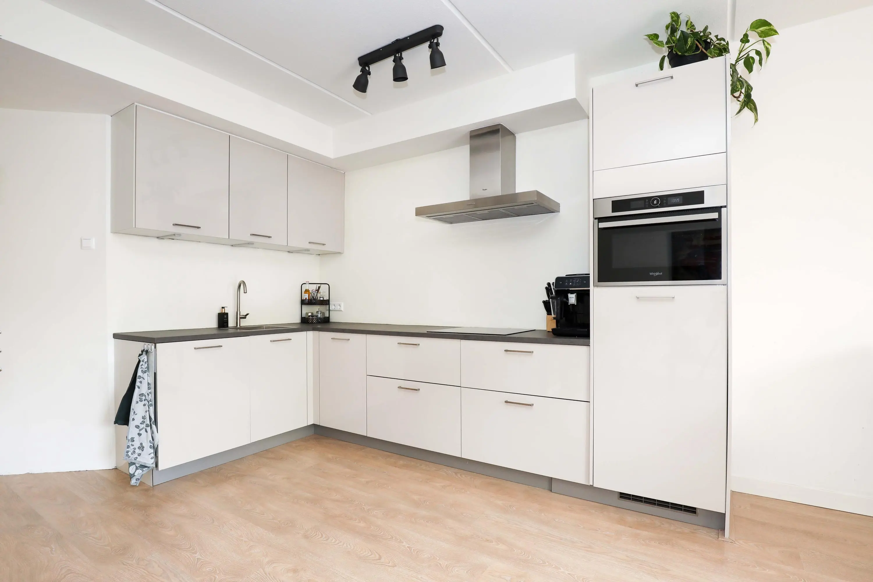 Eigen entree/hal met vaste kast v.v. C.V.-installatie, meterkast en deur naar 2e hal. Hier bevindt zich een vaste kast met wasmachine-/drogeropstelling, toegang tot de slaapkamer aan de voorzijde met praktische vaste kasten, toegang tot de moderne badkamer (2020) welke beschikt over een inloopdouche, wastafelmeubel en toilet. Aan de achterzijde van het appartement bevindt zich de leefruimte met lichte woonkamer met sfeervolle schuifpui naar de tuin, recent vernieuwde open keuken (eind 2022) v.v. koelkast, vaatwasser, inductiekookplaat, afzuigkap, combi-oven en spoelbak. De woonkamer heeft een open verbinding met de extra ruimte aan de achterzijde welke ideaal gebruikt kan worden als werk- of hobbyruimte. Vanuit hier is eveneens de tuin te bereiken.